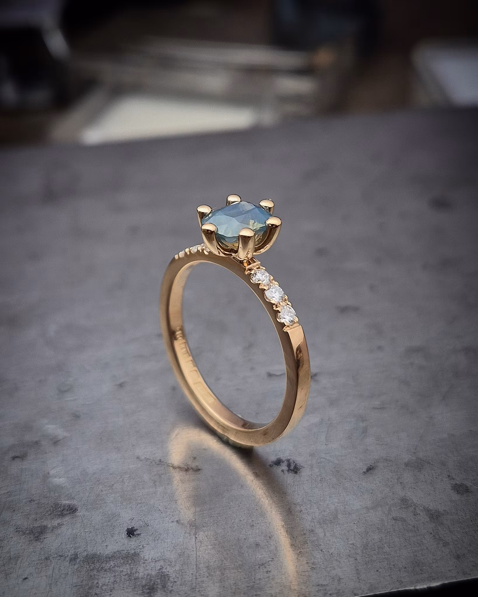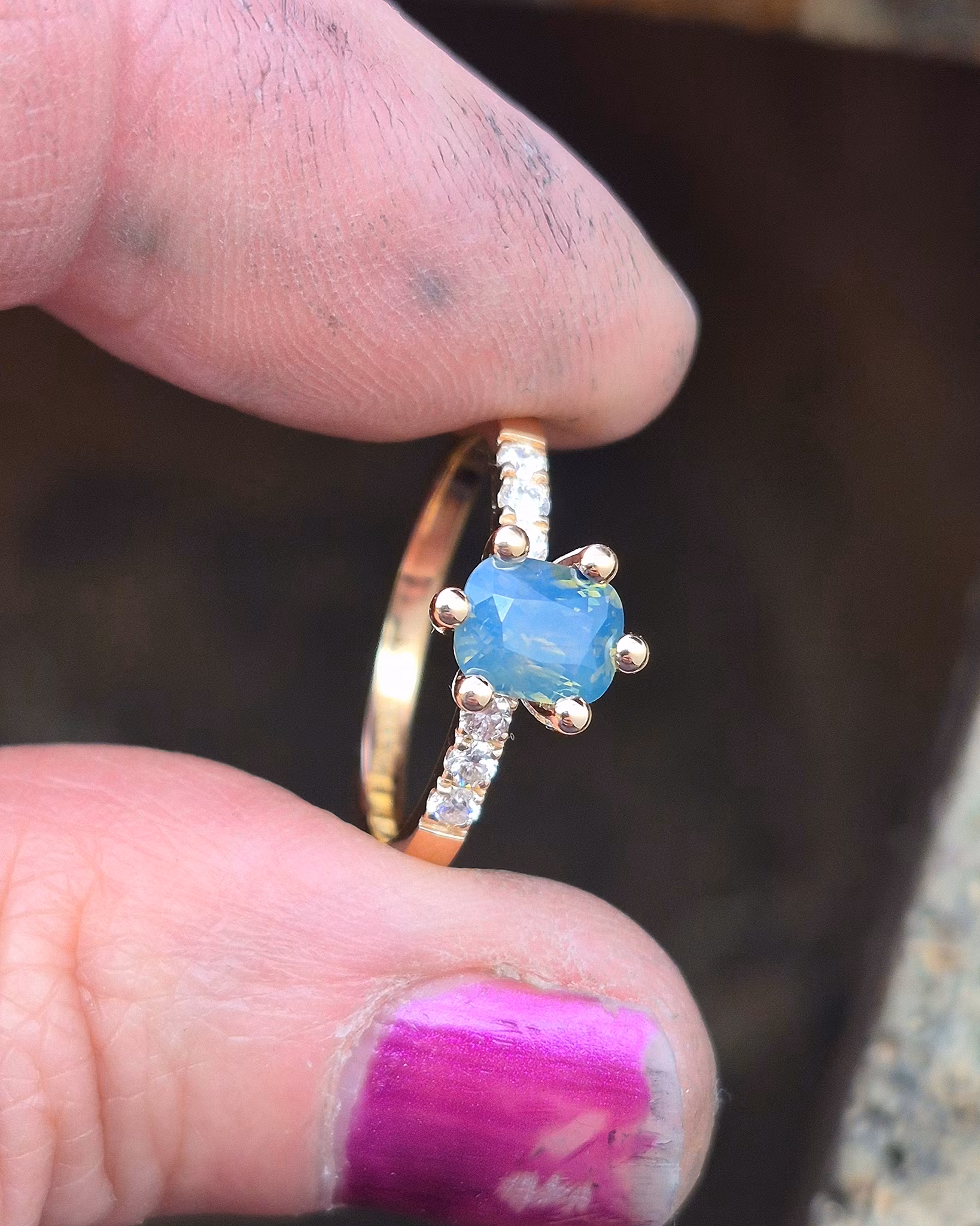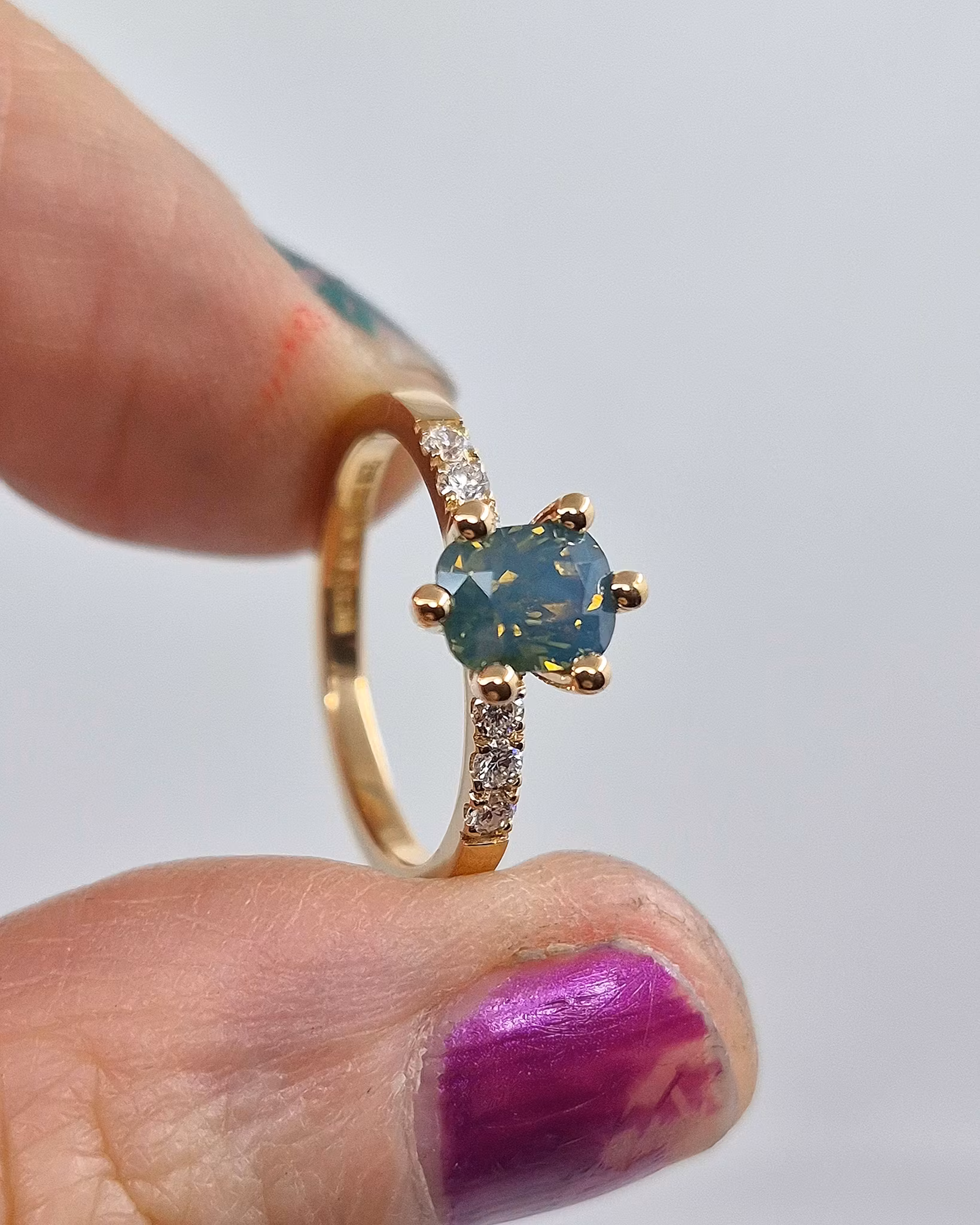 Opalecent Safir i gröna toner. En otrolig ädelsten med ett speciellt intensivt skimmer, som får den att ändra skepnad i olika ljus på ett tämligen dramatiskt sätt. En Safir med tusen ansikten!