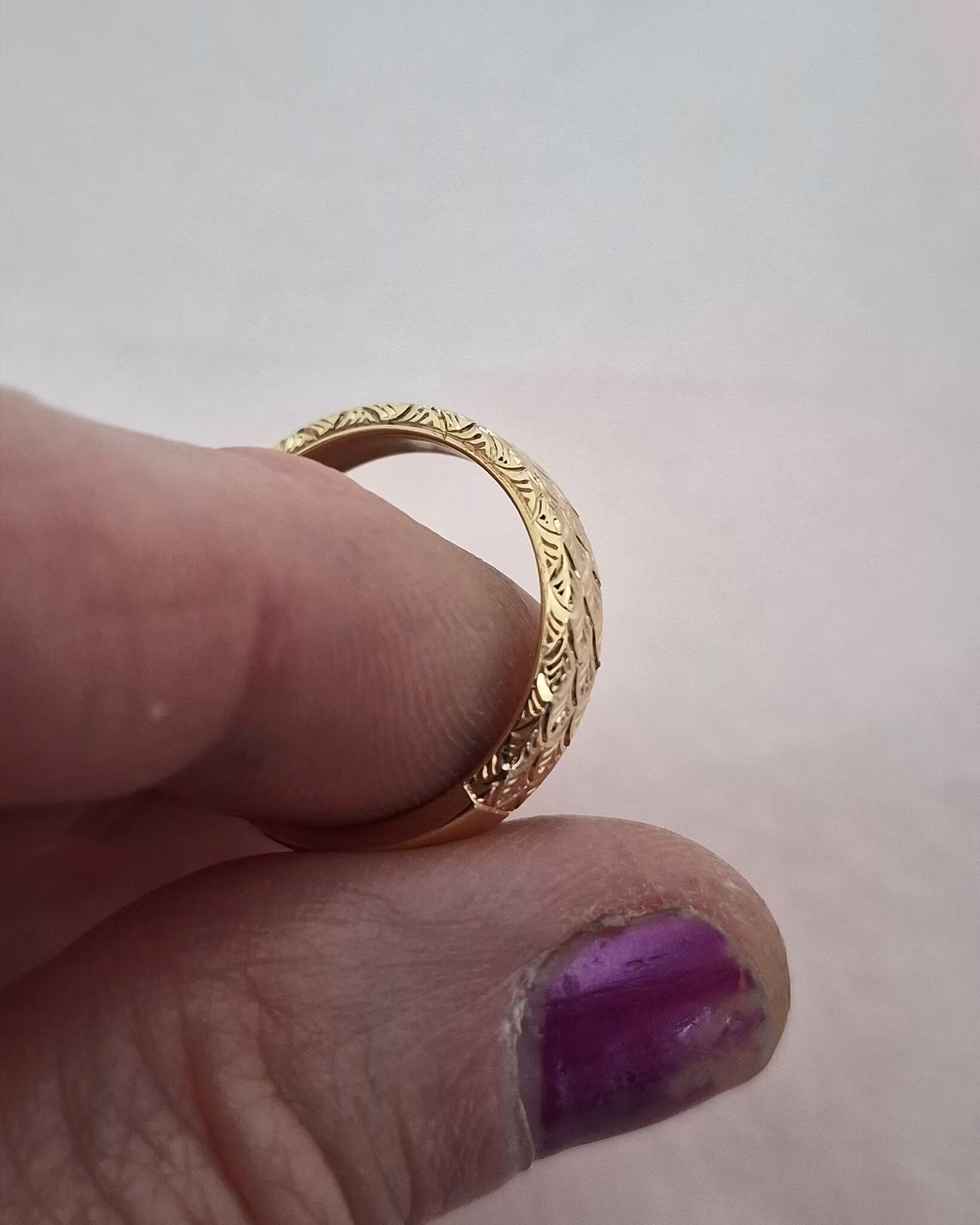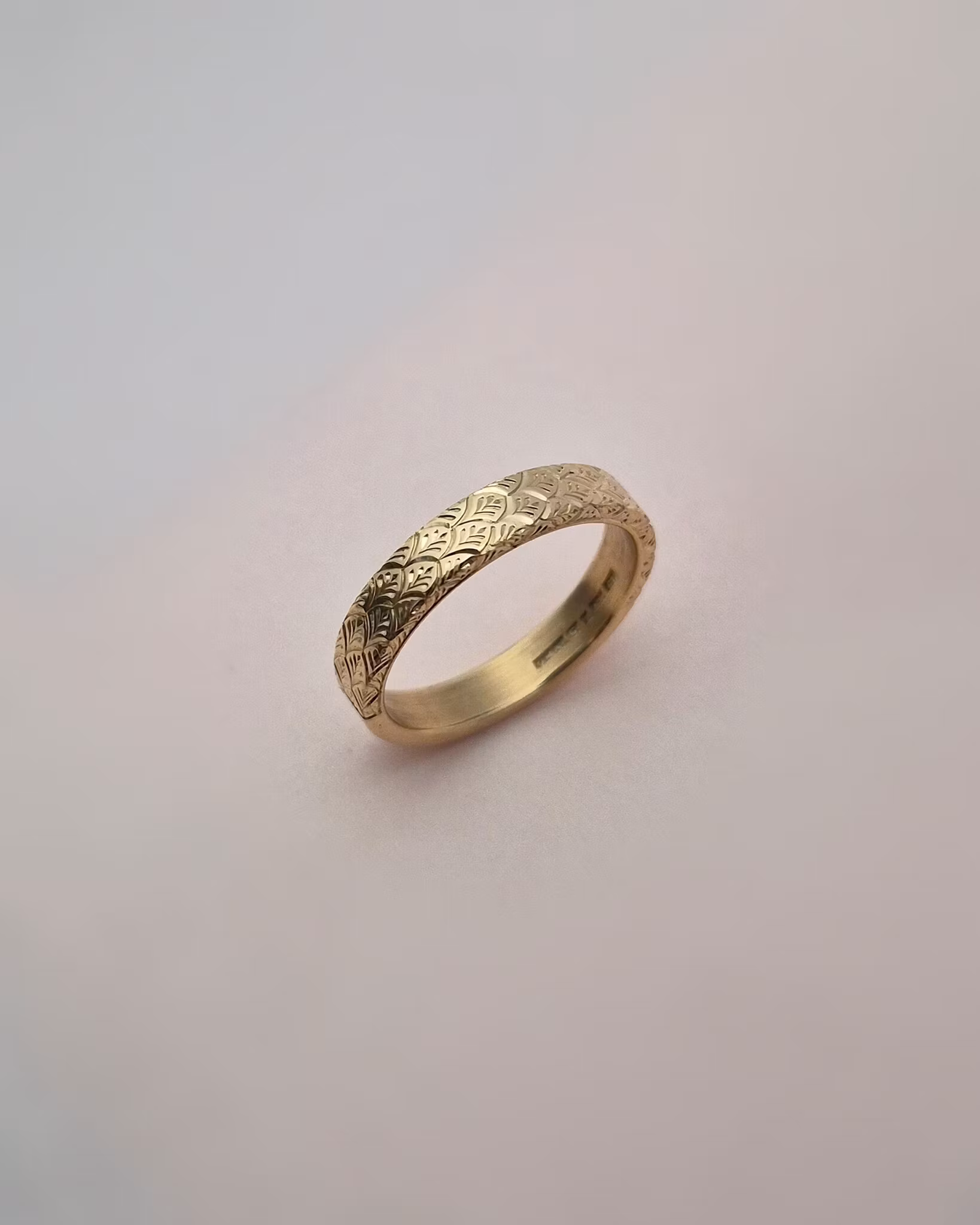 Slät ring i 18K återvunnet guld med mönstergravyr ”peacock” på halva skenan.