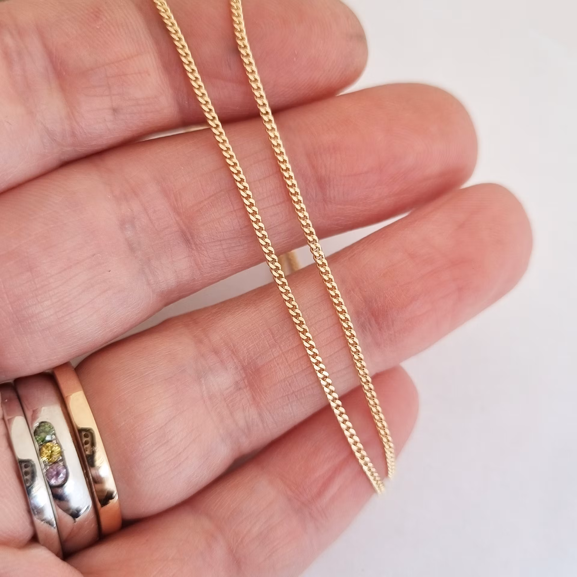 Pansarlänk i 18 K guld. Kedjan mäter ca 1,4 mm och finns tillgänglig i olika längder. Söker du andra längder eller grovlekar än lagerförda, vänligen skicka ett mail till [email protected]. Det mesta går att beställa hem inom två dagar.