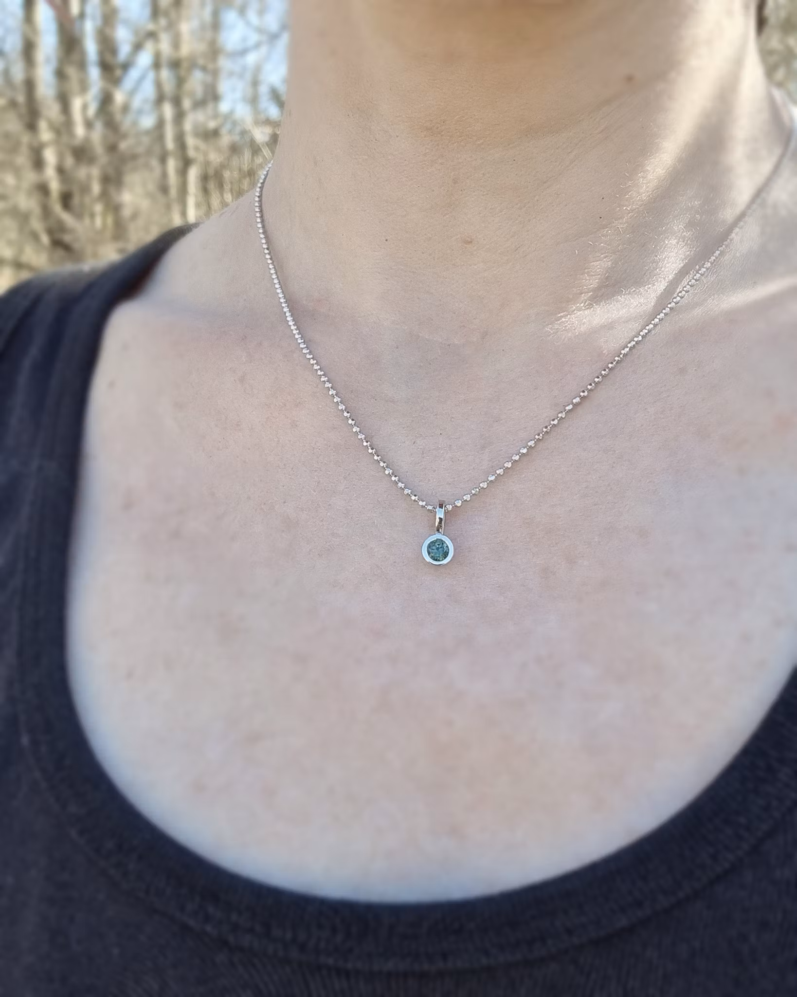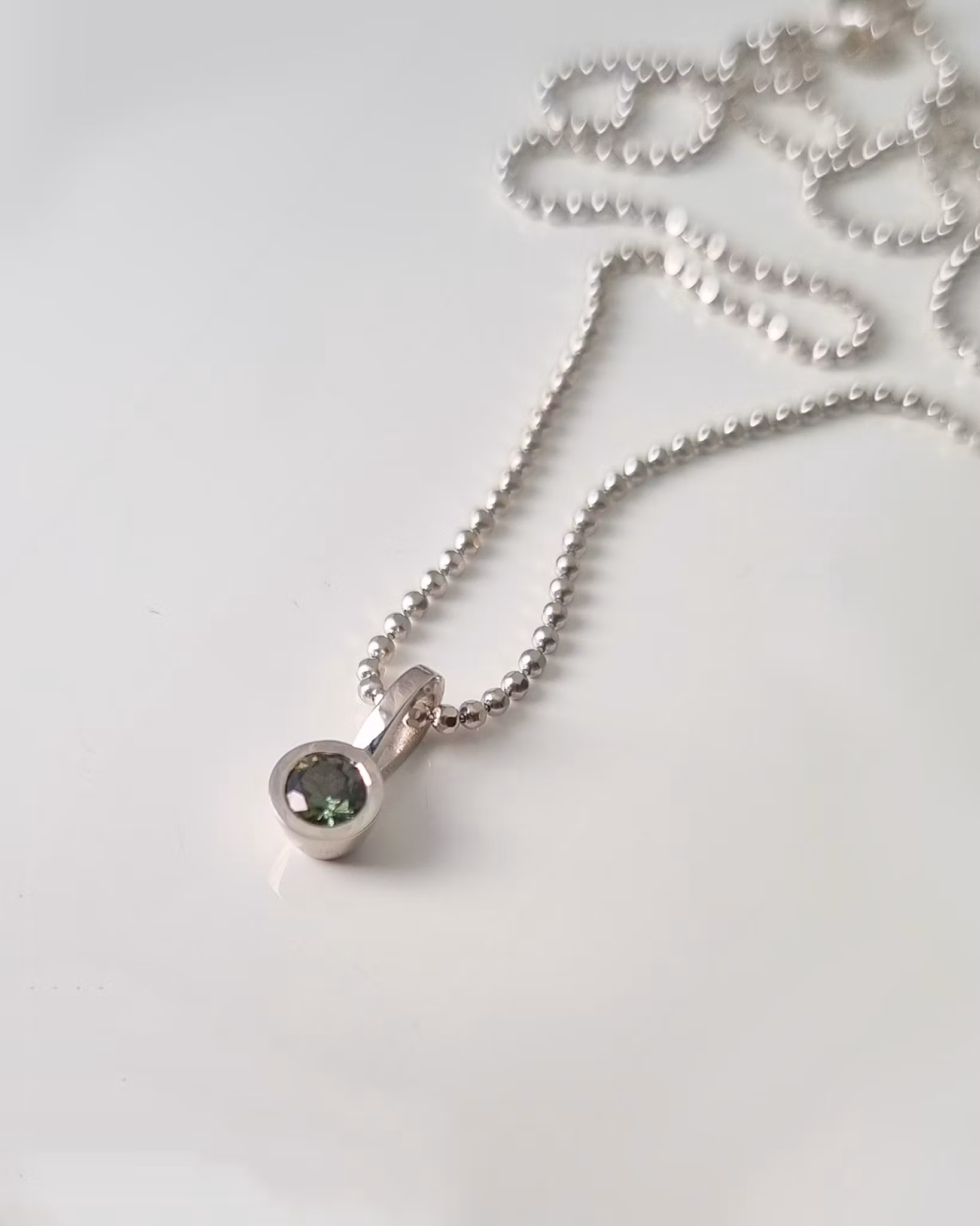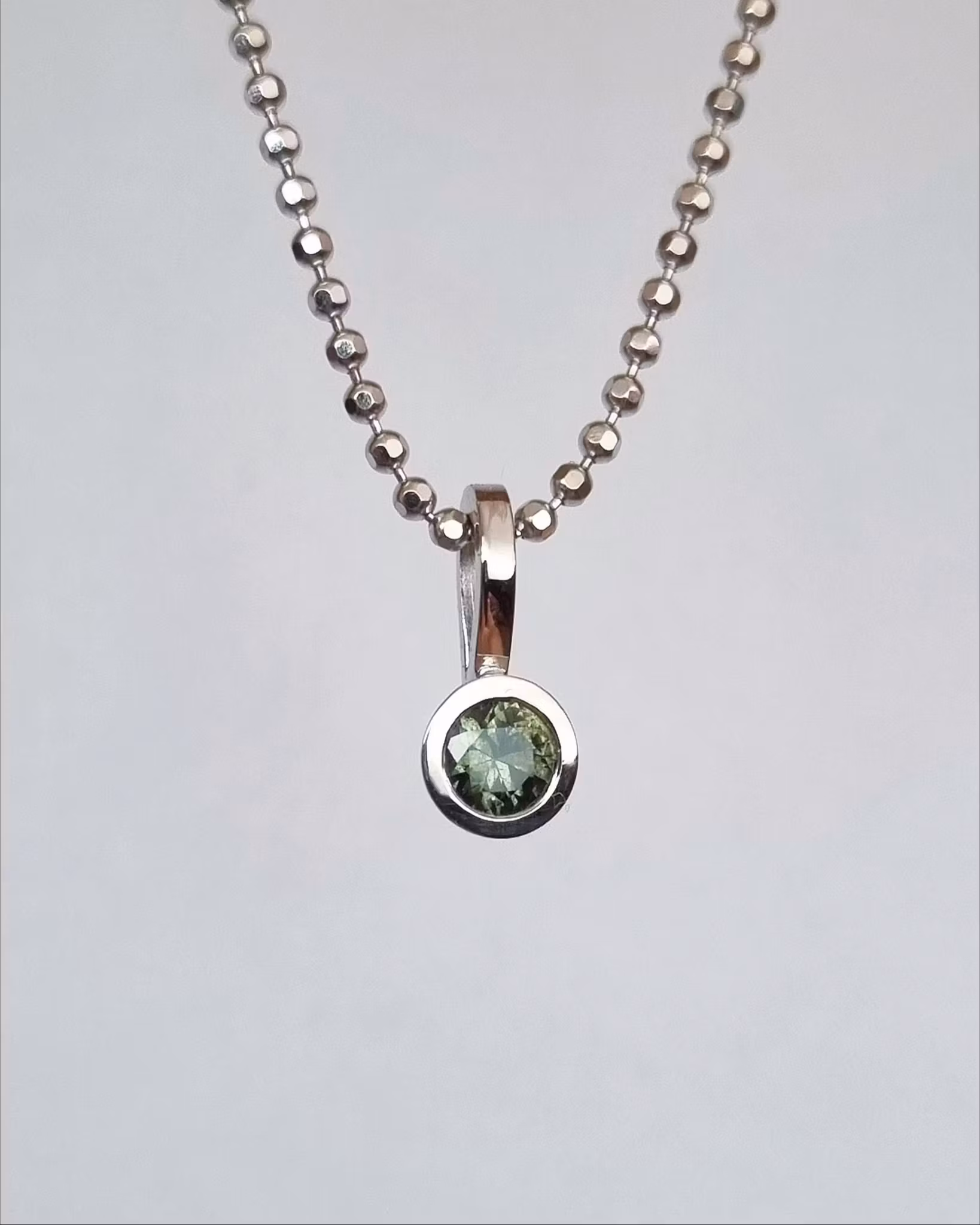 Skogsgrön Safir på 4 mm (0,30 ct) med klassisk slät infattning. Diametern på hänget är ca 5,5 mm. Grön och glittrig, mycket finare irl än på bild!