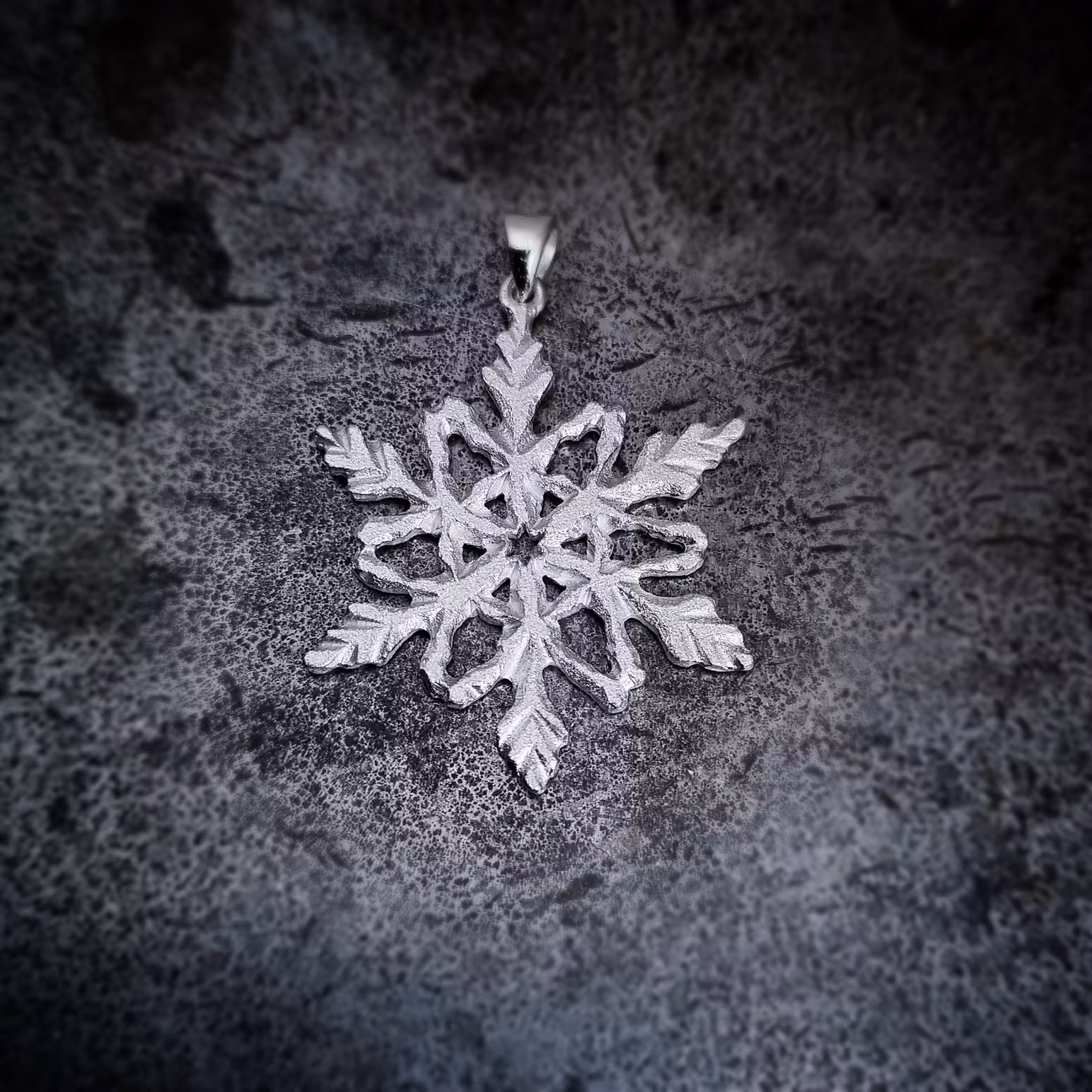 Snökristall i återvunnet sterlingsilver. Detta hängsmycke mäter ca 22 x 27 mm och väger ca 3 gram. Den har en frostig, lätt gnistrande yta.