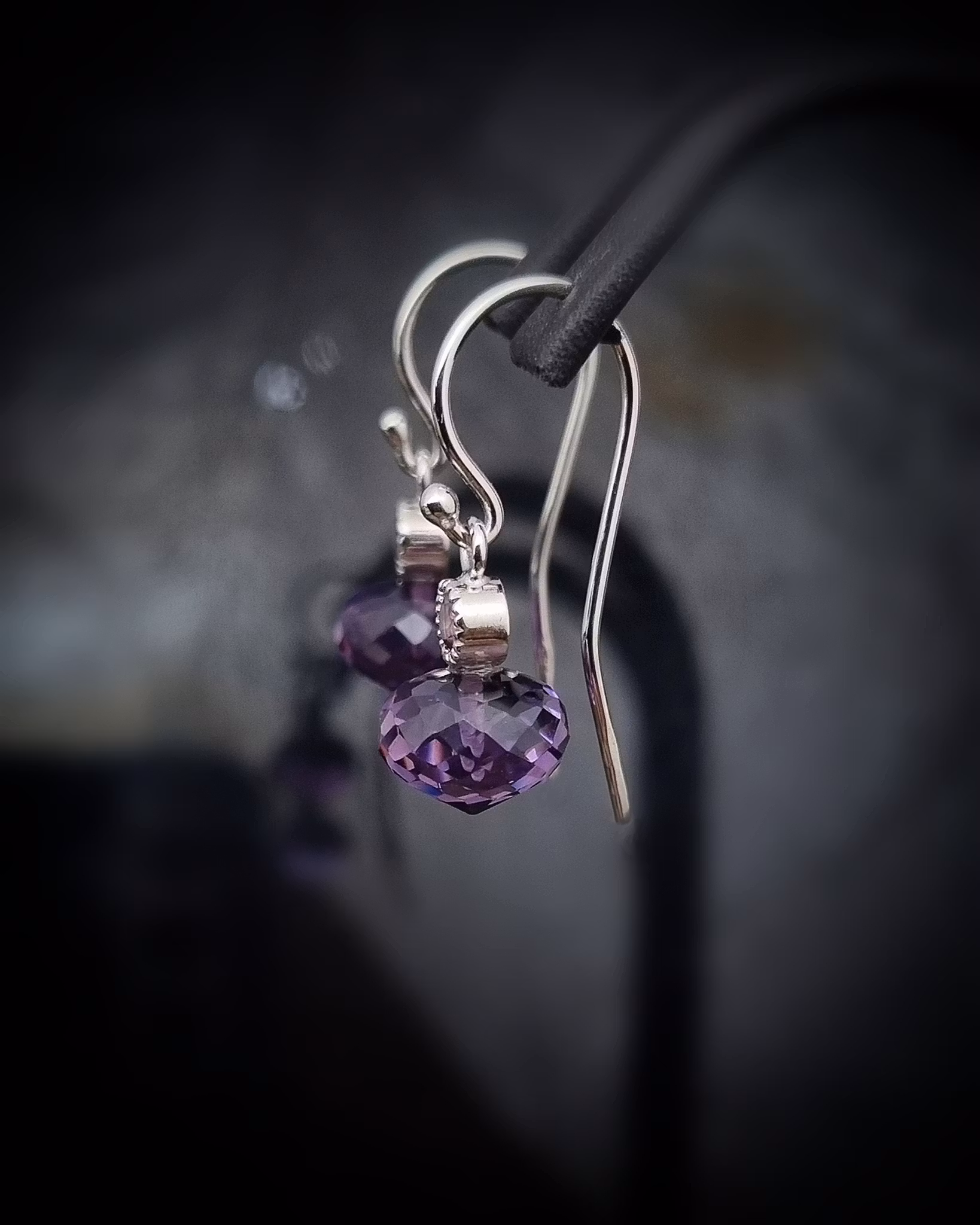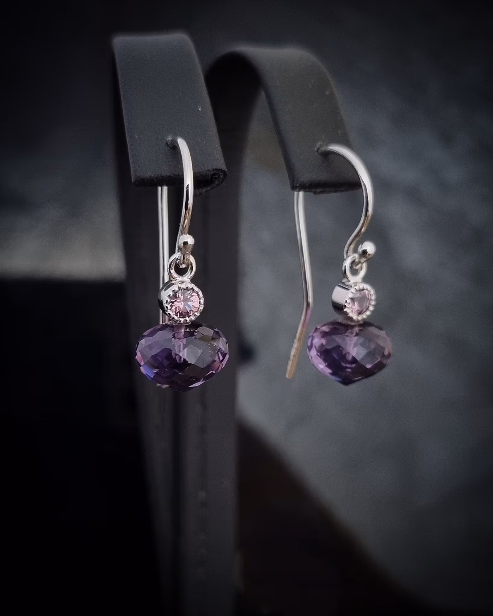 Mått på Ametisterna är ca 7 x 9 mm och hela örhänget mäter ca 25 mm långt.