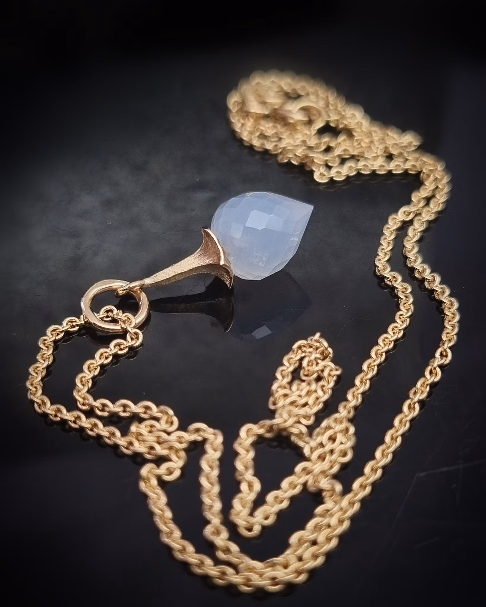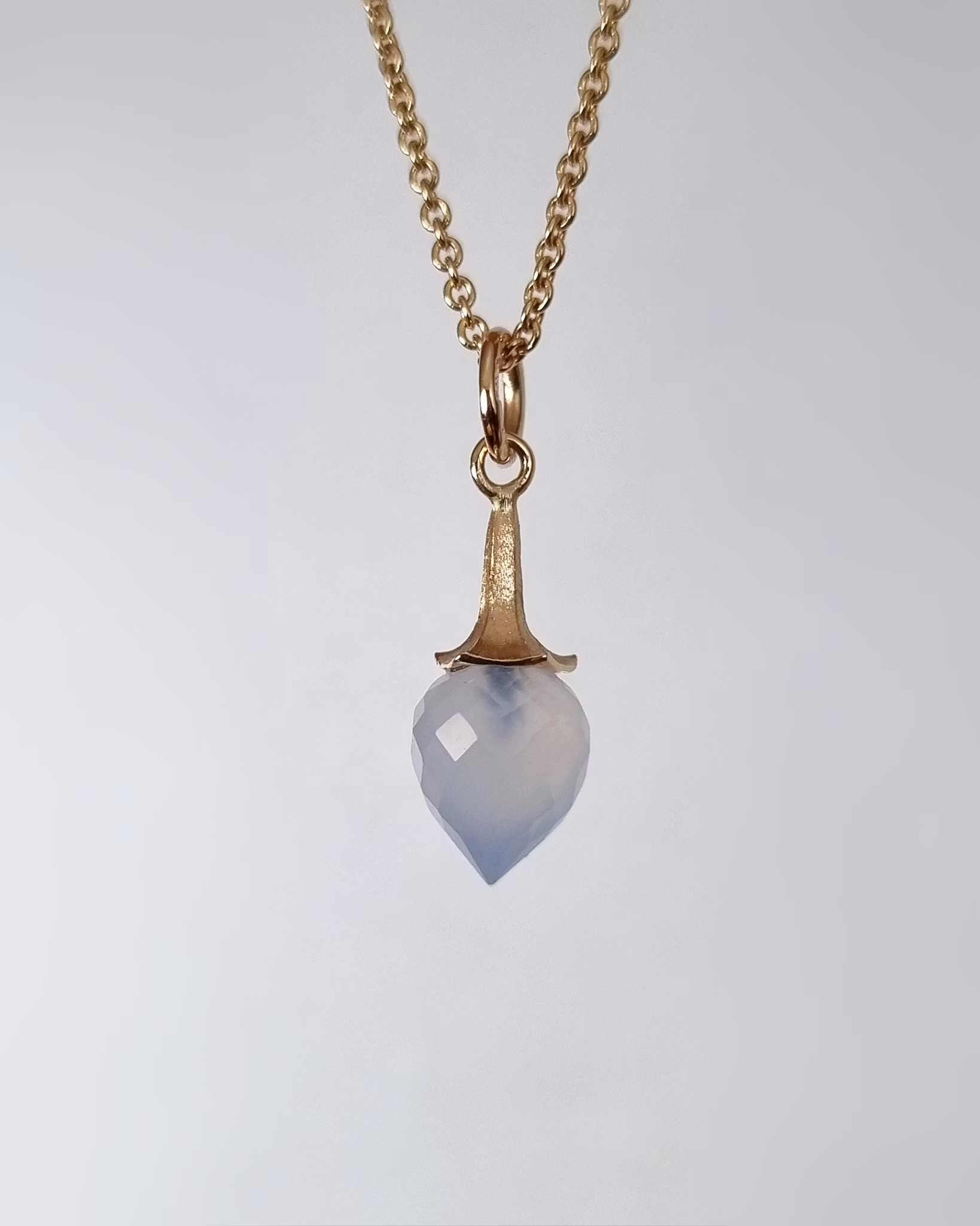 Kalcedonen är slipad som spetsbriolett och den glittrar lite dovt och härligt när den rör sig. Ett perfekt vardagssmycke som inte är för stort eller för litet!