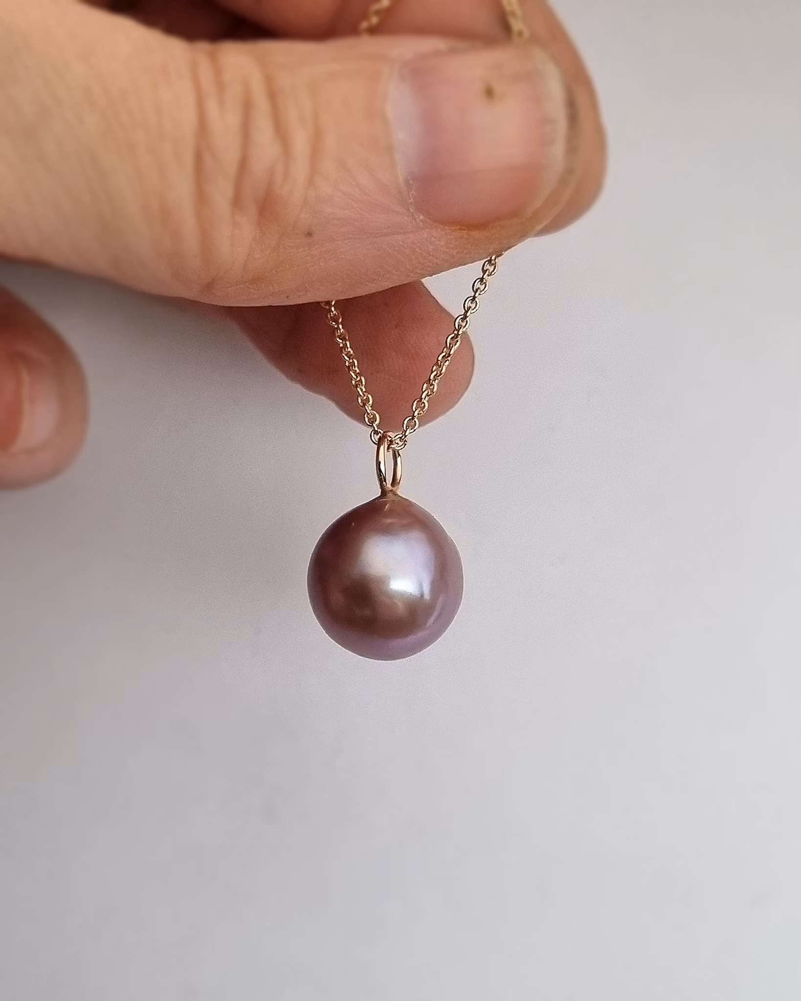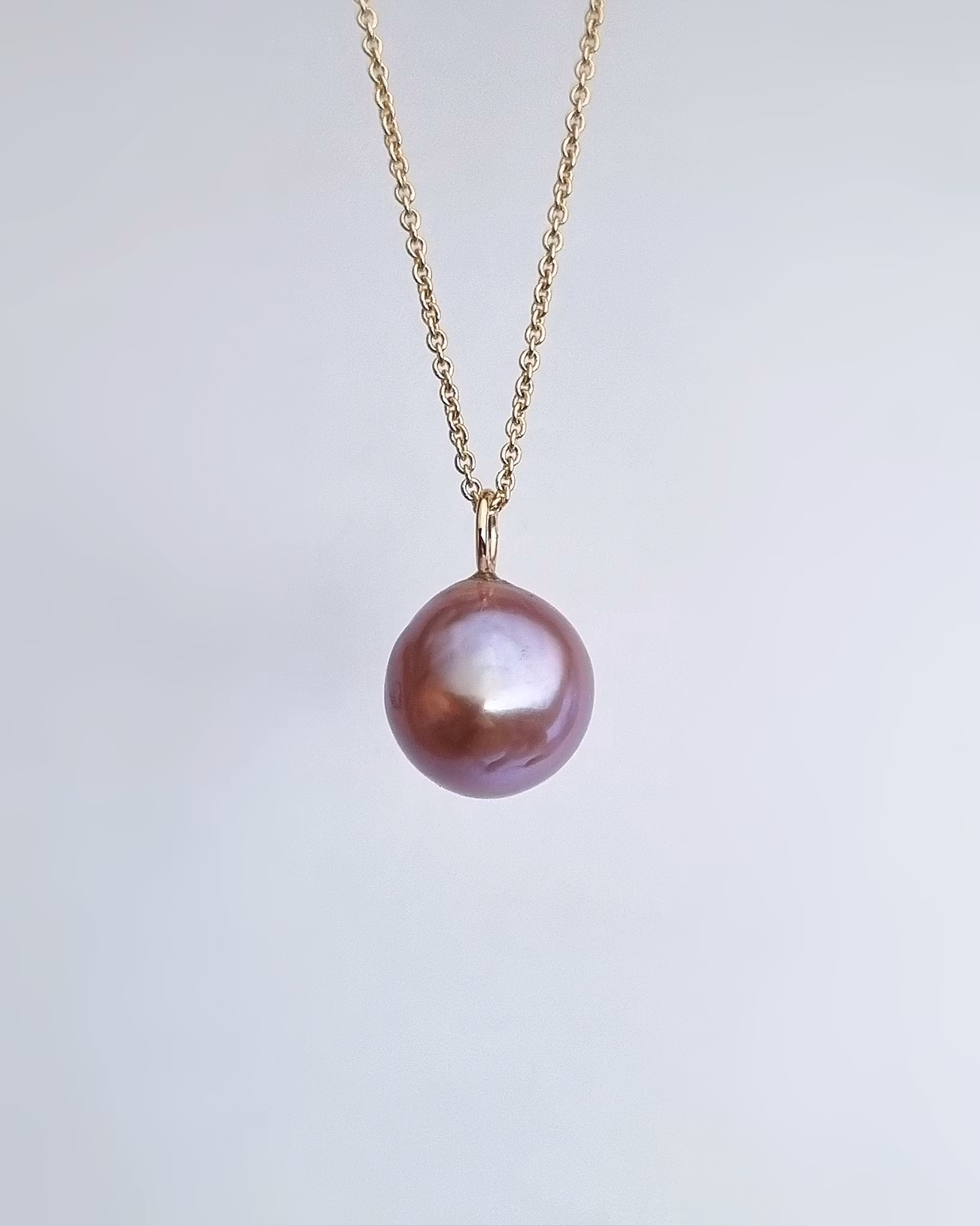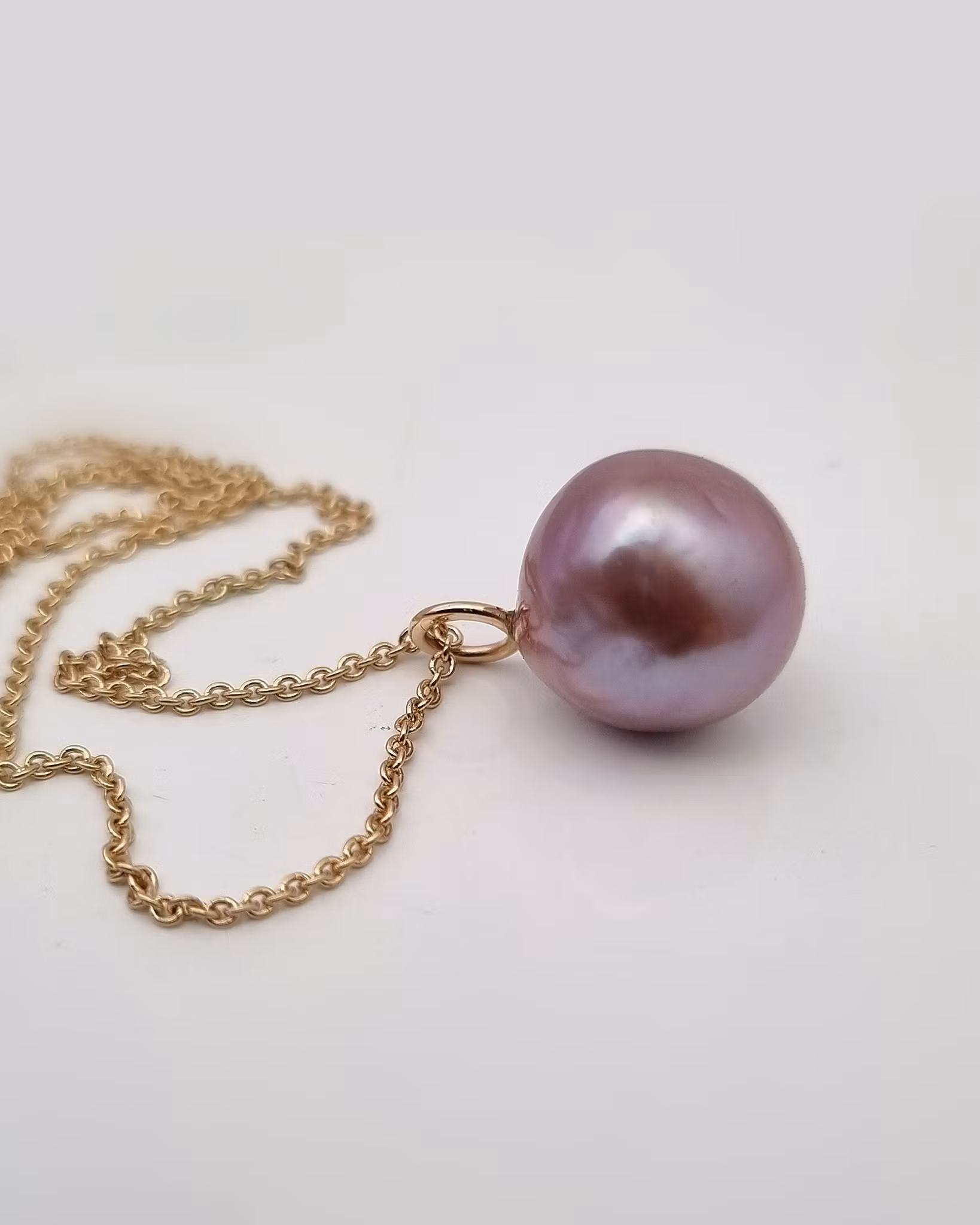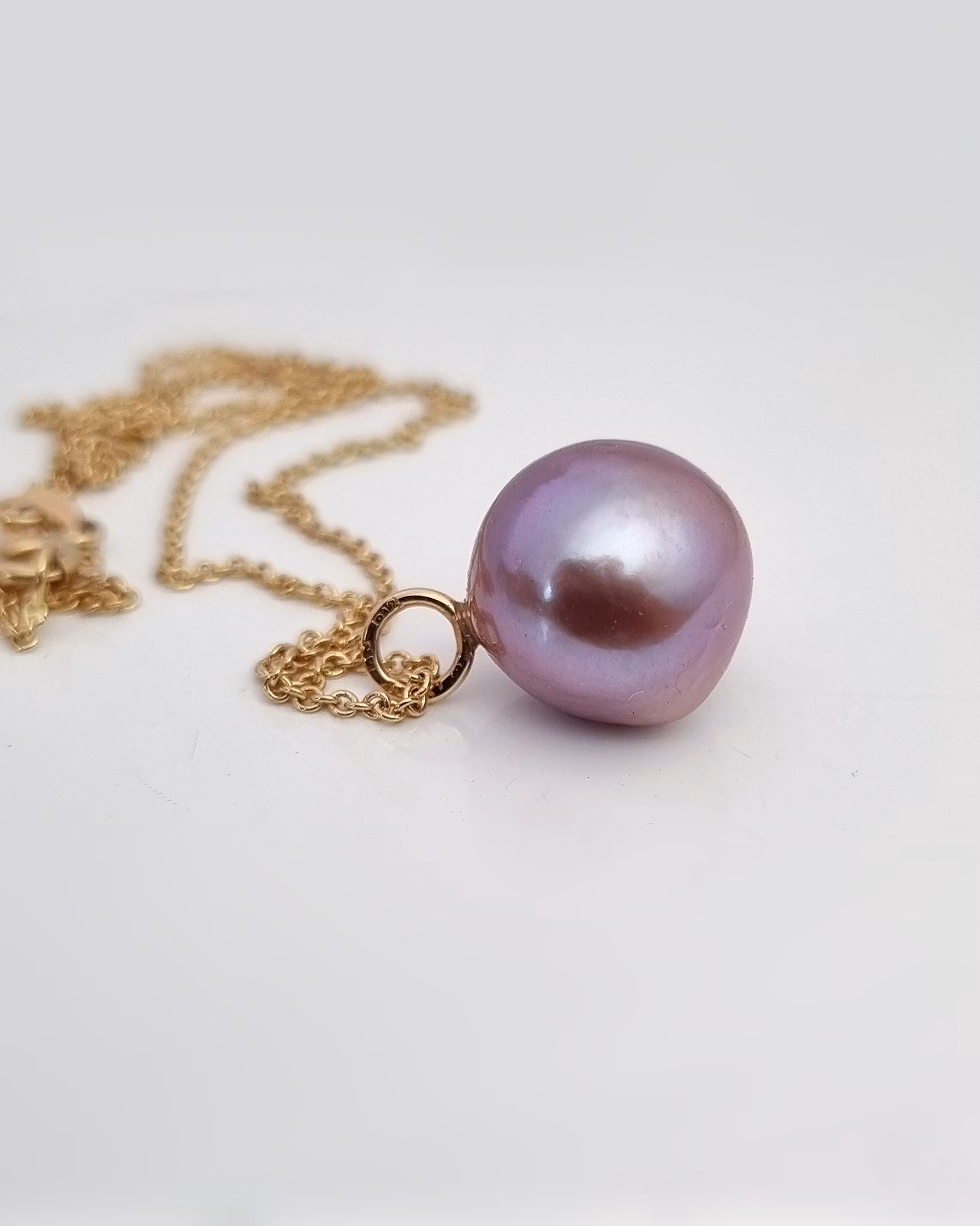 Hänget har en fantastisk semibarock form och är naturligt askrosa. En äkta odlad sötvattenspärla. En trevlig gammelrosa nyans som är kall i tonen och har ett djupt vackert skimmer. Svår att återge via bild! Pärlan har en ojämn och rundad form med en lätt barock yta vilket gör den unik.