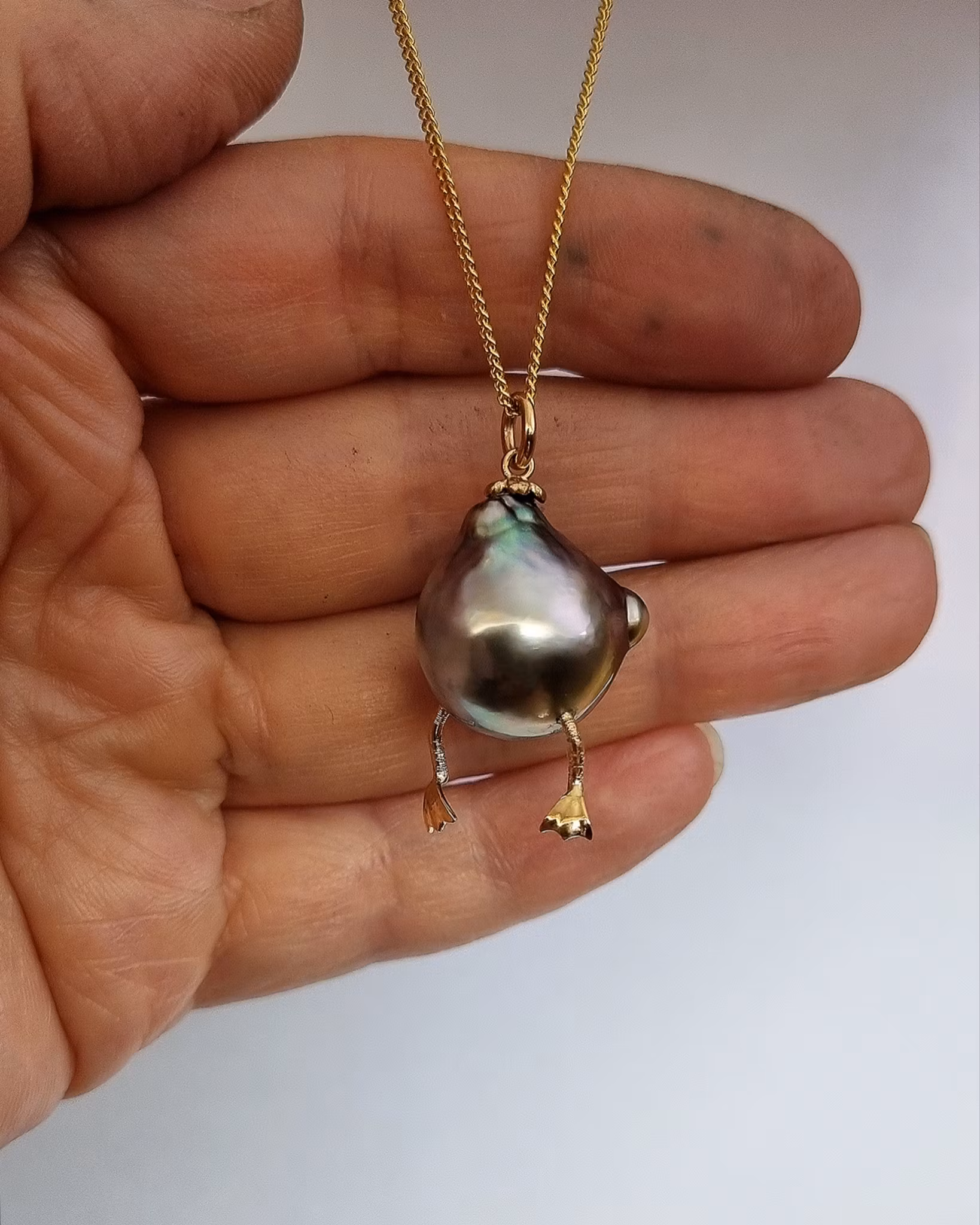 Barbro Tahitipippin har en liten blomsterhatt, ben samt fötter tillverkade i 18K återvunnet guld. Hon är bullig och bastant med en ganska rund kropp med vackra, naturligt ojämna detaljer såsom kanske en liten 'svans' och ett liten näbb. Det är upp till den som tittar vad som är vad! Färgen är rik och skimrar i olika nyanser av blå, grön, rosa och silver. Klassisk Tahitipärla och helt magnifik i sin lyster.