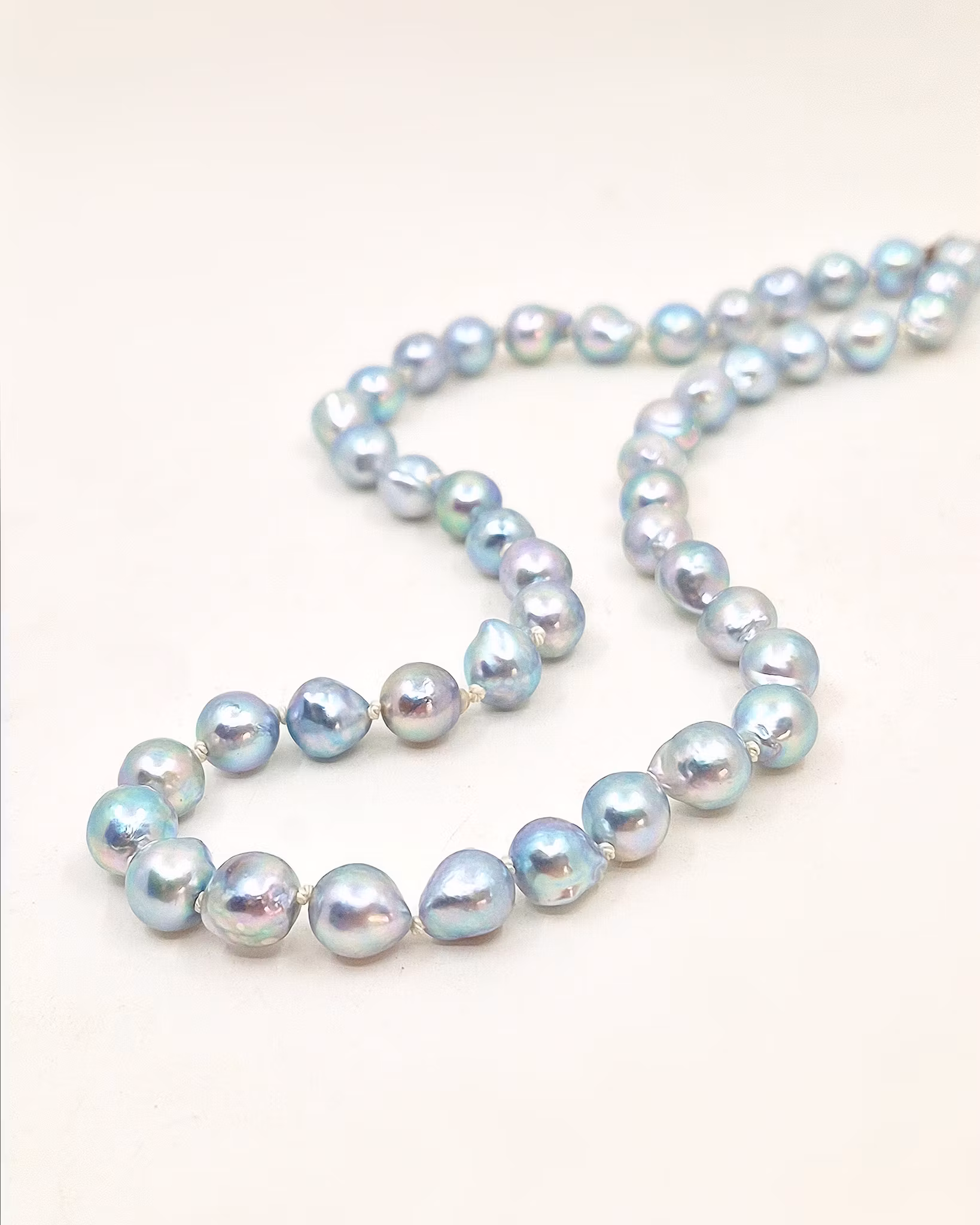 Dessa pärlor skimrar i helt underbara ljusblå, silver och turkosa nyanser och har ett levande uttryck med sin ojämna form. Ett vackert pärlcollier med hög lyster och personlig stil!