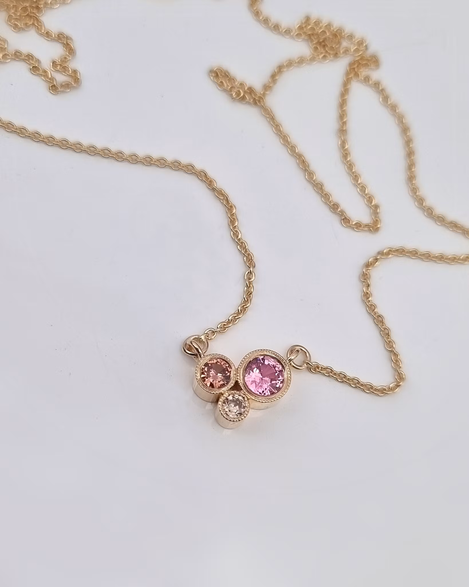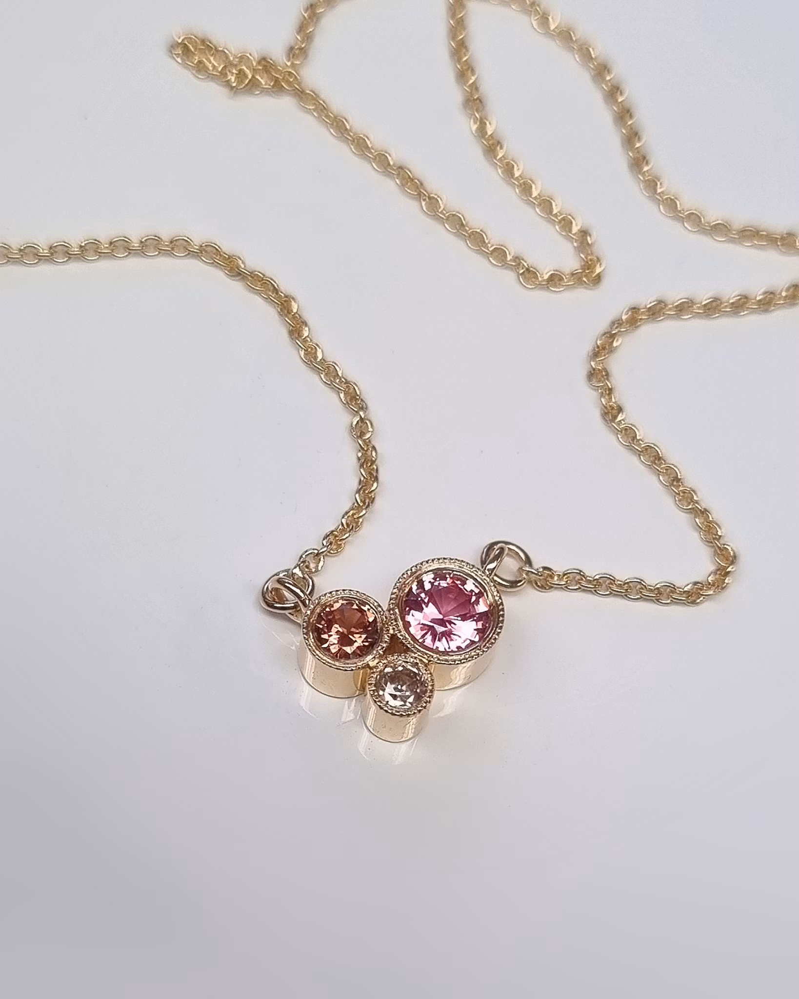 Detta collier är tillverkat i 18K återvunnet guld och har tre färgsprakande helt fantastiska naturliga Safirer i rosabrun, champagne och koppartonade nyanser.