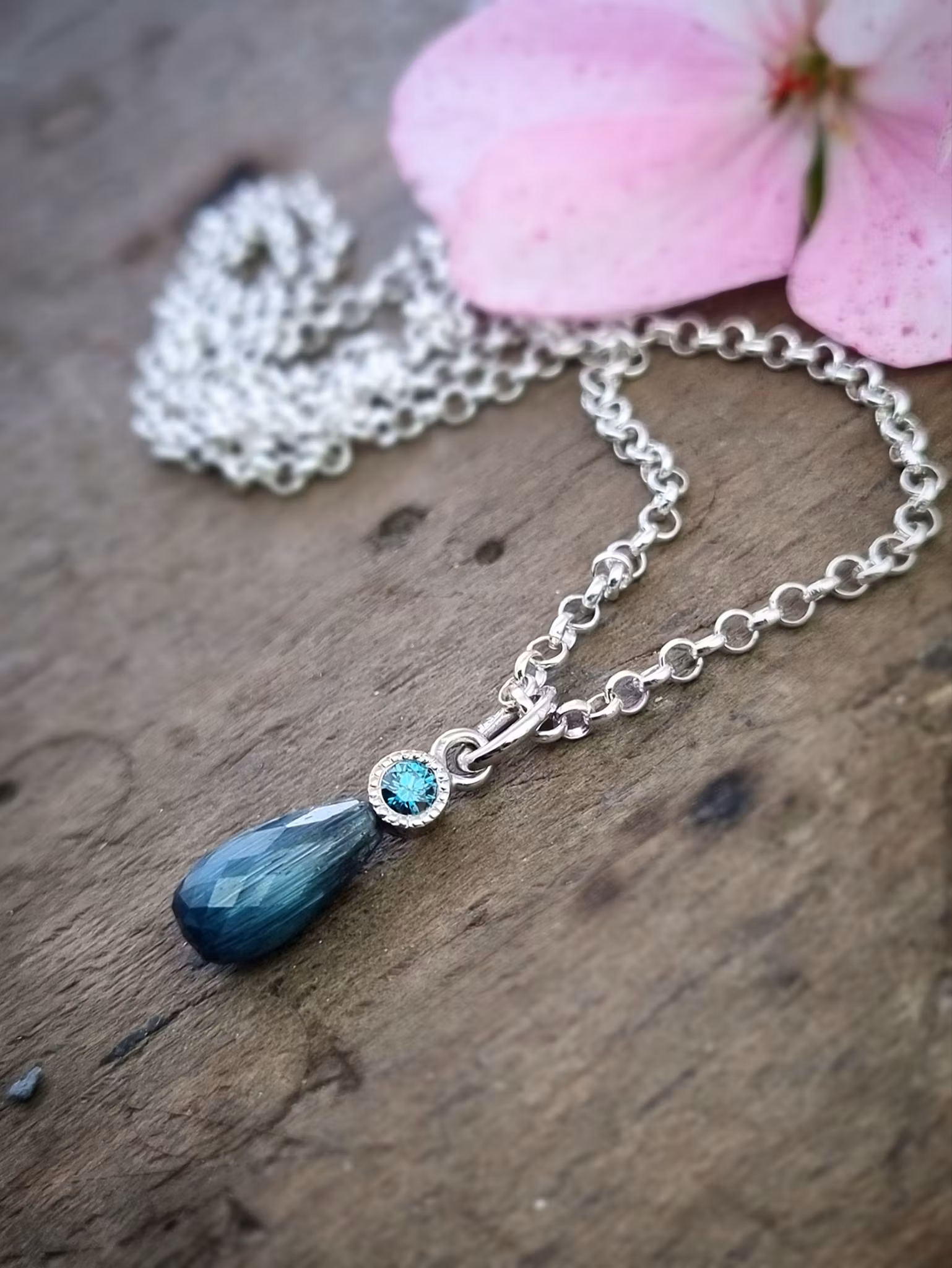 Som en ordentlig åskhimmel skimrar denna ovanliga fairtrade-Turmalin i djupt blågrå toner. Den har en helt otrolig struktur som inte går att förmedla via foton då den blänker på ett ytterst tillfredsställande sätt, i olika vinklar. Den är närmast opak och är något mörkare i botten. Detta Turmalinhänge är en sk 'one of a kind' och det kommer sannolikt inte dyka upp något liknande igen. Väldigt ovanlig ädelsten!