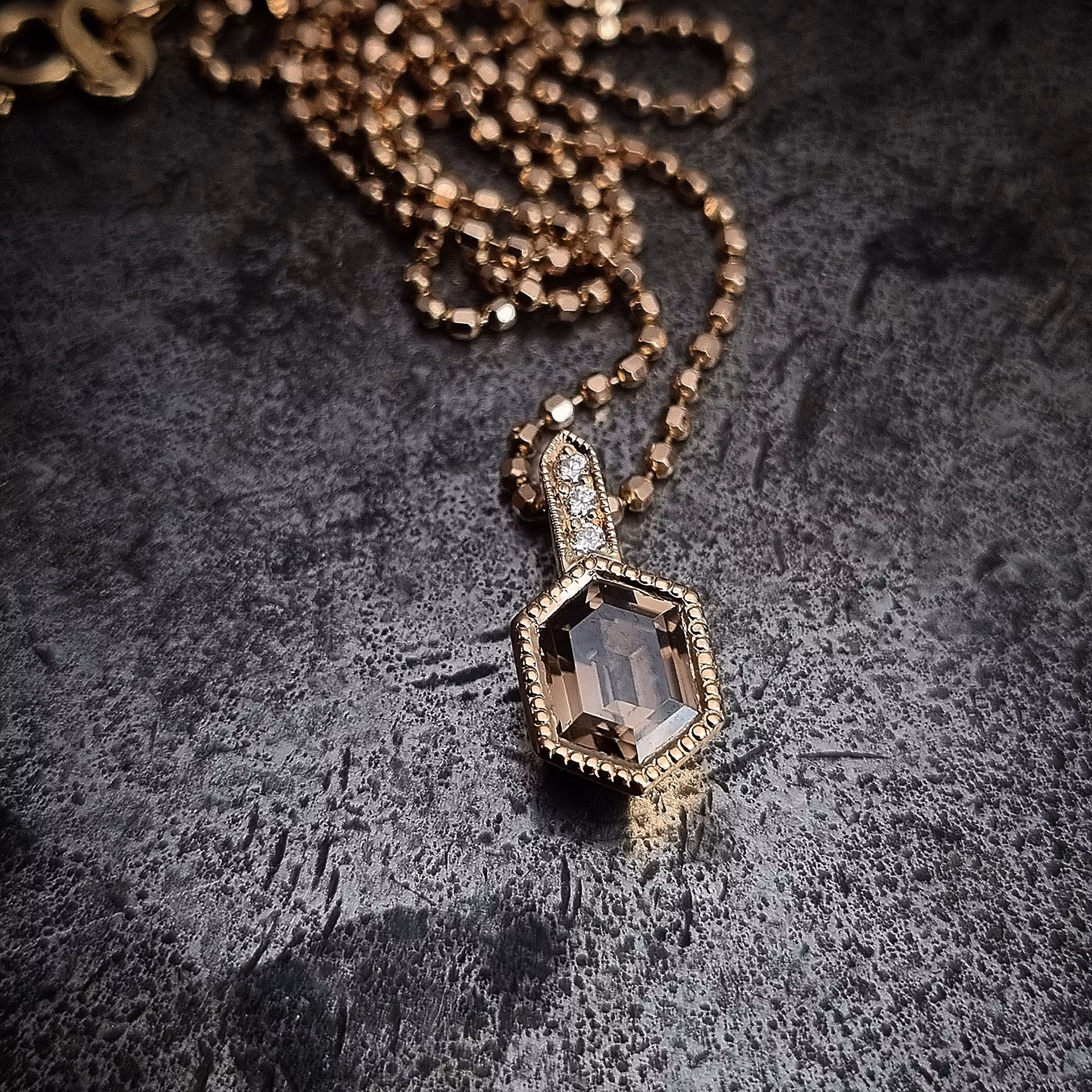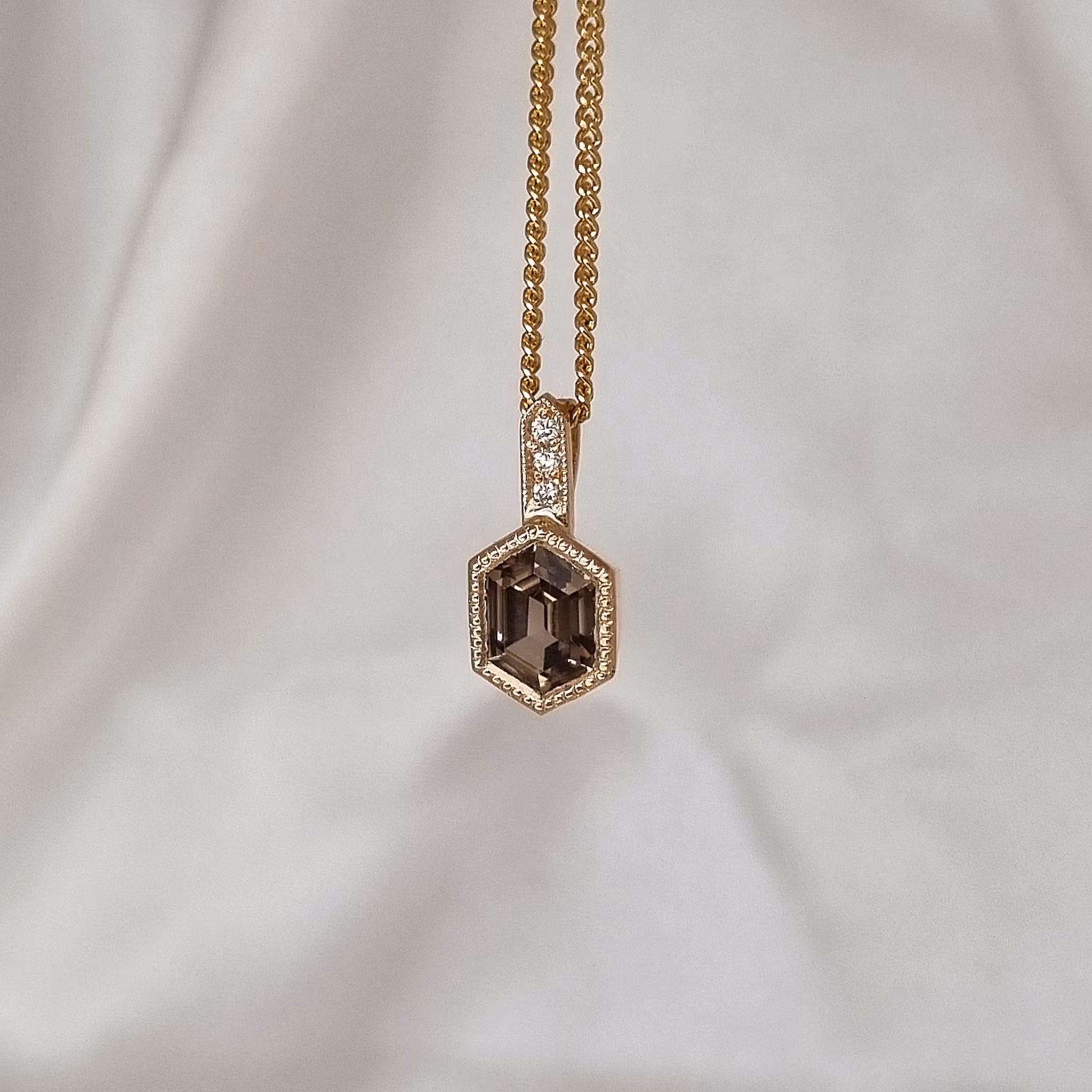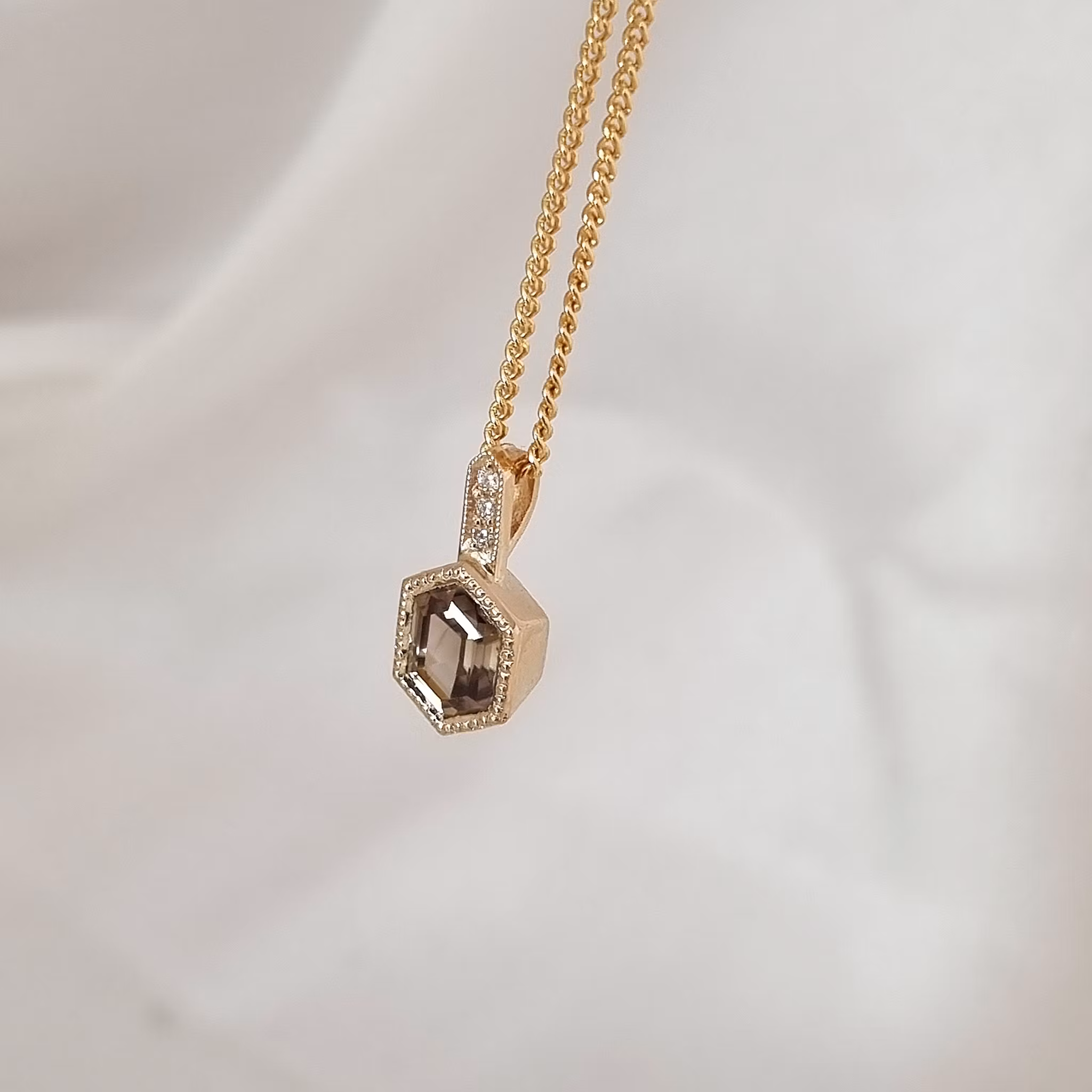 Hexagonslipad naturligt brun fairtrade Zircon, 1,71 ct. Hängsmycket är handgjort i 18 K återvunnet guld och har detaljer med miligrif.