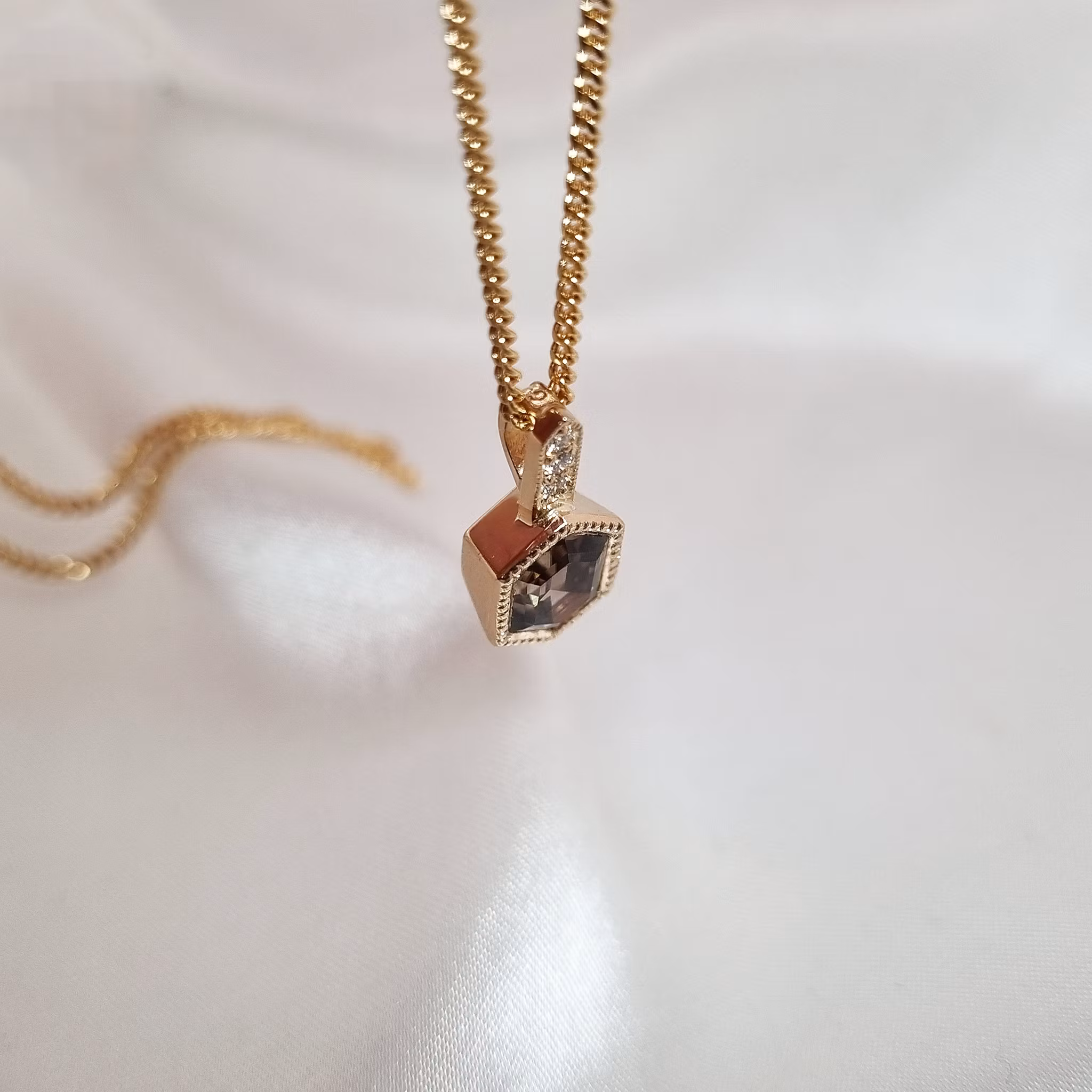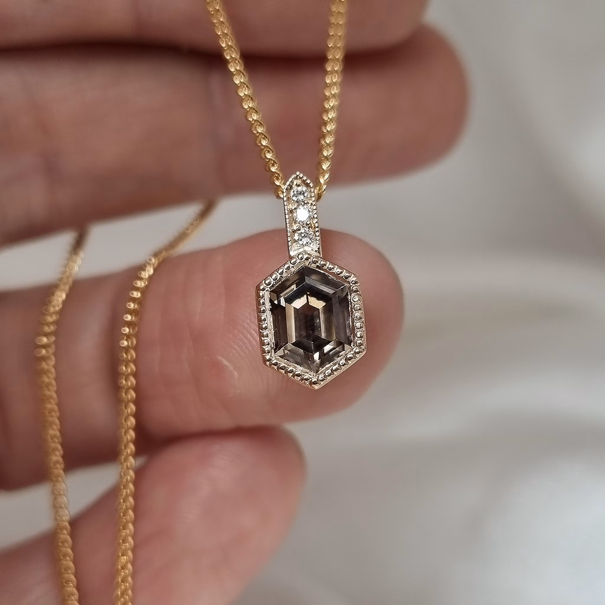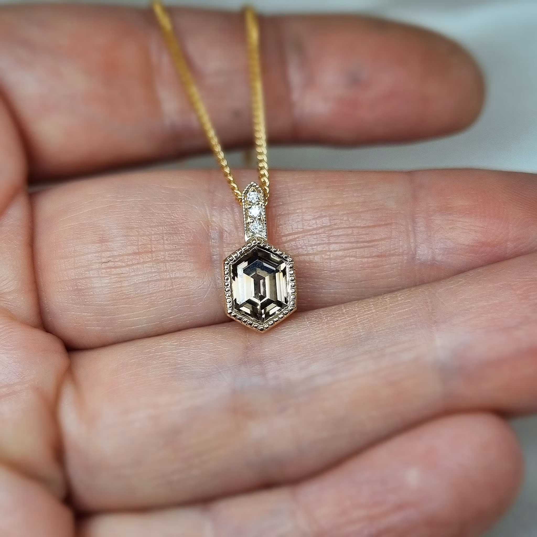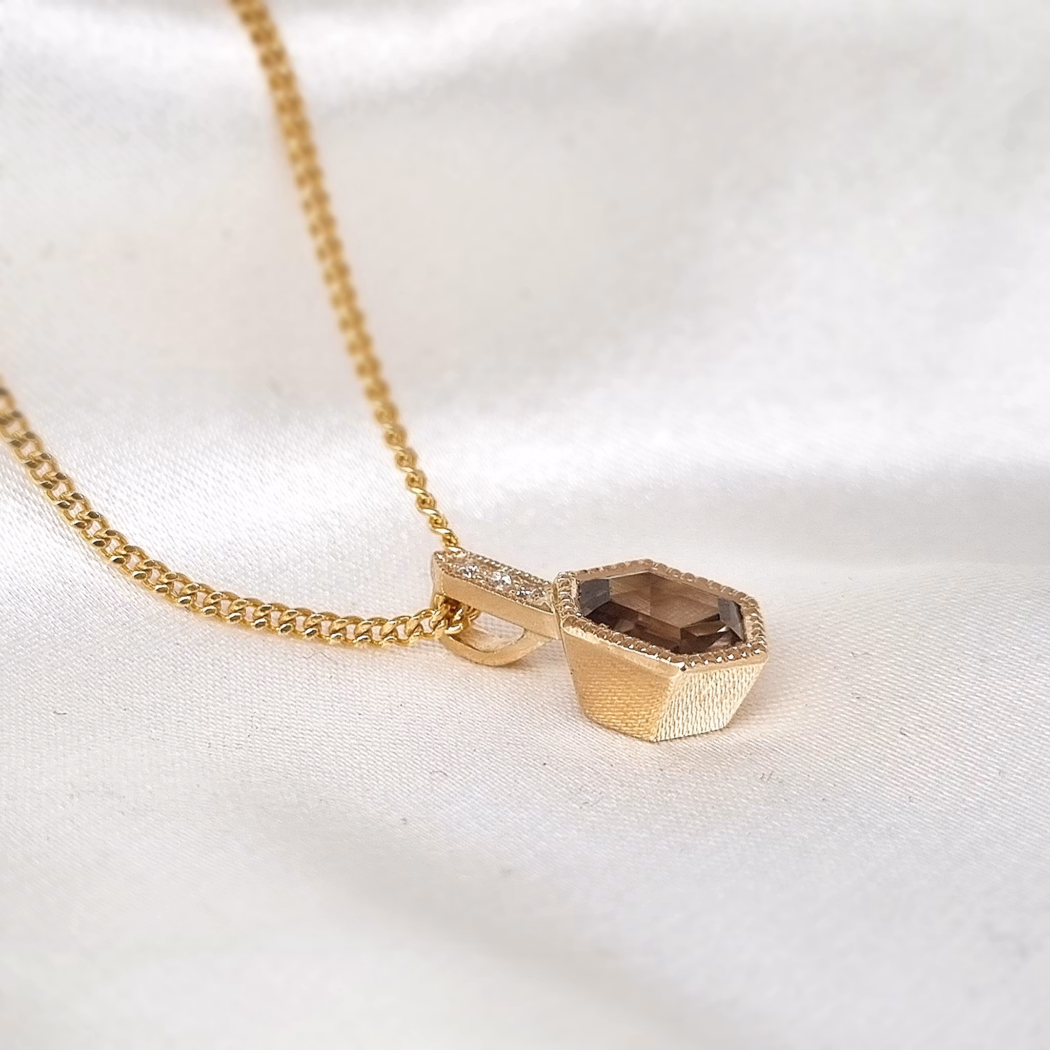 Hexagonslipad naturligt brun fairtrade Zircon, 1,71 ct. Hängsmycket är handgjort i 18 K återvunnet guld och har detaljer med miligrif.