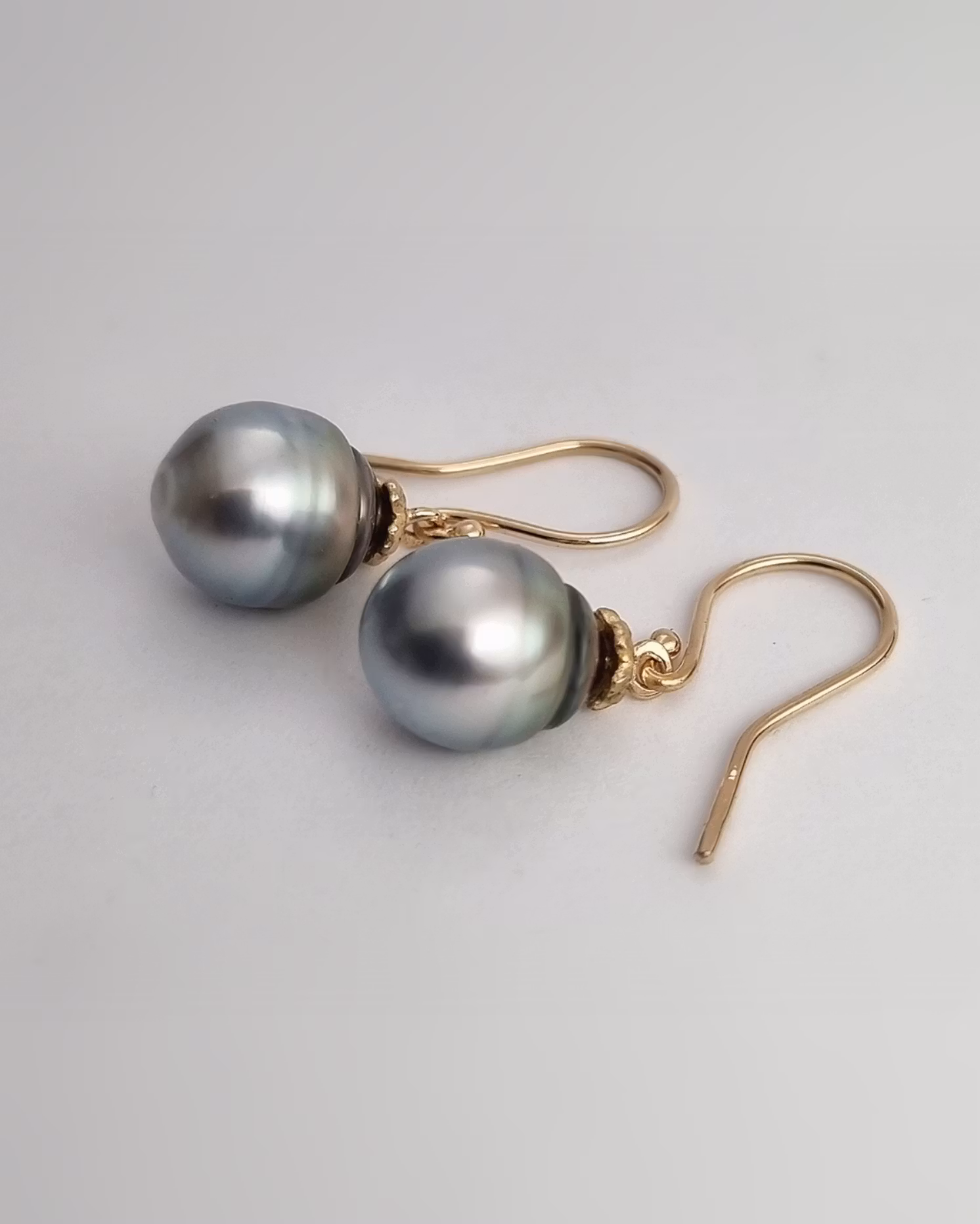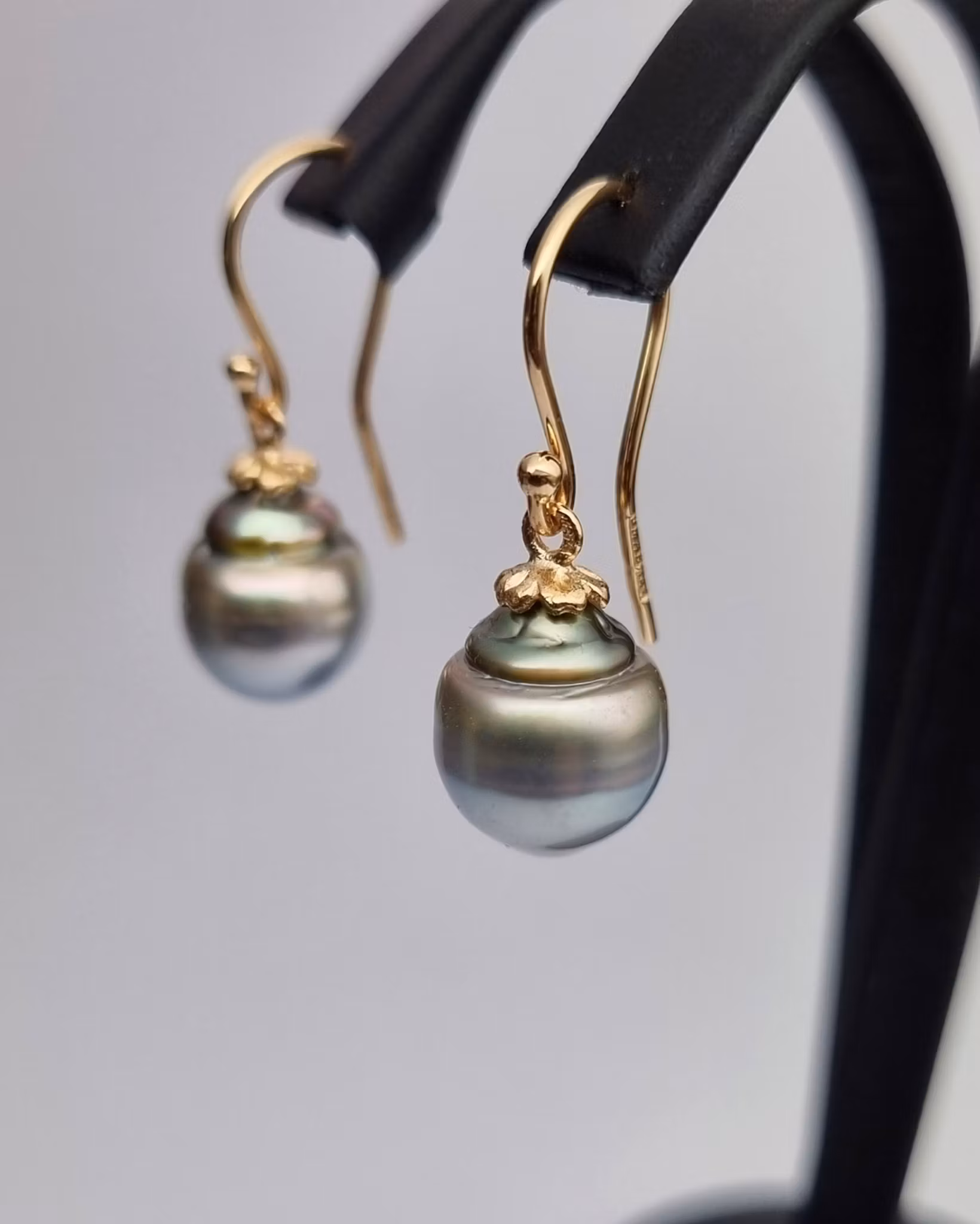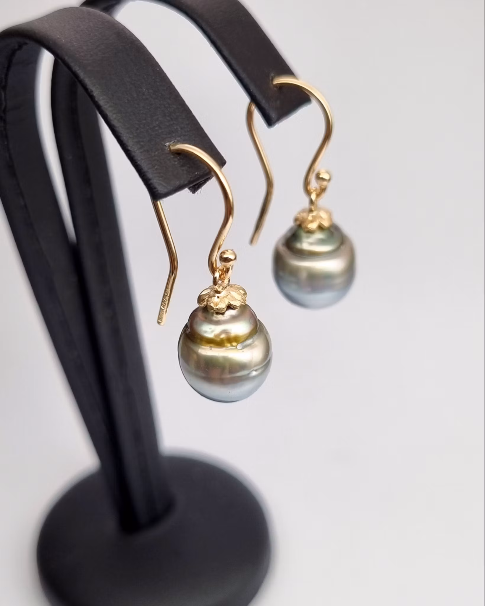 Guldörhängen med etiskt utvunna pärlor från Fiji, redo för leverans.