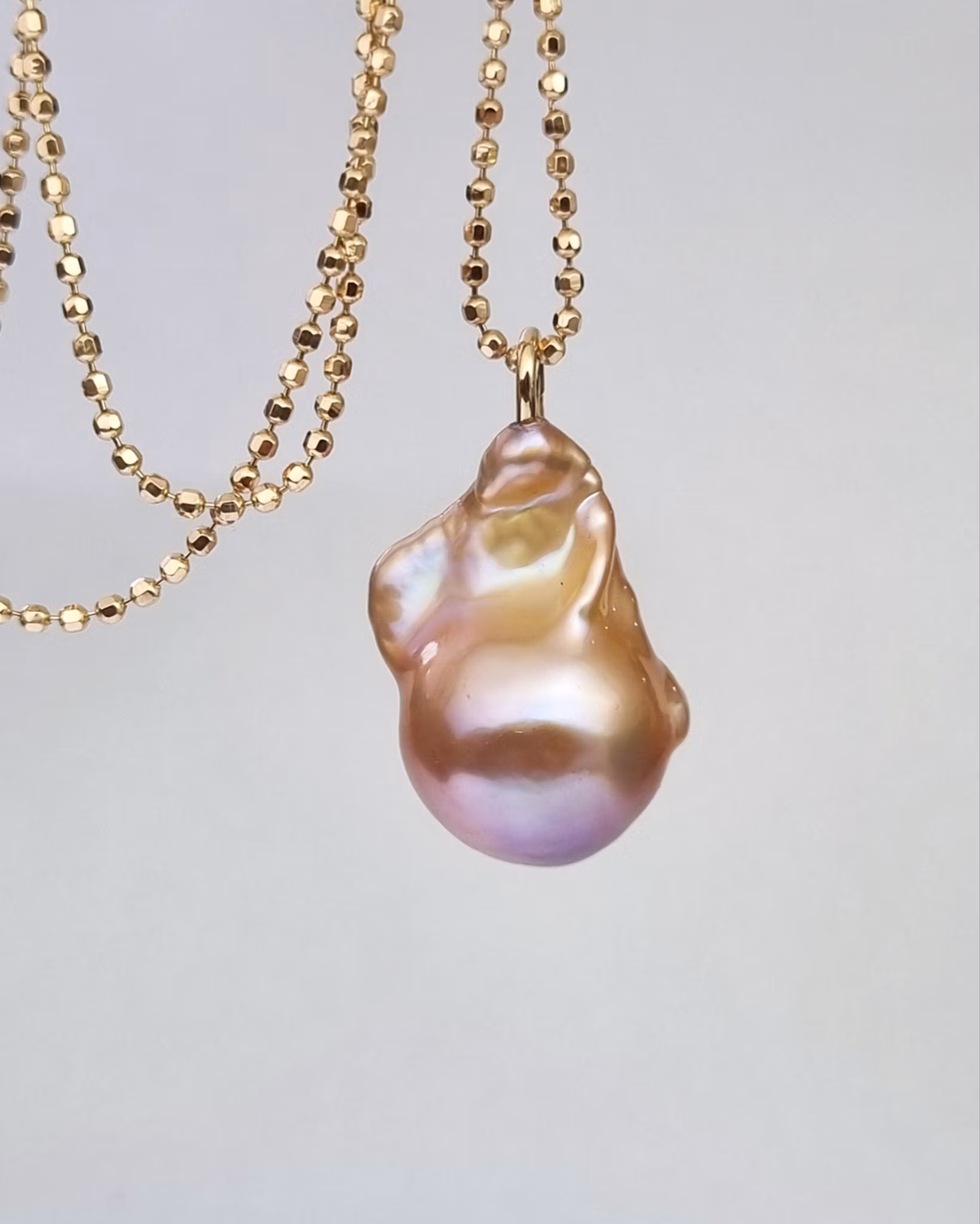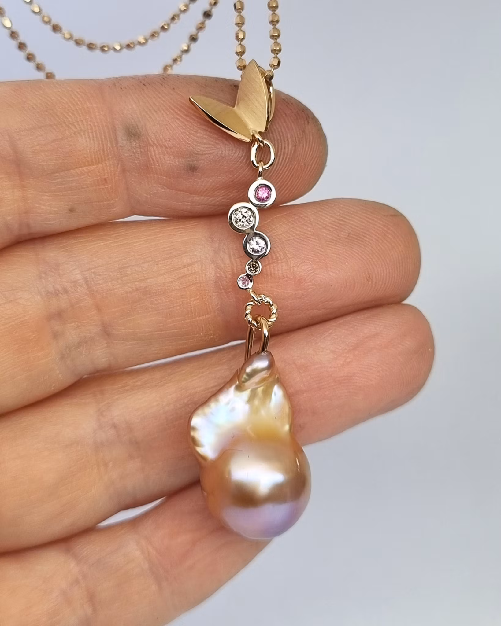 Ett annorlunda kombinationshänge med en stor barock sötvattenspärla, briljanter och rosa safirer. Hängsmycket går att bära i sin helhet eller isärkopplat som två separata halssmycken, se bilder. Pärlan har en öppen hake som går att kroka av. Det blir alltså tre smycken i ett!
