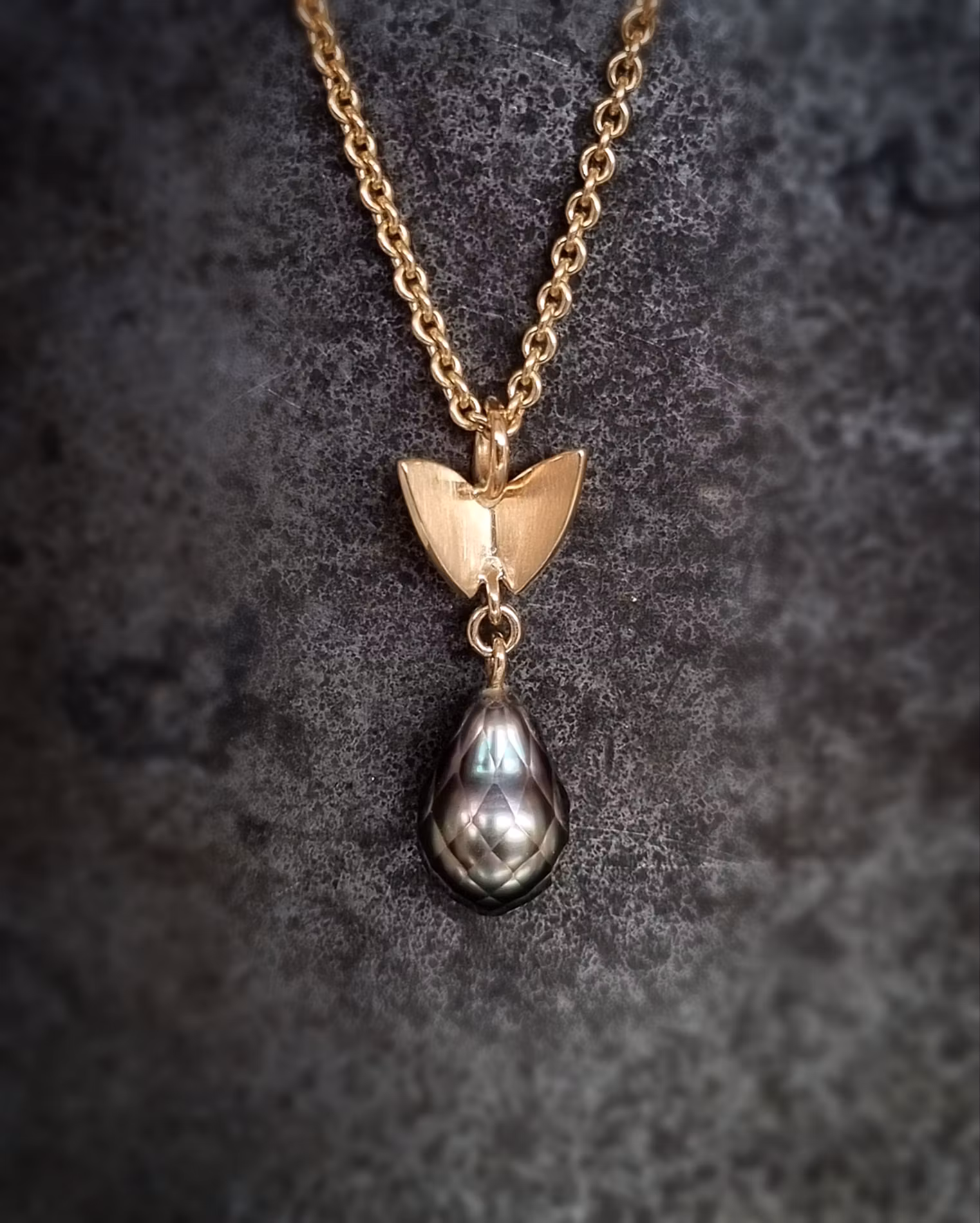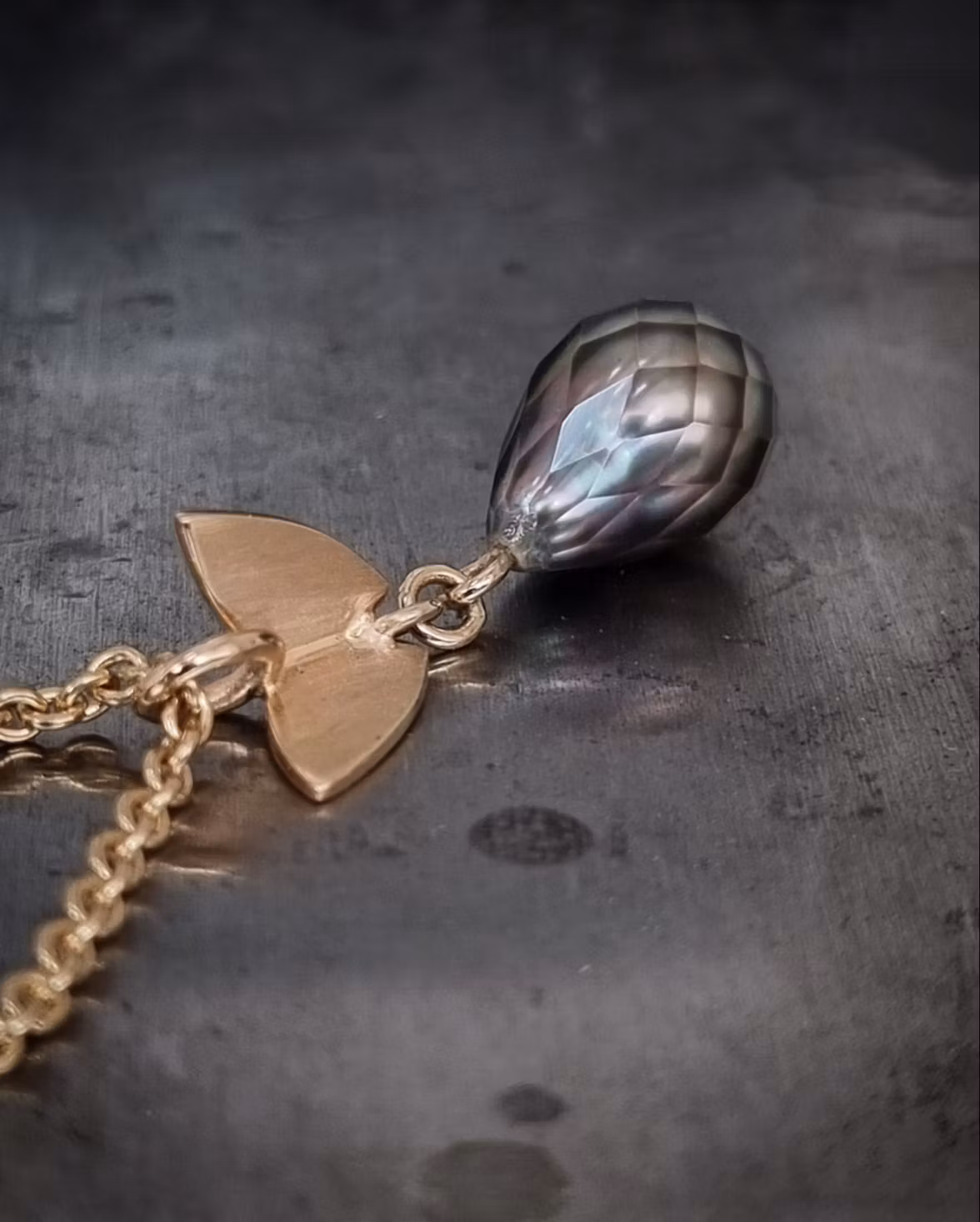 Vacker facetterad droppformad Tahitipärla med en 'Fjäril på vift' i 18 K återvunnet guld. Tahitipärlan är handfacetterad i Japan och har ett ovanligt och mycket tilltalande utseende med en djup lyster. Färgen klassas som Fancy och kvaliteten är B+ (vilket är hög). Pärlan mäter ca 8,5-9 x 12,5 mm och har en symmetrisk droppform. Certifikat medföljer vid köp. Hela hänget mäter 10 x 28 mm.