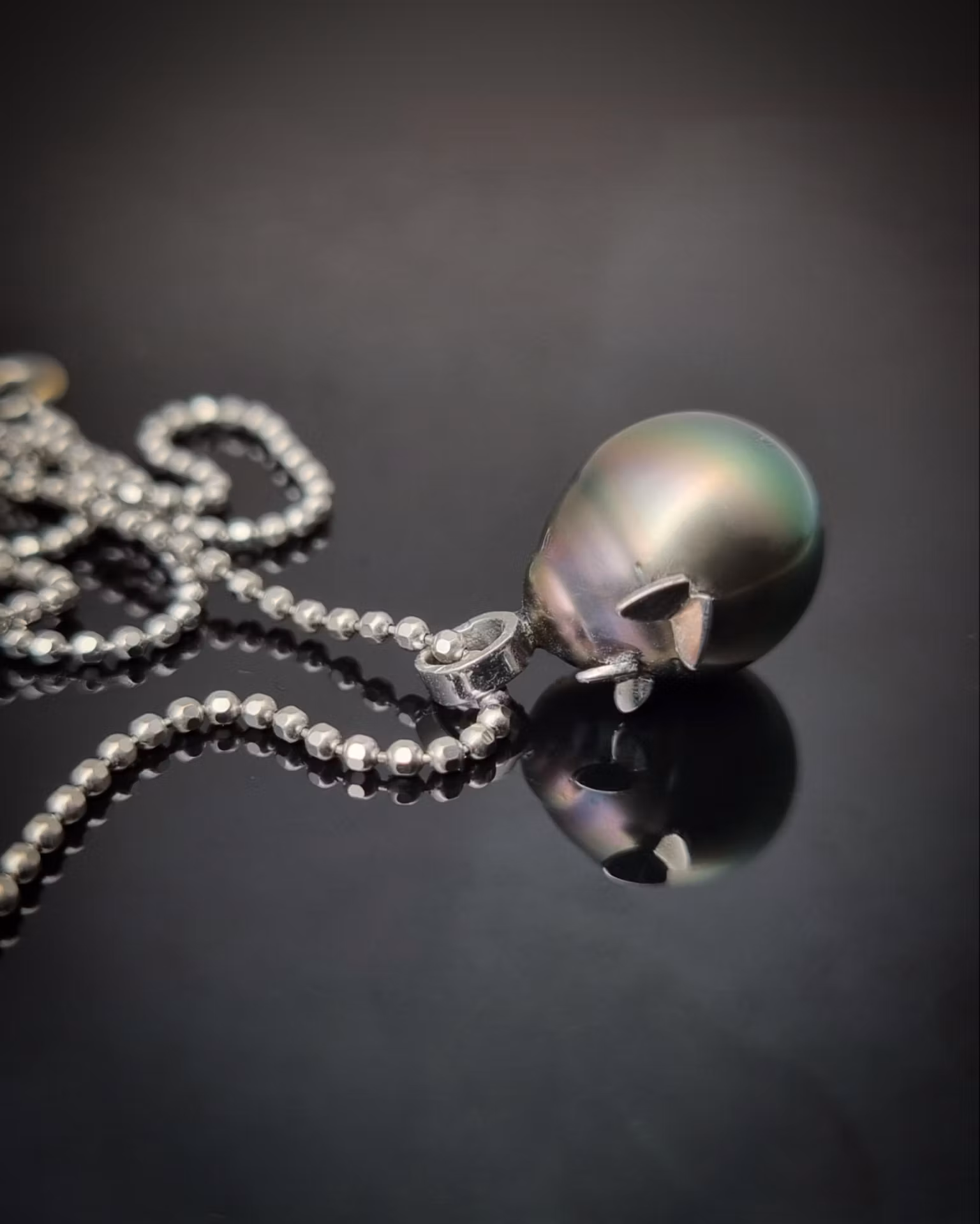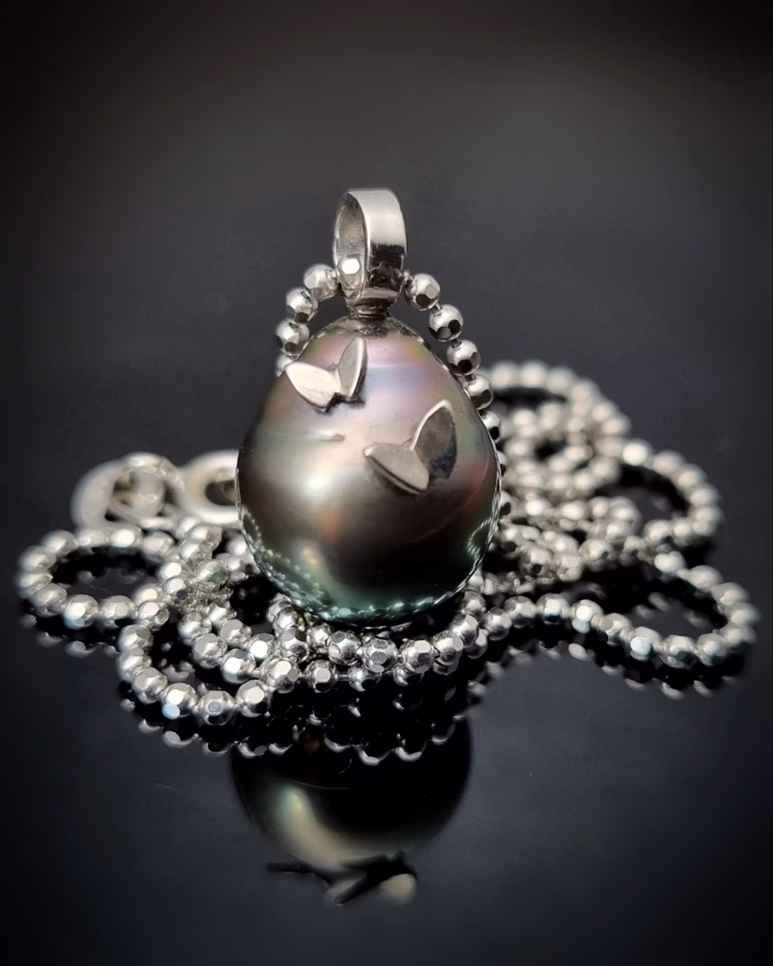 Äkta odlad Tahitipärla i jättefin symmetrisk droppform, med detaljer i 18K återvunnet vitguld. Pärlan är lätt barock med vackra unika små handgjorda detaljer. Färgerna är djupt skimrande och den visar olika nyanser i olika vinkar, såsom mörkt rosa, djupgrön, mörkgrå, blå och även bronsiga toner. Den här pärlan gör verkligen skäl för det som sägs om just Tahitipärlor, nämligen att ostronen producerar dom rikaste av färger och kan uppvisa en hel regnbåge i sina nyanser. Otroligt vacker pärla och dessutom med en hög lyster! Det sitter två små handgjorda fjärilar på pärlans övre del och fästet är en flack, nätt ögla. Samtliga delar i 18K vitt guld.