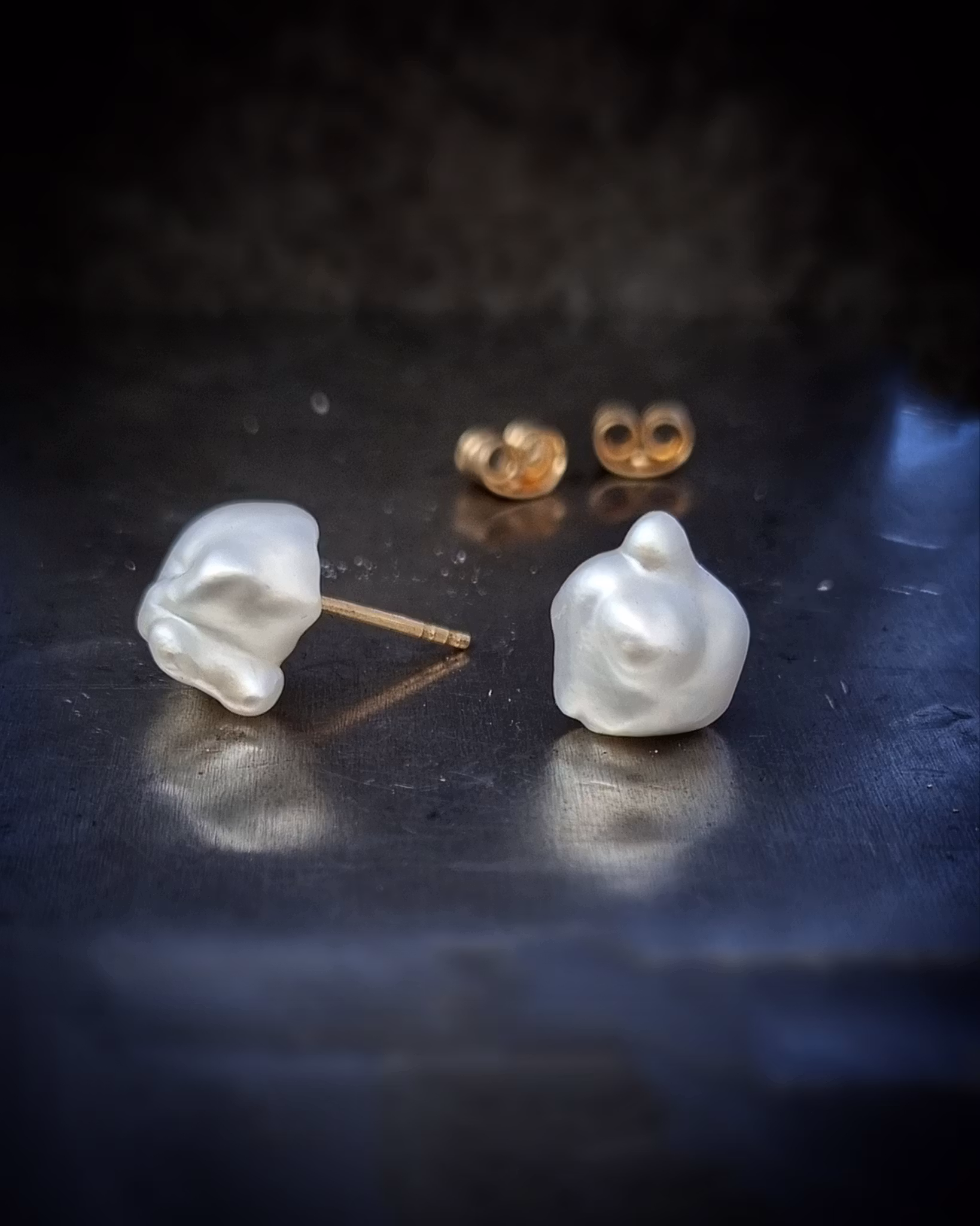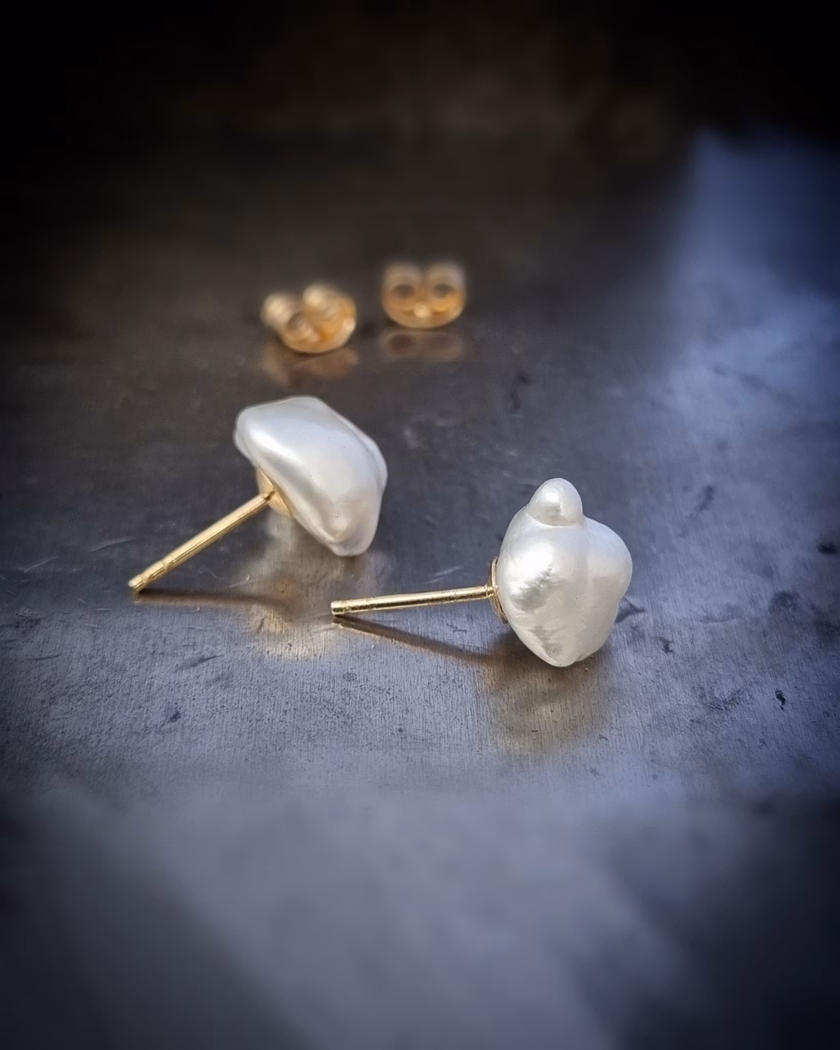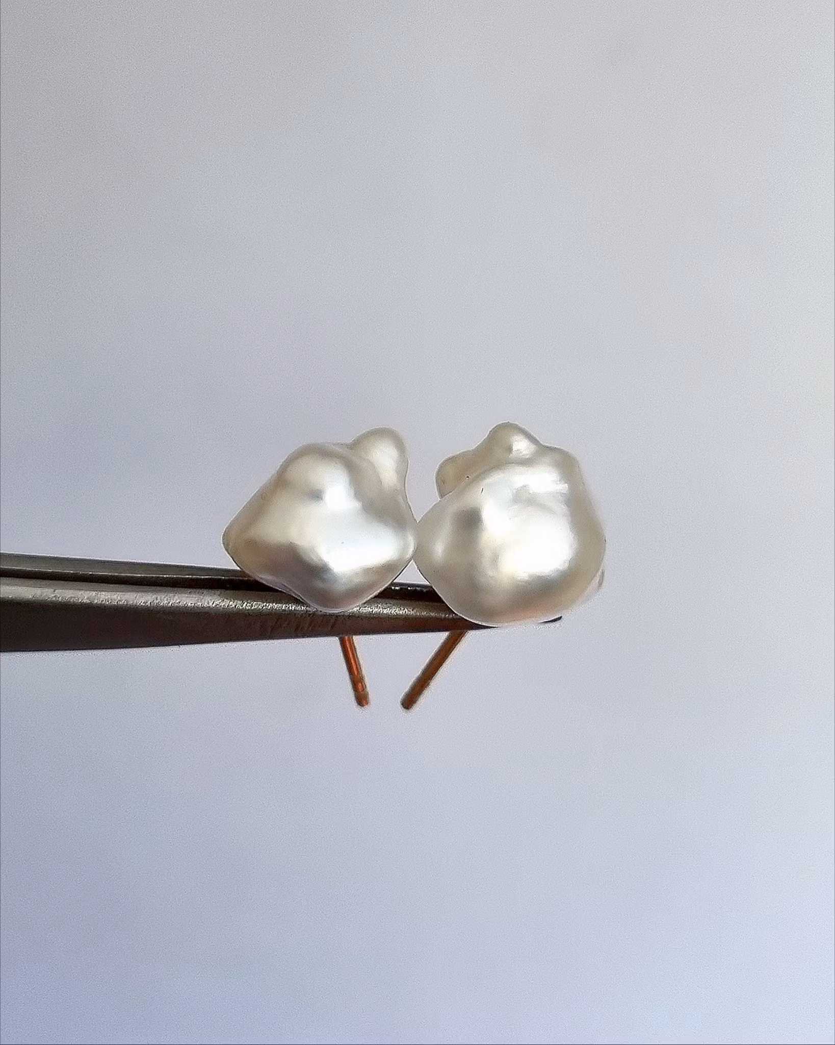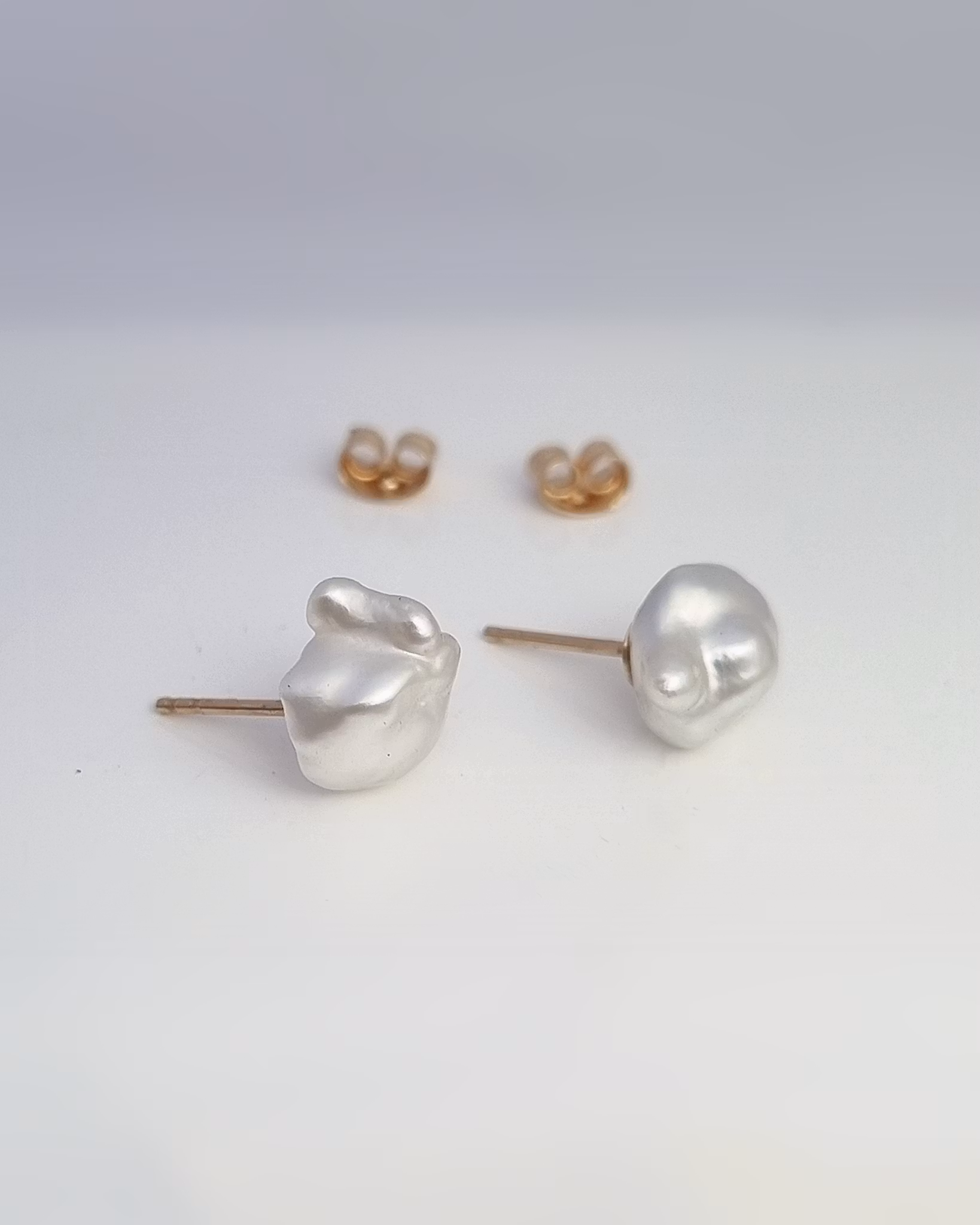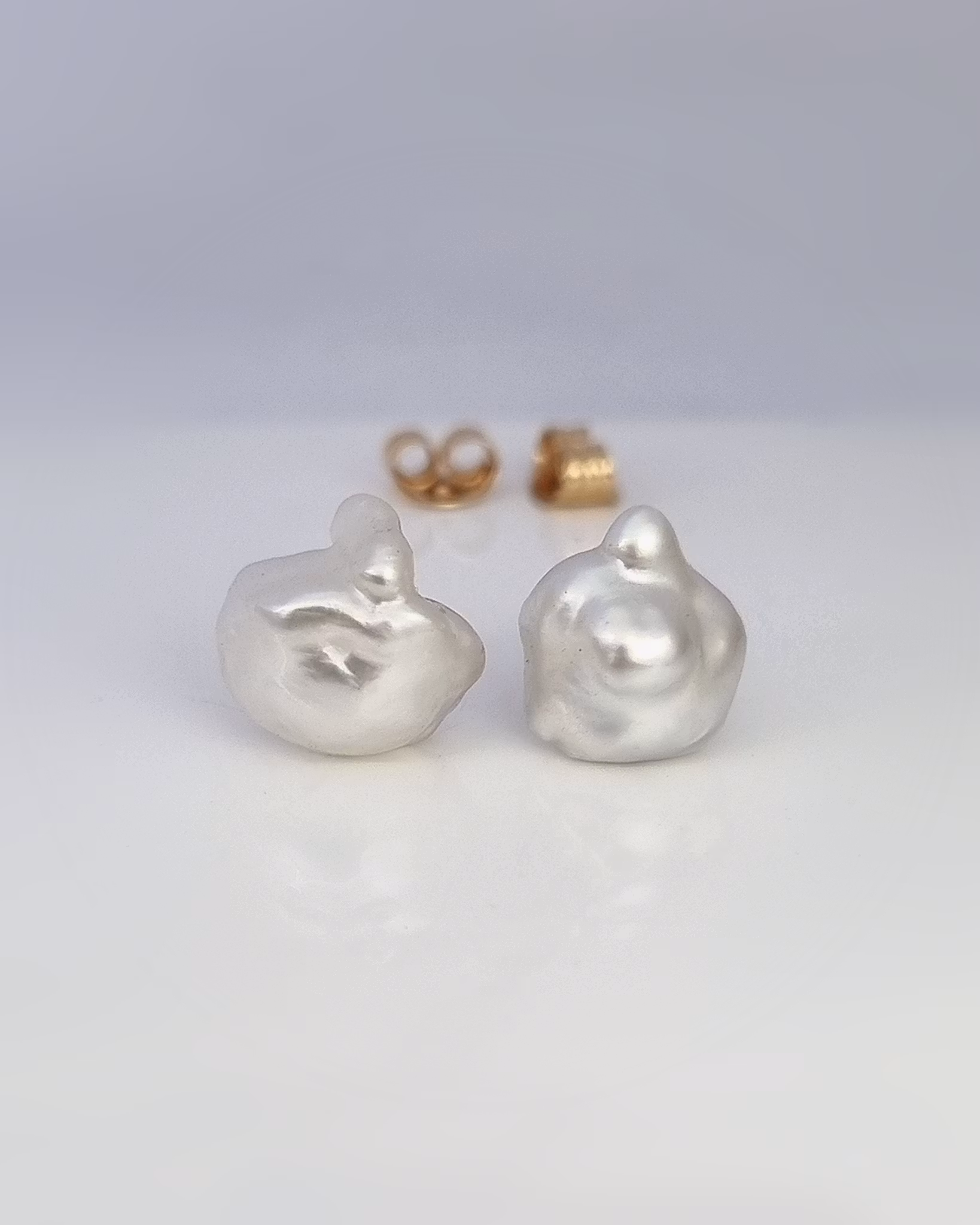 Underbart söta keshipärlor från Australien med klassiska stift och snurrebuss i 18K guld. Pärlorna är unika och har en hög kvalitet (AB). Formen på keshi är barock och dom här har en mycket hög lyster som glimmar i silvervit nyans.