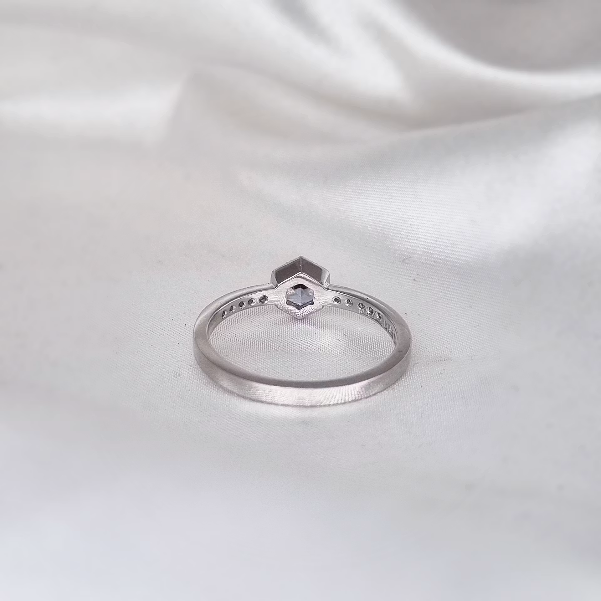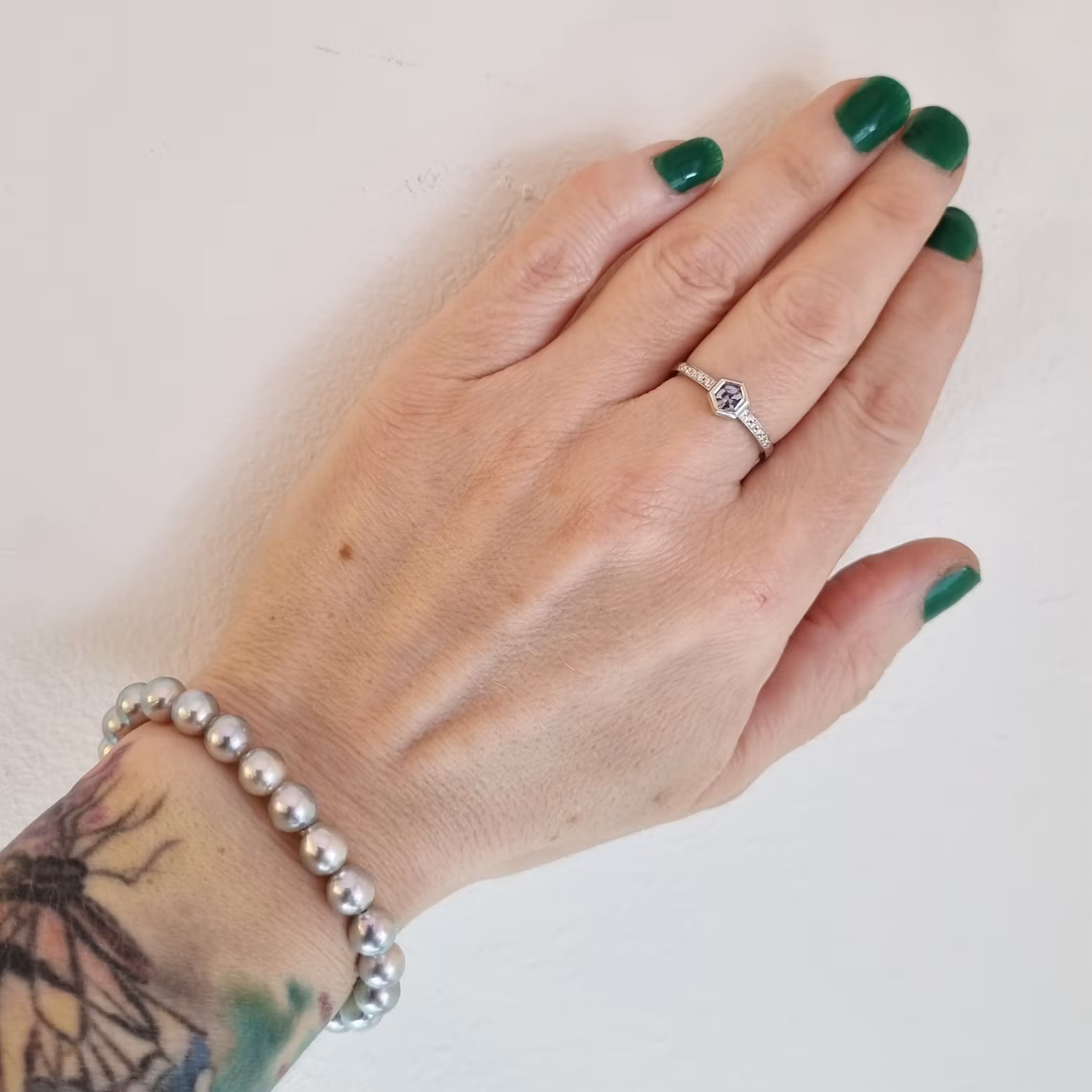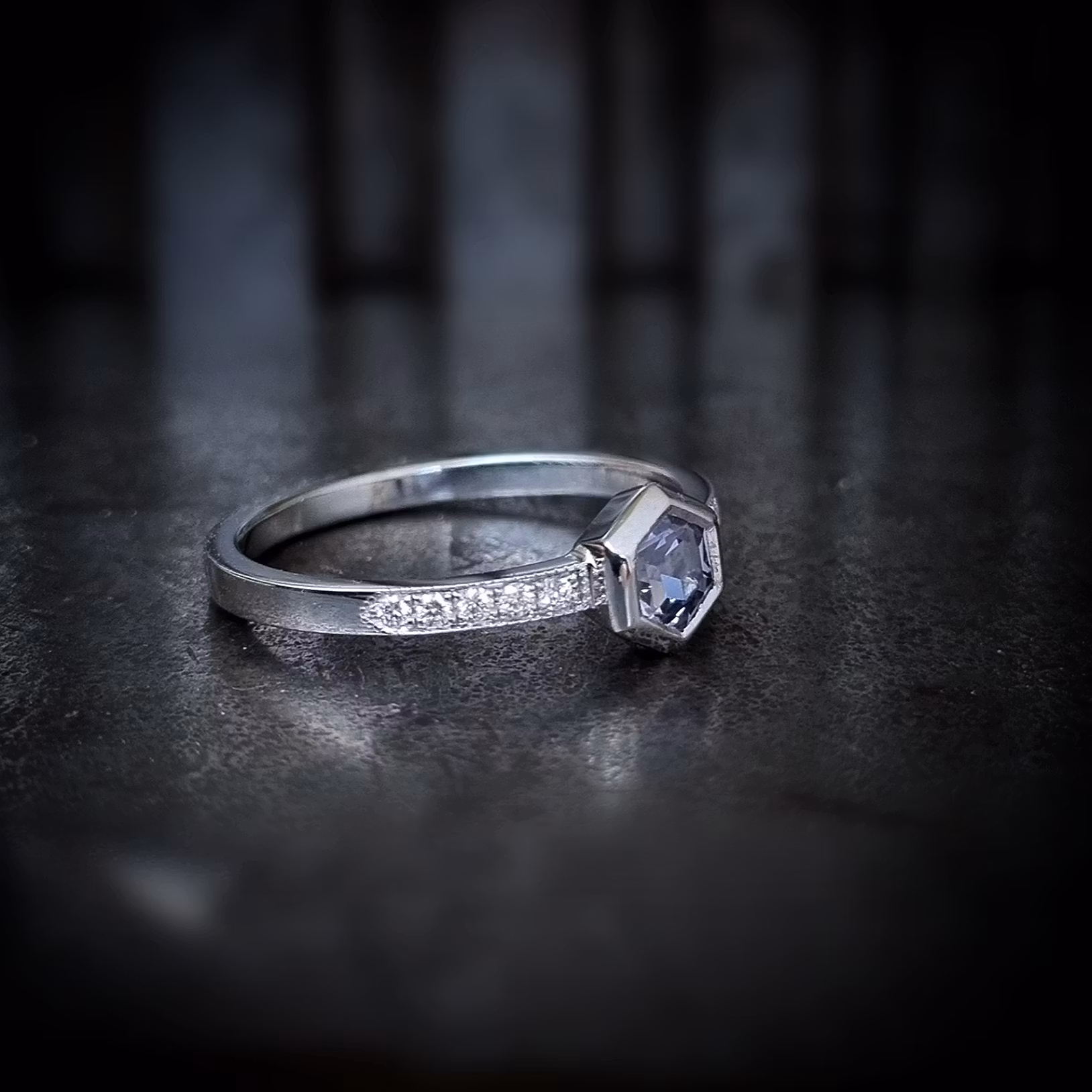En hexagonslipad isblå safir på 0,60 carat med totalt 10 st vita briljanter á 0,01 carat fattade på var sida. Ringen är tillverkad helt för hand i min verkstad och Safiren är etiskt utvunnen med ursprung på södra Madagaskar. Safiren är en riktig kameleont och skiftar nyans i olika ljus. Från ljust isblå till silver till mörkare grå.