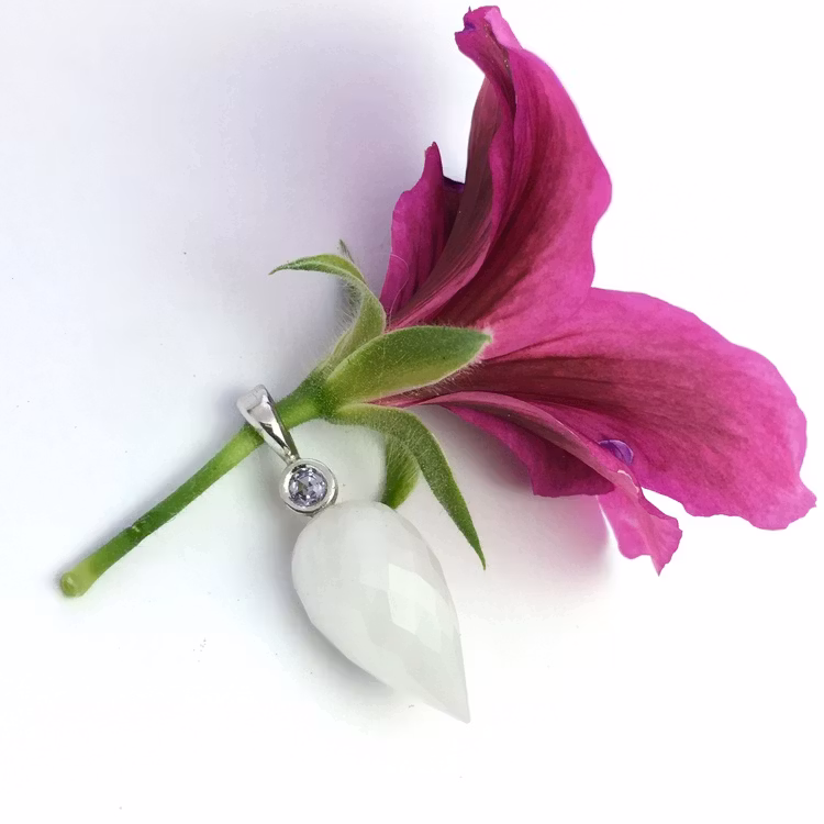 Underbart 18 K vitguldshänge med frostvit kvarts ca 10 x 18 mm med en ljuslila naturlig safir 2,9 mm och rosenslipad. Safiren är unik och skiftar i färg beroende på hur ljuset faller på den. En oxiderad silverkedja syns på bilden, notera att kedja köpes separat -->här<--.