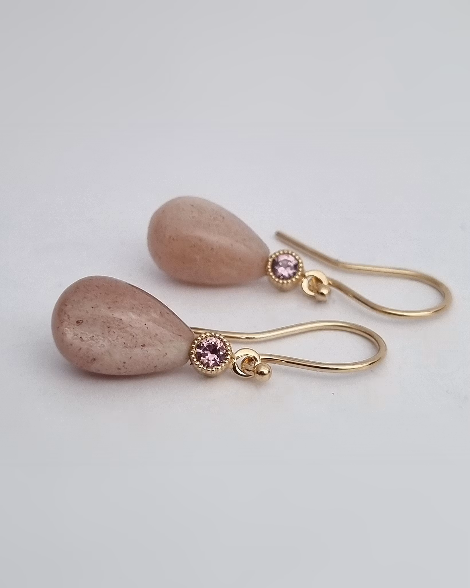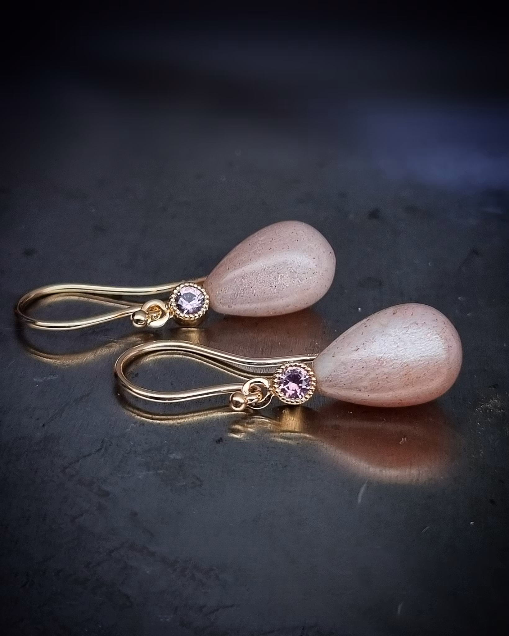 Handgjorda örhängen i återvunnet guld med unika rosa Månstenar och gammelrosa Spineller, fair trade. Månstenarna har vackra inneslutningar som ger dom liv och en unik look, väldigt vackra. Dom är kalla i tonen och har ett djupliggande skimmer som bäst kommer till sin rätt i verkligheten. Väldigt svåra att fånga på bild!