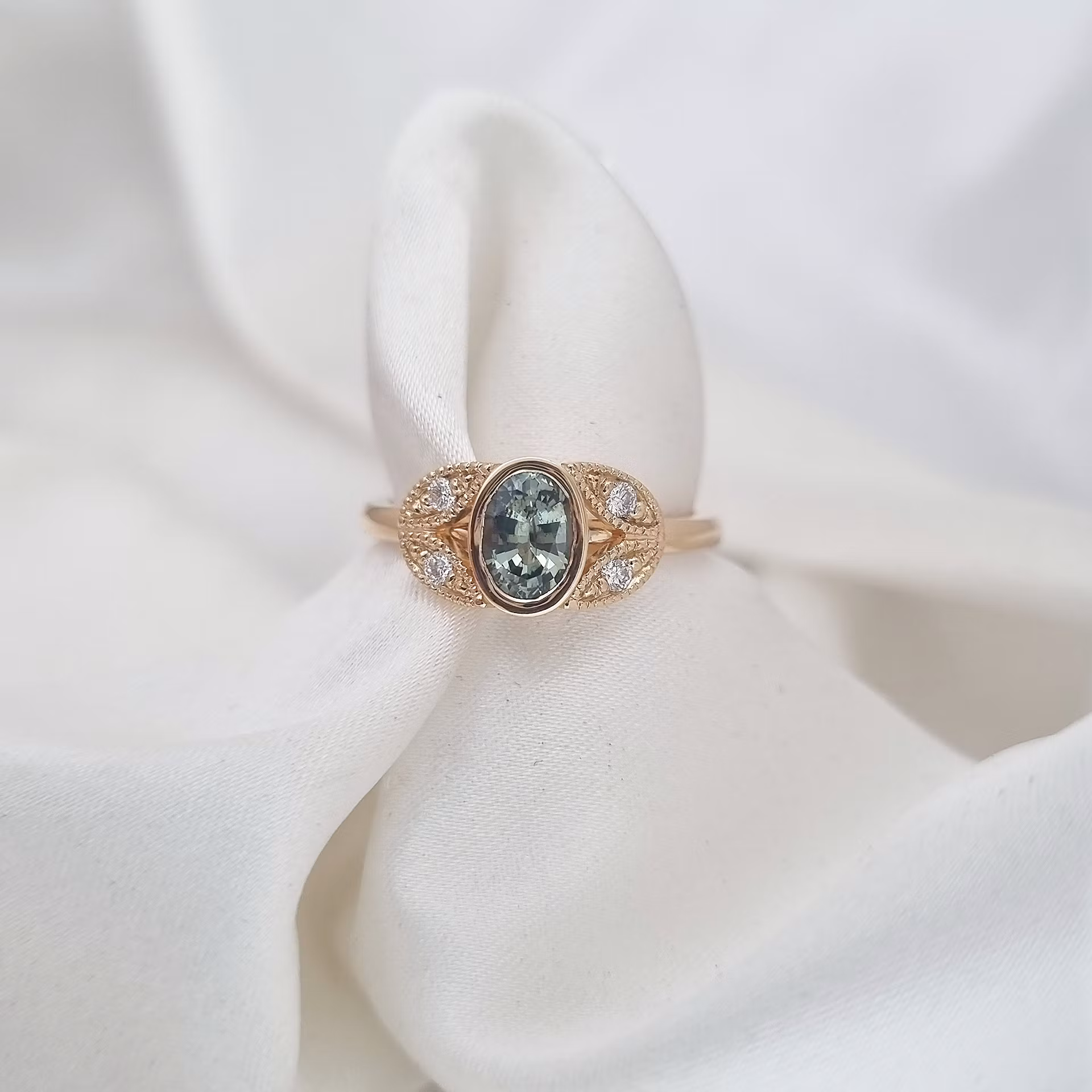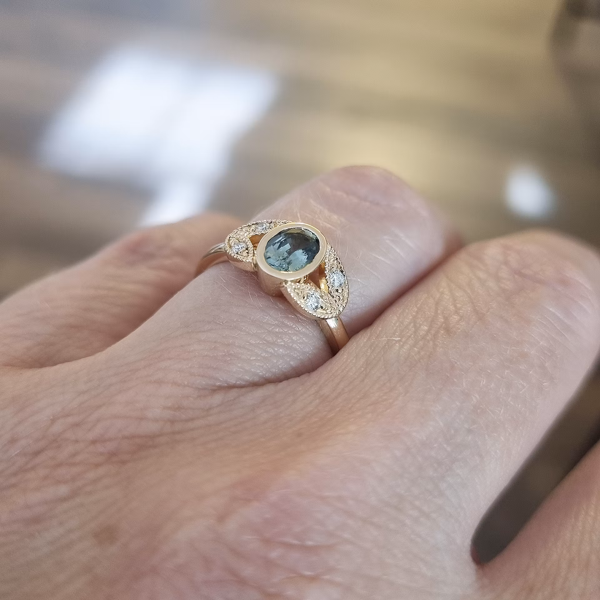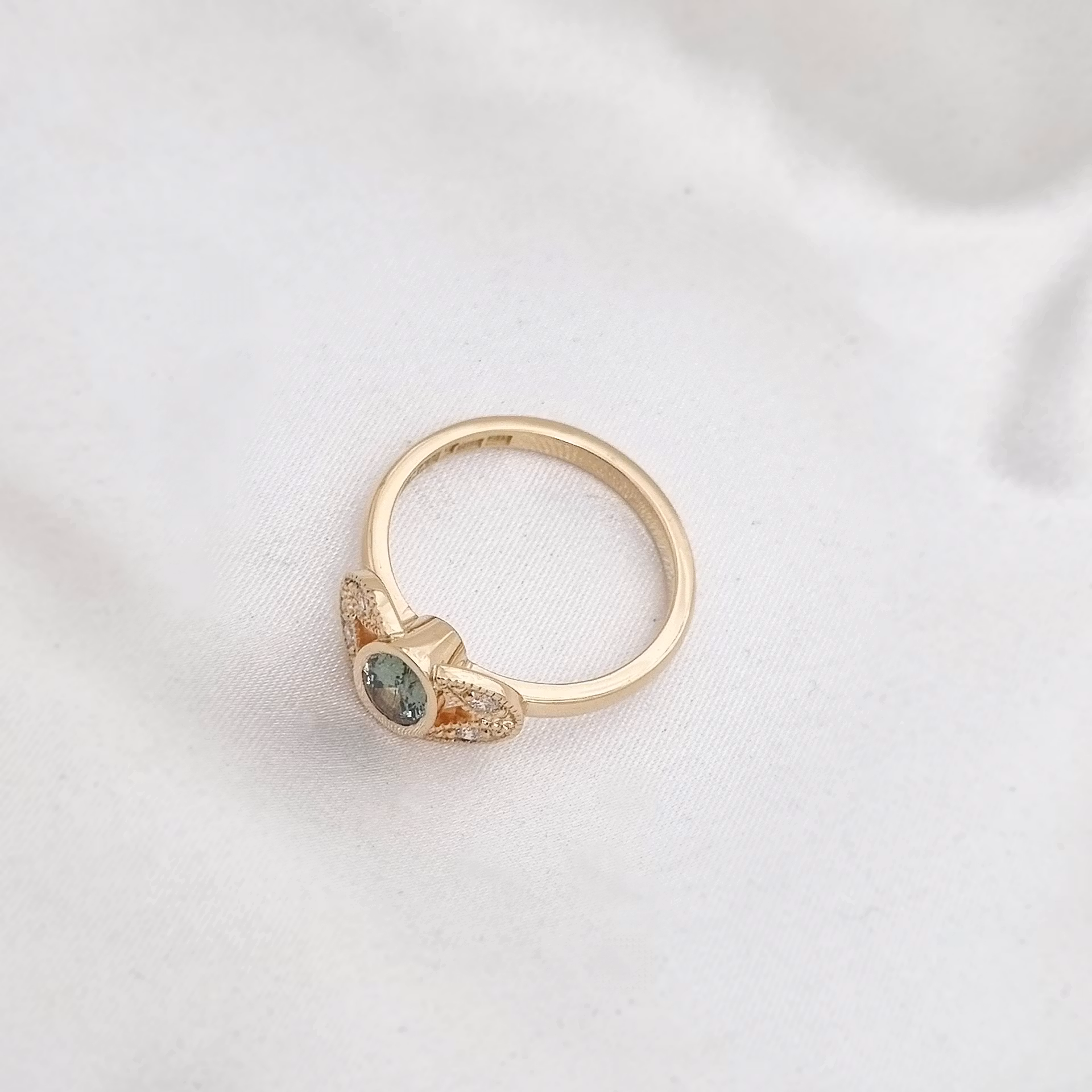 Handgjord safirring i 18 K återvunnet guld redo för leverans. I mitten sitter en helt fantastisk unik oval safir på 0,75 carat som är ljust grönblå i färgen. Stenen är etiskt utvunnen och kommer från norra Madagaskar. Fattningens ytterkanter mäter ca 8 x 6 mm och hela lövverket är 13,8 mm långt. Med en höjd av ca 4,5 mm är detta en förhållandevis låg modell som inte "sticker upp" eller fastnar i t ex kläder. På var sida om safiren sitter små vita á 0,02 ct briljanter fattade med miligrifkant, för den där extra ljuvliga vintagekänslan.