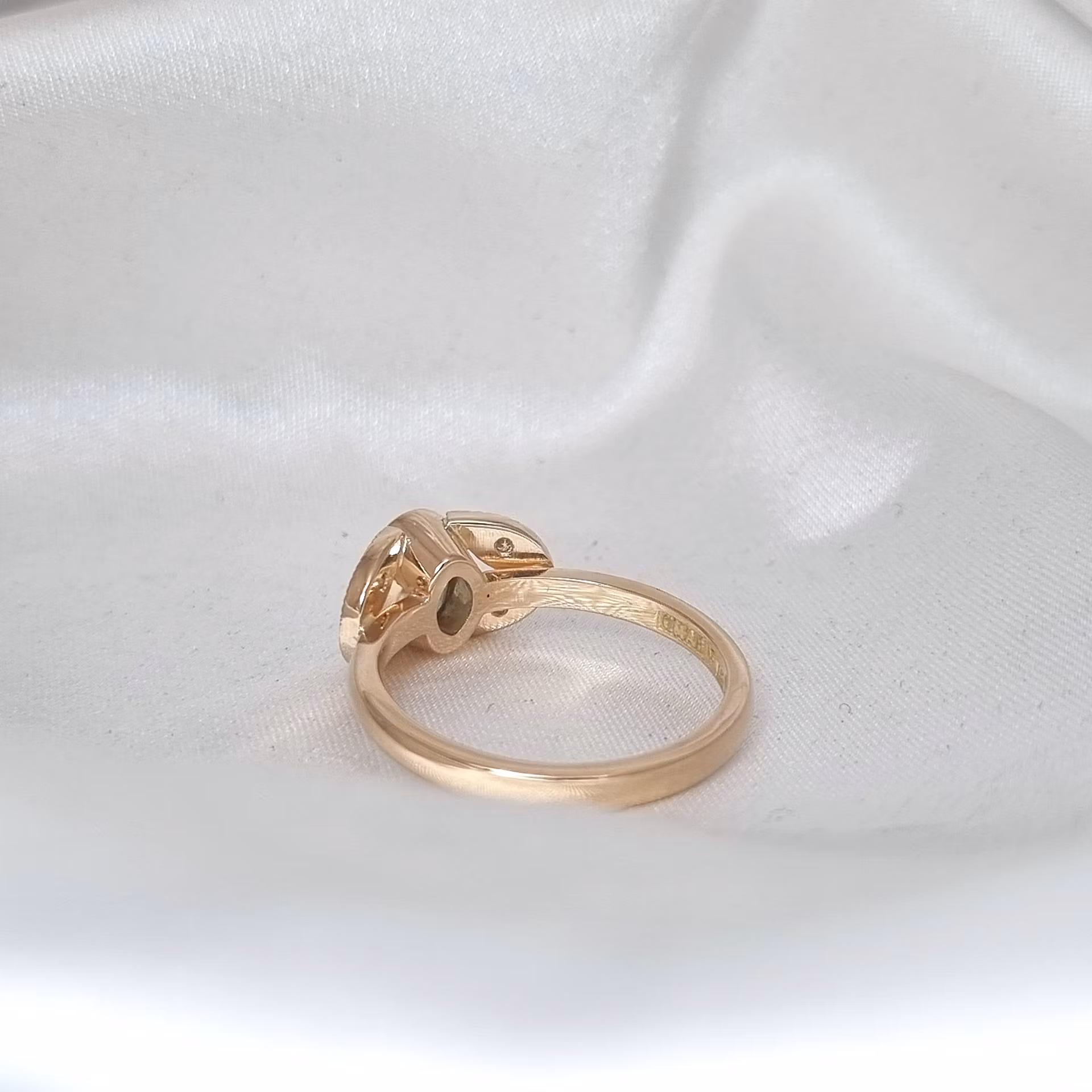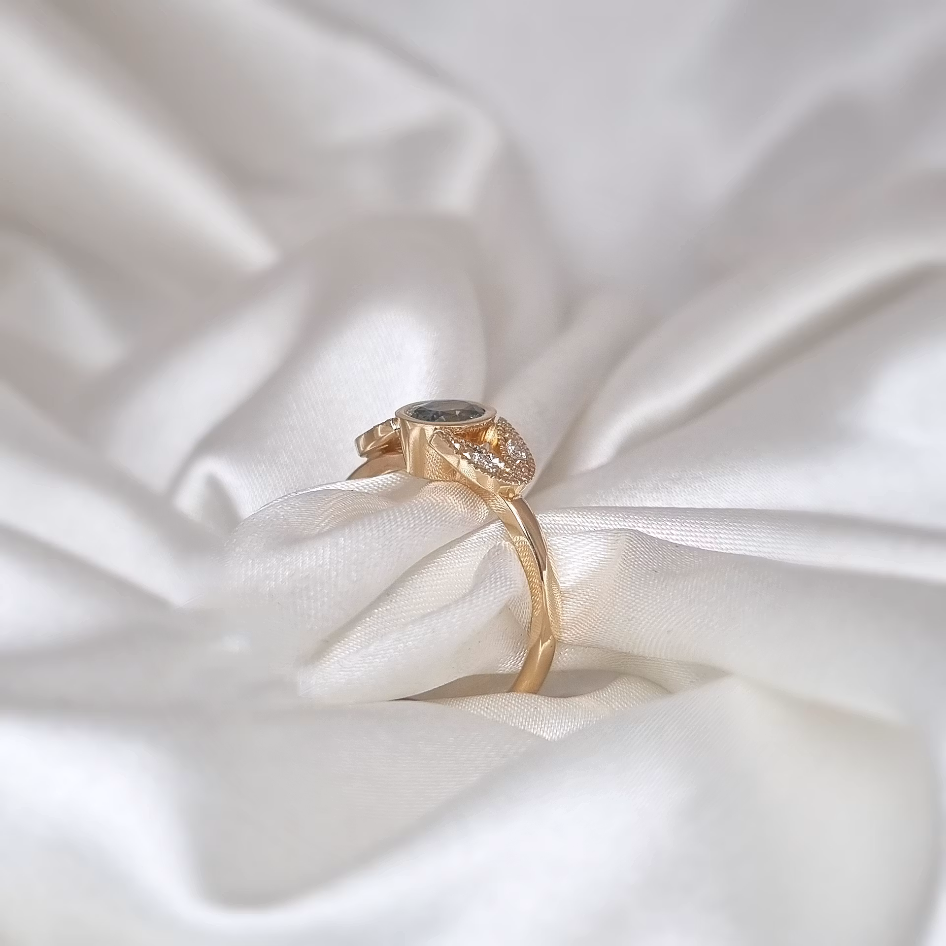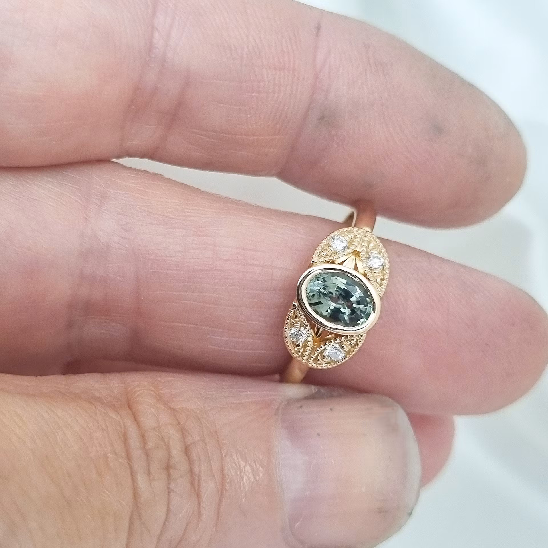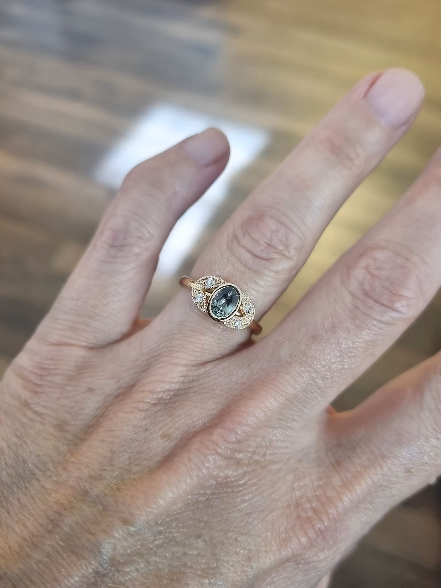 Handgjord safirring i 18 K återvunnet guld redo för leverans. I mitten sitter en helt fantastisk unik oval safir på 0,75 carat som är ljust grönblå i färgen. Stenen är etiskt utvunnen och kommer från norra Madagaskar. Fattningens ytterkanter mäter ca 8 x 6 mm och hela lövverket är 13,8 mm långt. Med en höjd av ca 4,5 mm är detta en förhållandevis låg modell som inte "sticker upp" eller fastnar i t ex kläder. På var sida om safiren sitter små vita á 0,02 ct briljanter fattade med miligrifkant, för den där extra ljuvliga vintagekänslan.