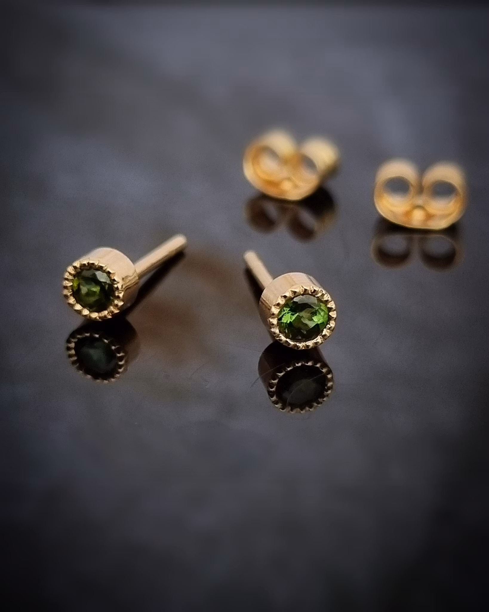 Underbart gröna Turmaliner fattade I 18K återvunnet guld.