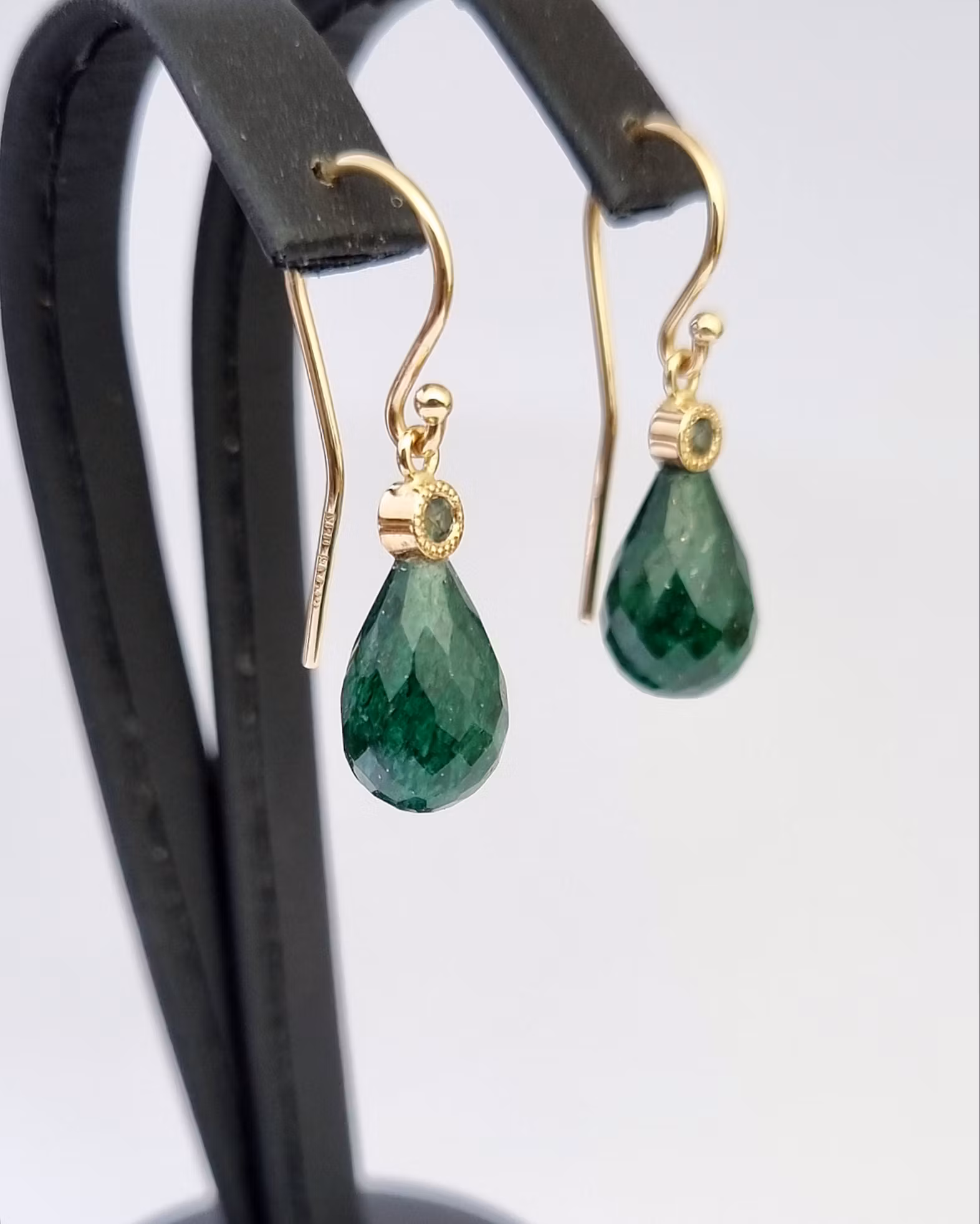 Handgjorda örhängen i 18K återvunnet guld med djupt gröna briolettslipade Aventuriner och grönblå safirer. Dropparna mäter ca 8 x 12 mm och safirerna är 2 mm. Hela örhänget är 30 mm långt.