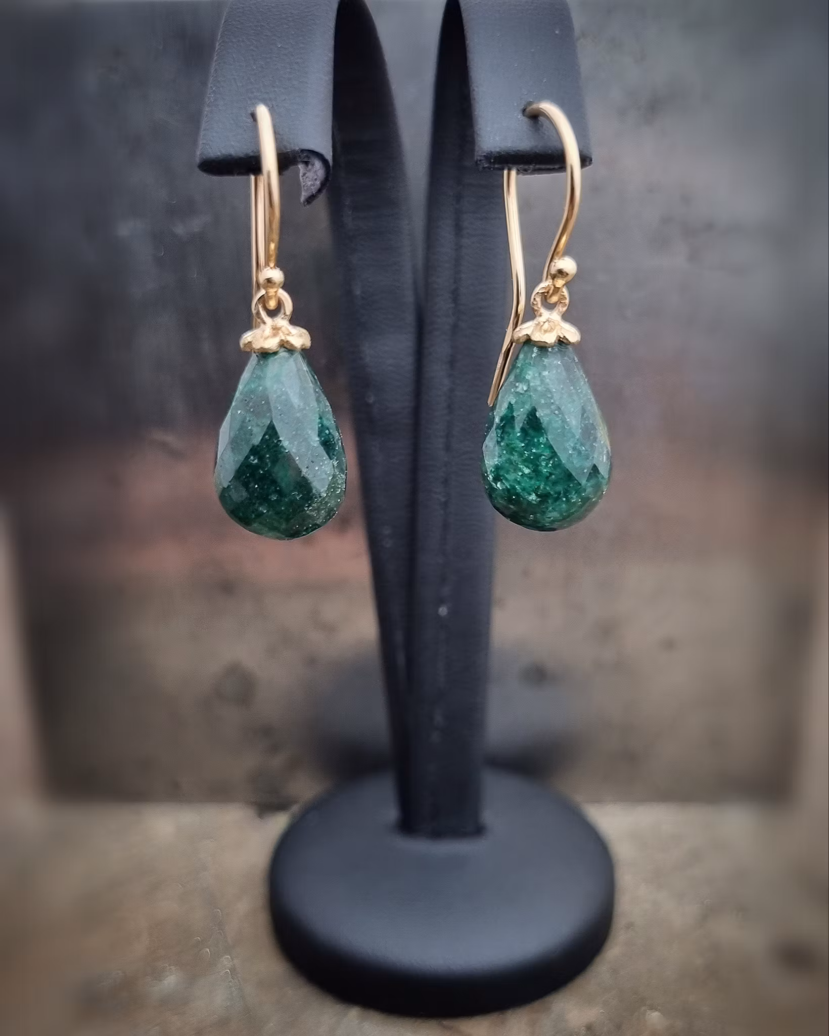 Gullvivor i återvunnet 18K med gröna Aventuriner. Ädelstenarna är briolettslipade och har vackra naturliga inneslutningar vilket ger dom en unik karaktär. Färgen är djupt grön och i solljus är dom mustigt skogsgröna i tonen.
