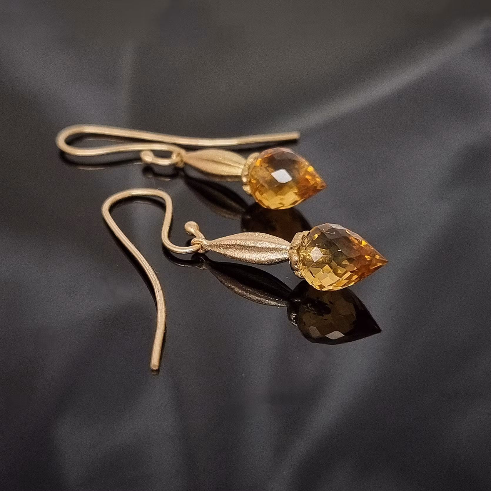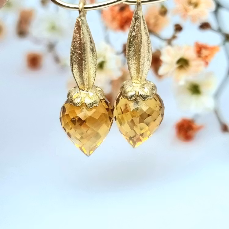 Gullviva med citrin i 18 K guld. Örhängena är handgjorda och detaljrika med en frostig yta. Stenarna mäter ca 9 x 7 mm och hela örhänget är ca 37 mm långt, inklusive kroken.
