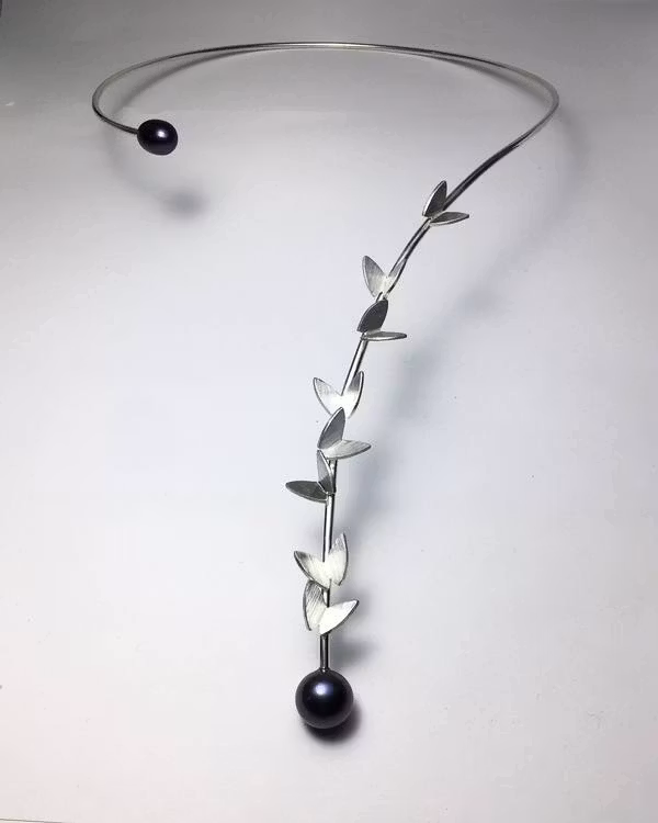 Silver och svarta sötvattenspärlor är fina vänner, det är sen gammalt! Den här lite ovanliga halsringen är unik i sitt slag och tillverkad i 925 sterlingsilver med en större rund samt en oval sötvattenspärla. Ligger otroligt fint om halsen.