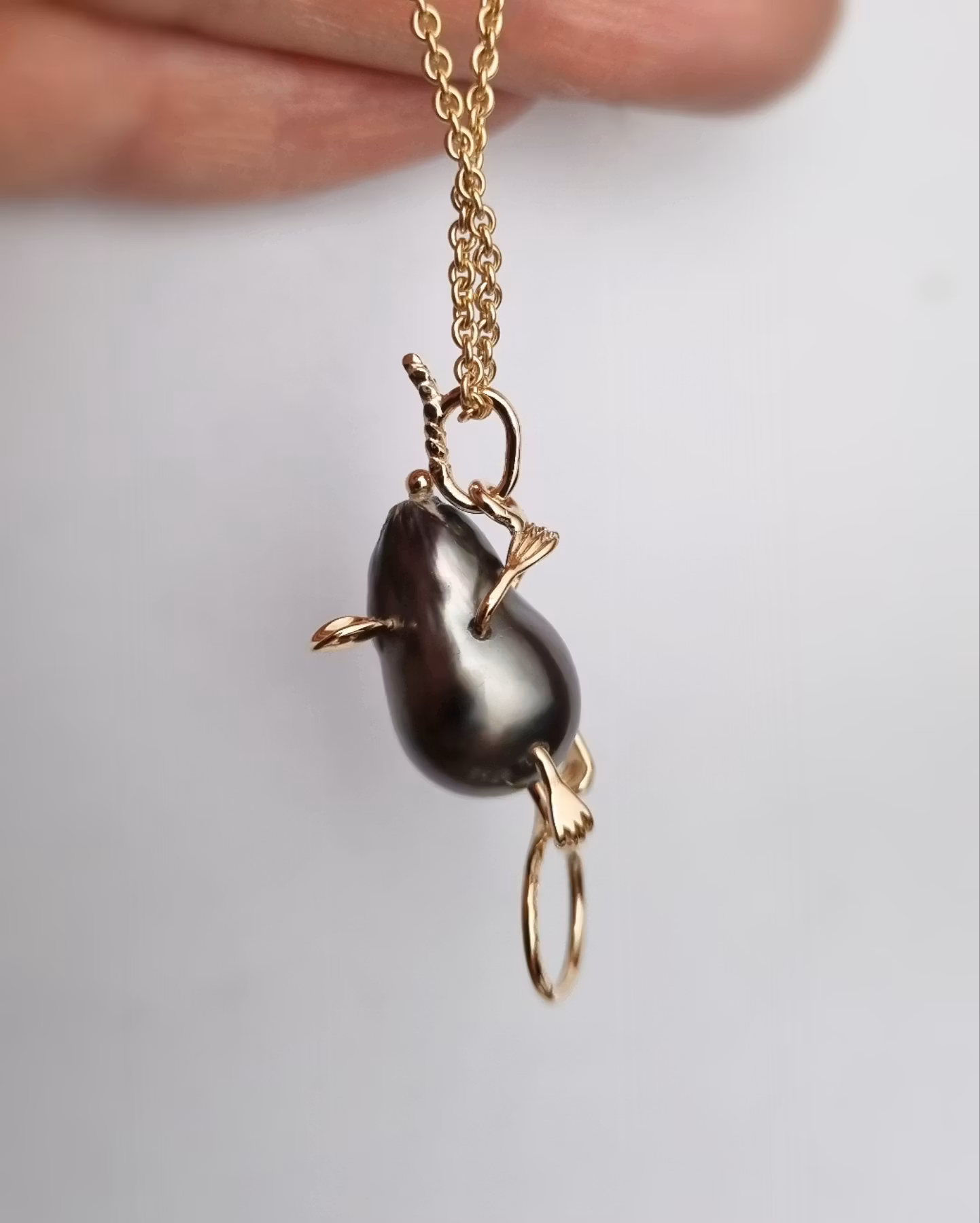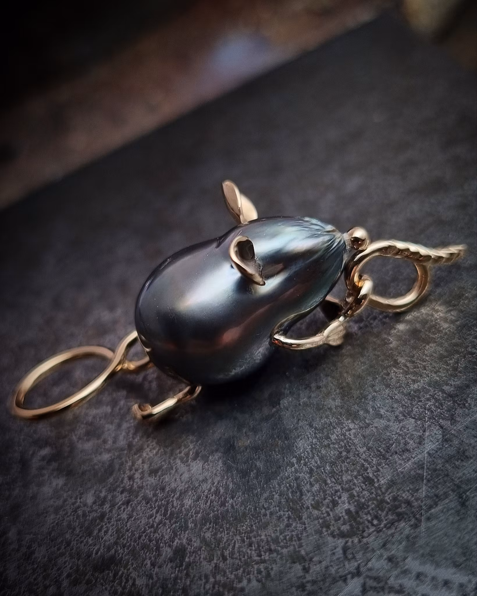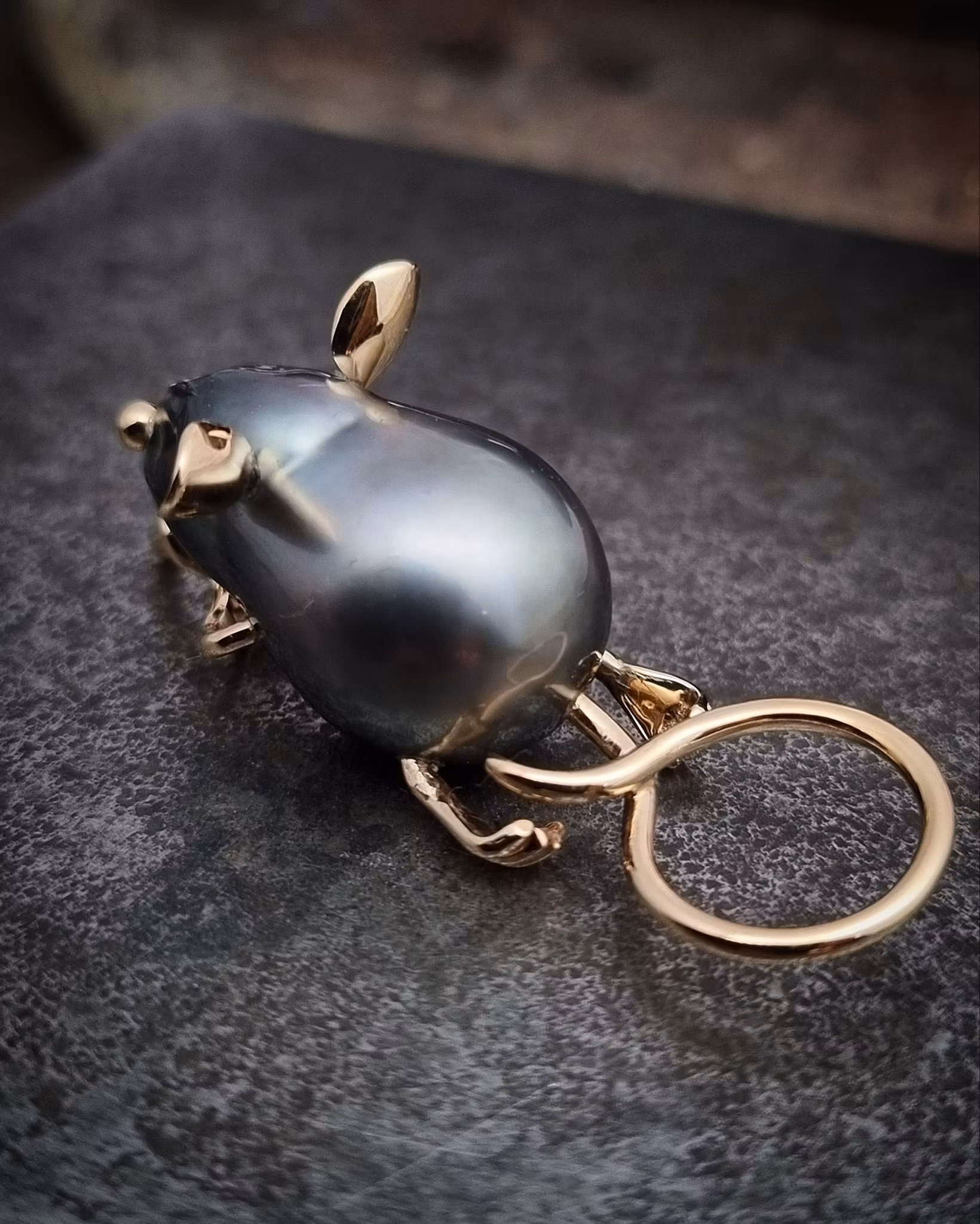 Äkta odlad Tahitipärla "mus" med handgjorda detaljer i 18K återvunnet guld. Pärlan är en sk one of a kind och det finns bara en. Den är etiskt utvunnen, har en barock form och kvalitét B+. Pärlan mäter 12,7 x 21 mm och hela hänget inklusive ögla/"veteax" och svans är 45 mm långt.