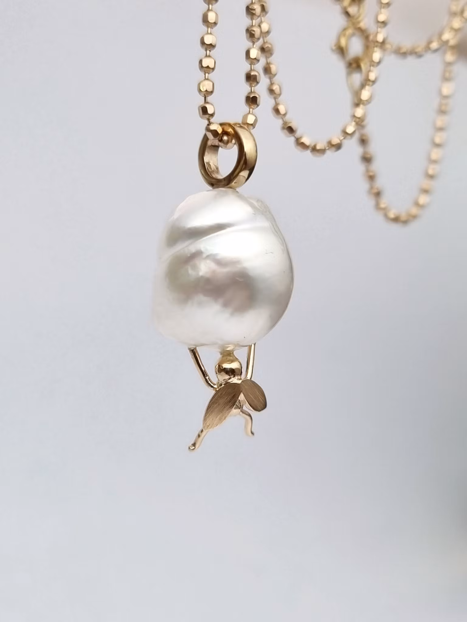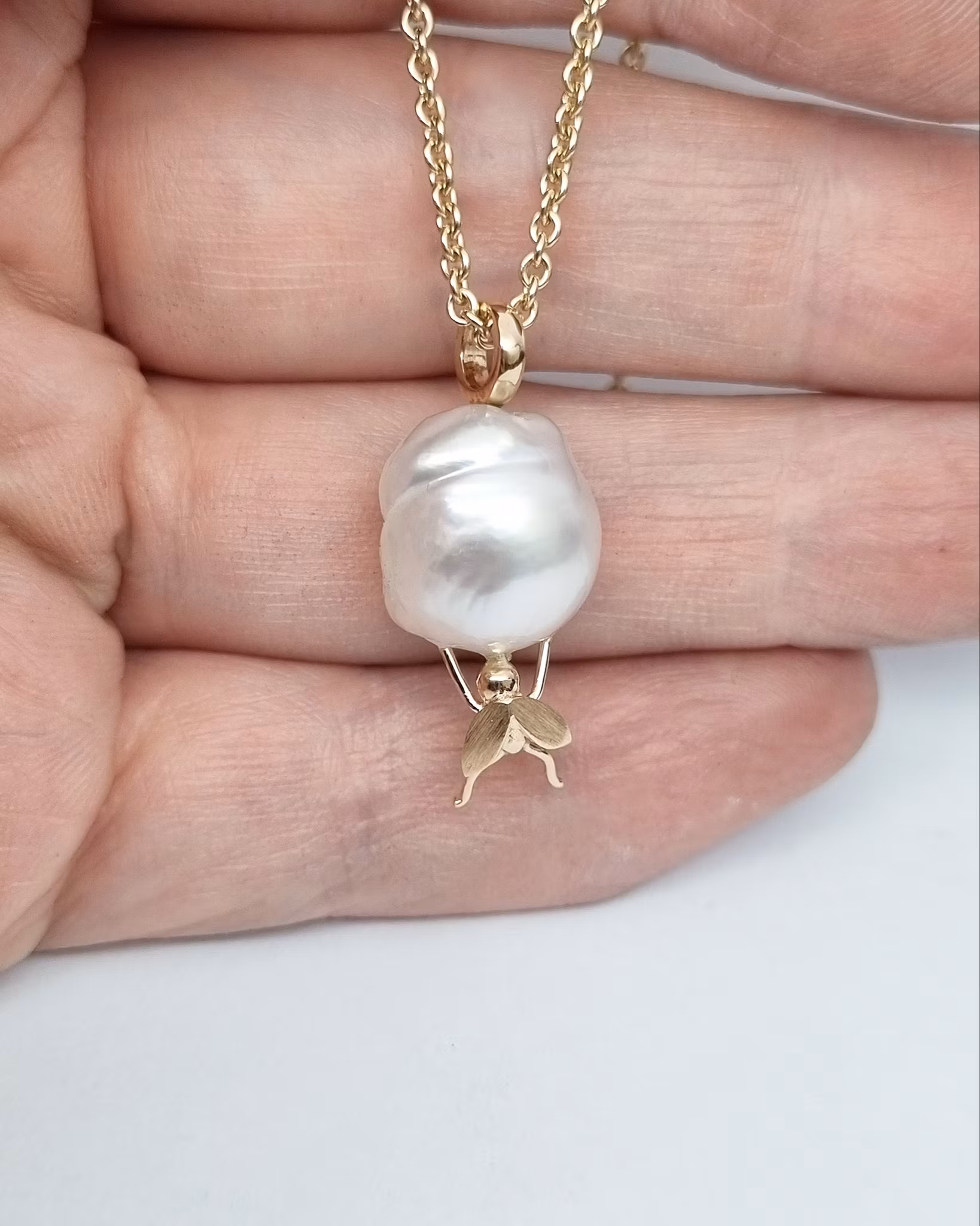 Äkta odlad söderhavspärla, etiskt utvunnen med en fantastisk barock form och en ljuvlig lyster. Pärlan kommer från Australien och är gräddigt vit i färgen.