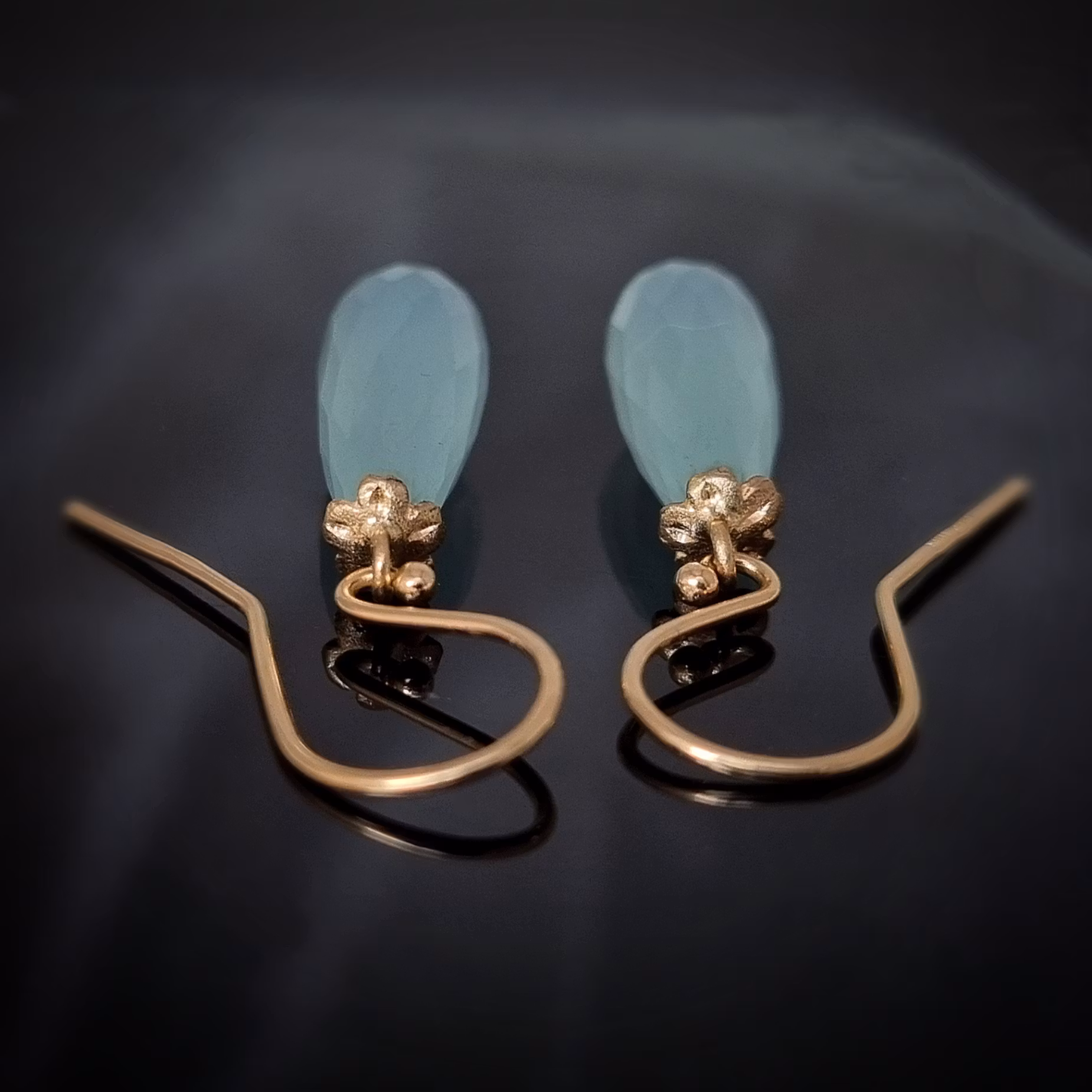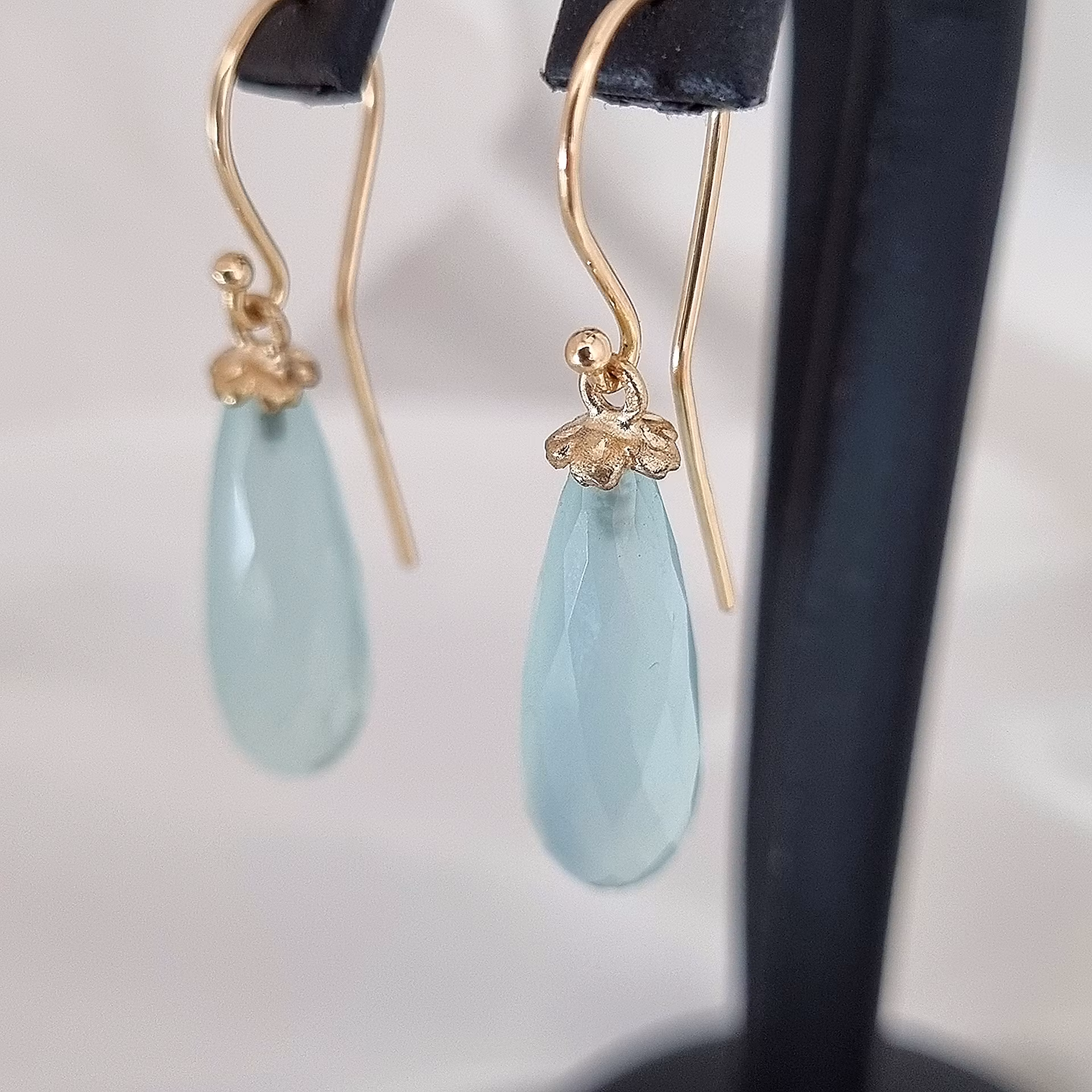 Helt magiskt vackra Onyxer i isande ljusblå nyans med lätt grönaktigt inslag. Briolettterna är monterade med en gullvivablomma i 18K återvunnet guld.
