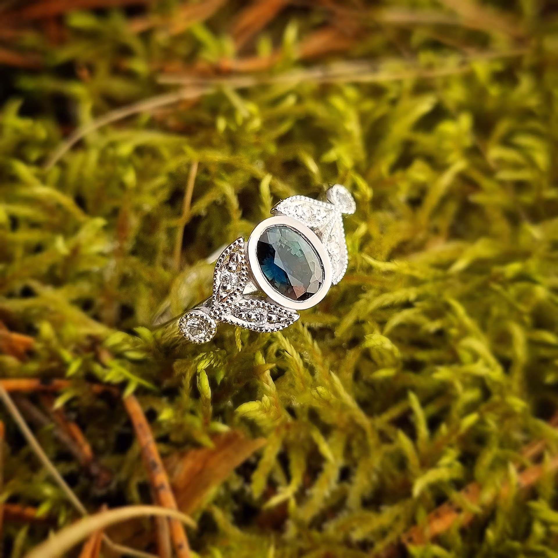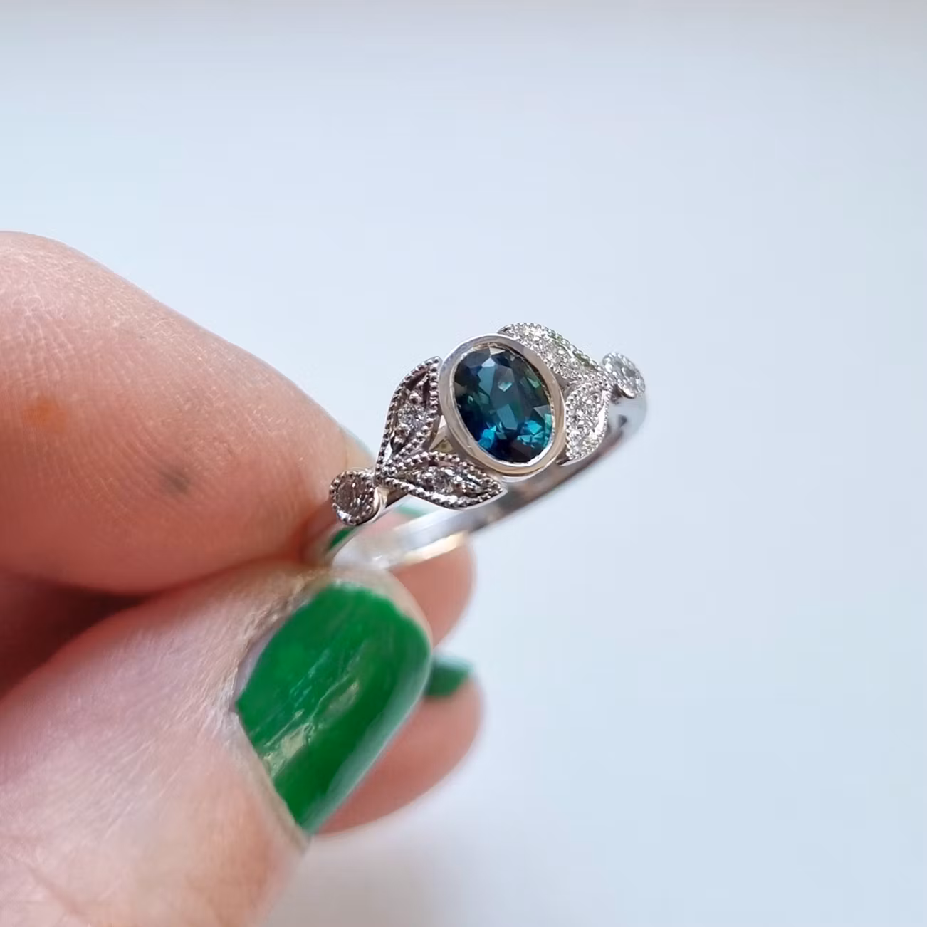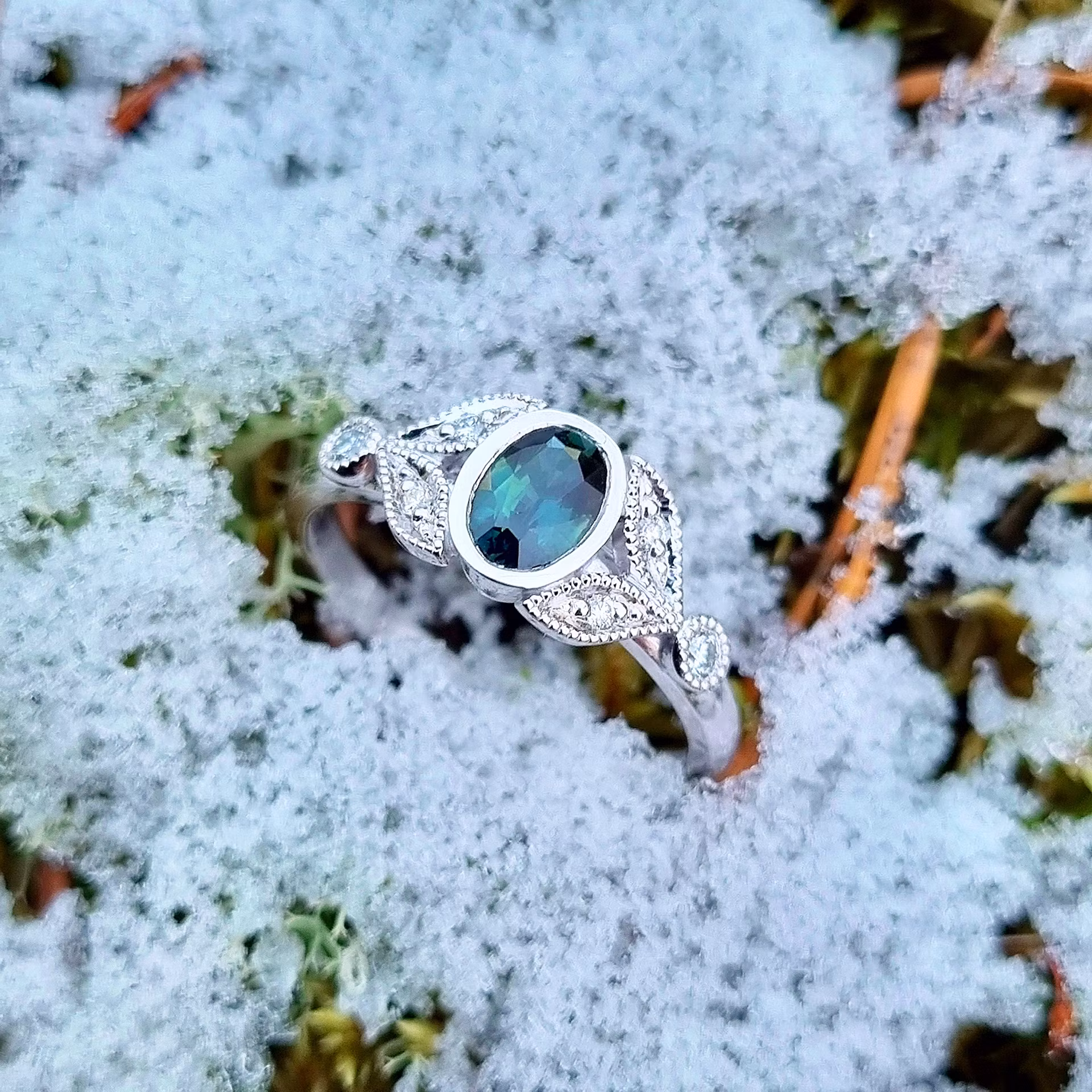 En helt fantastisk oval tealsafir från Madagaskar fattad i 18K återvunnet vitguld ackompanjeras av totalt 6 st 0,10 ct vita briljanter. Safiren väger 1,02 ct och är etiskt utvunnen. Den har en väldigt djup naturlig tealfärg som skiftar mellan grön och blå, en riktig shapeshifter. Bilder gör inte denna safir rättvisa! Ringen är vintageinspirerad i modellen och kantad med miligrif för den där trevliga antika känslan.
