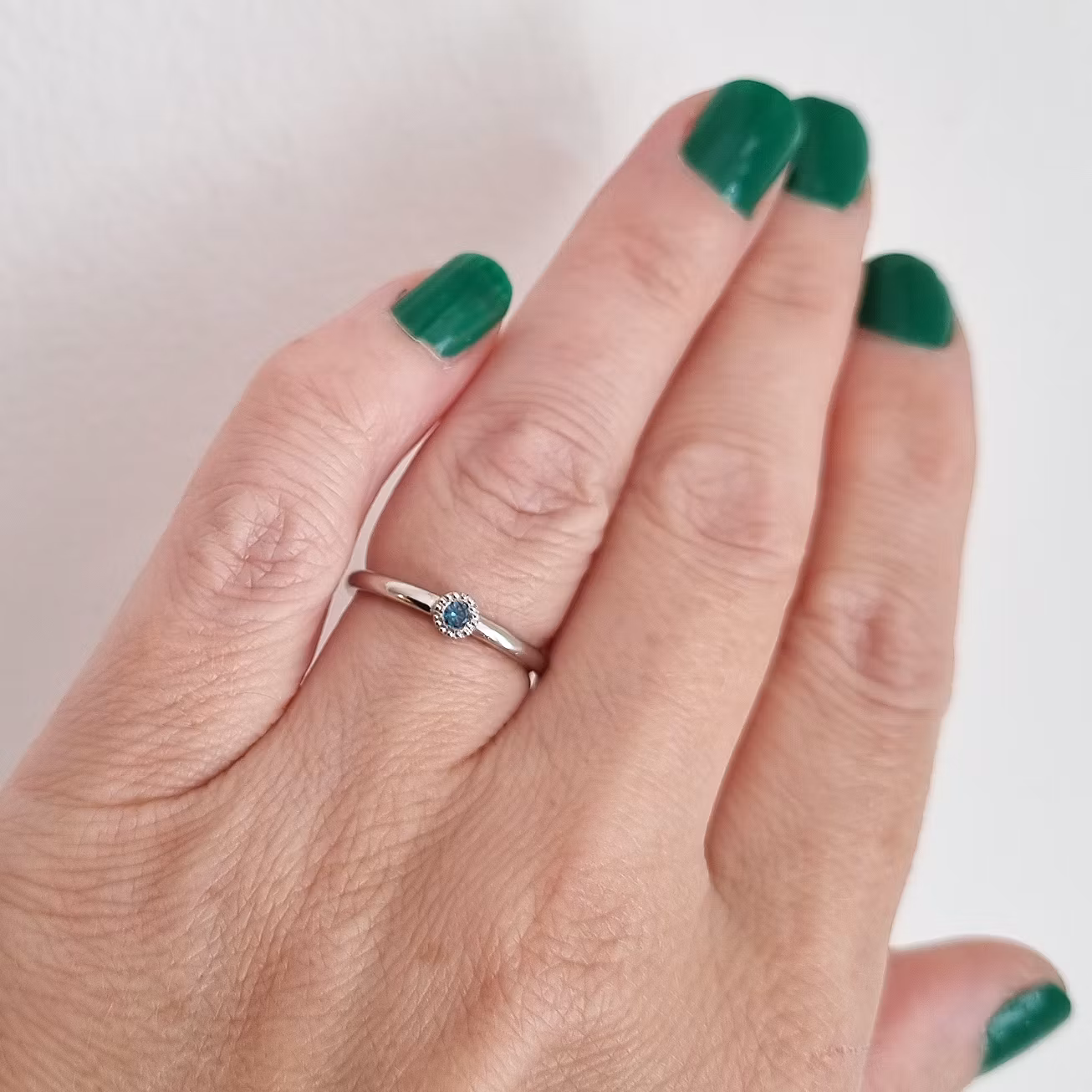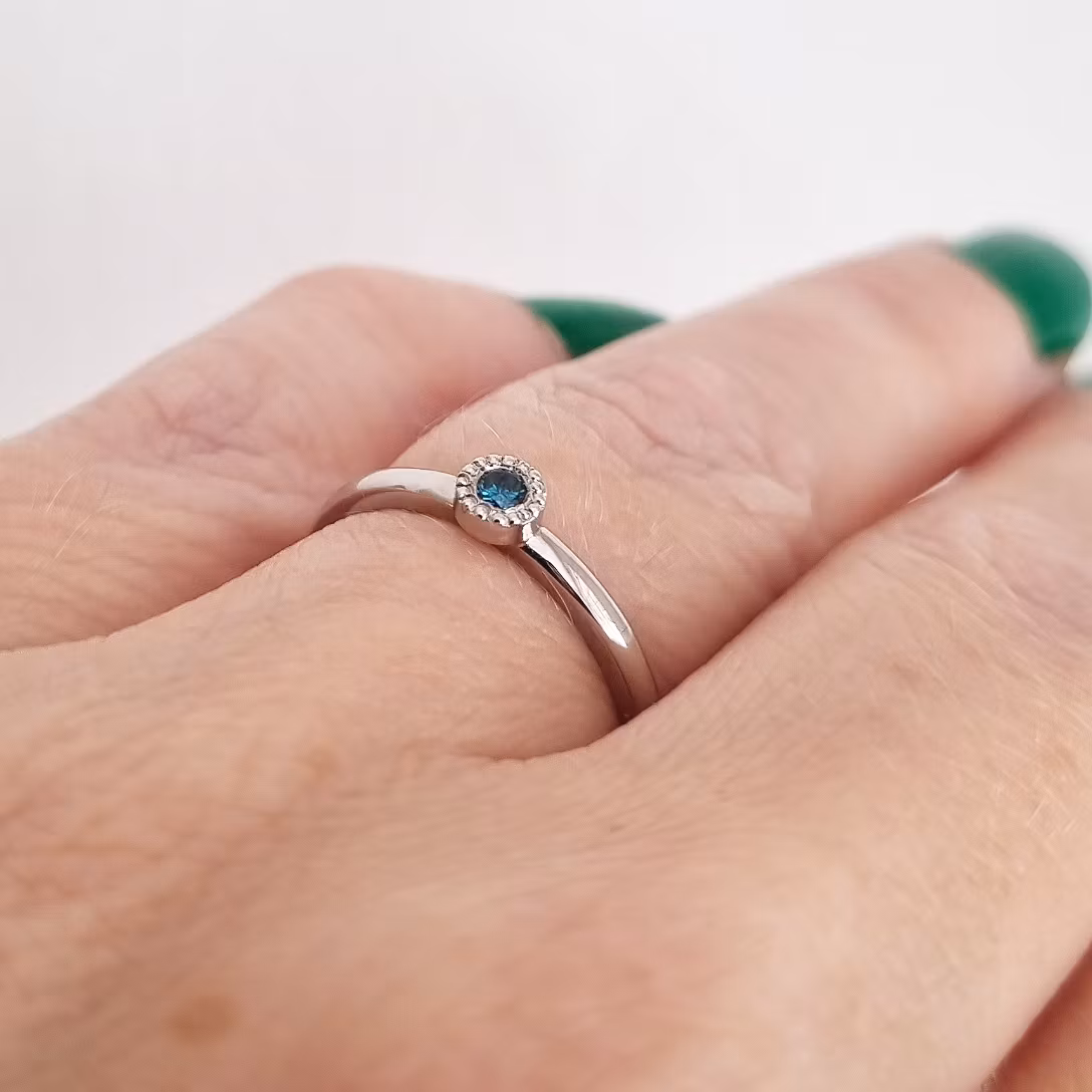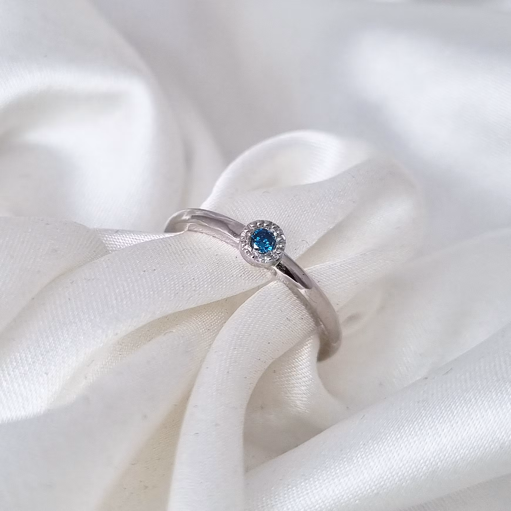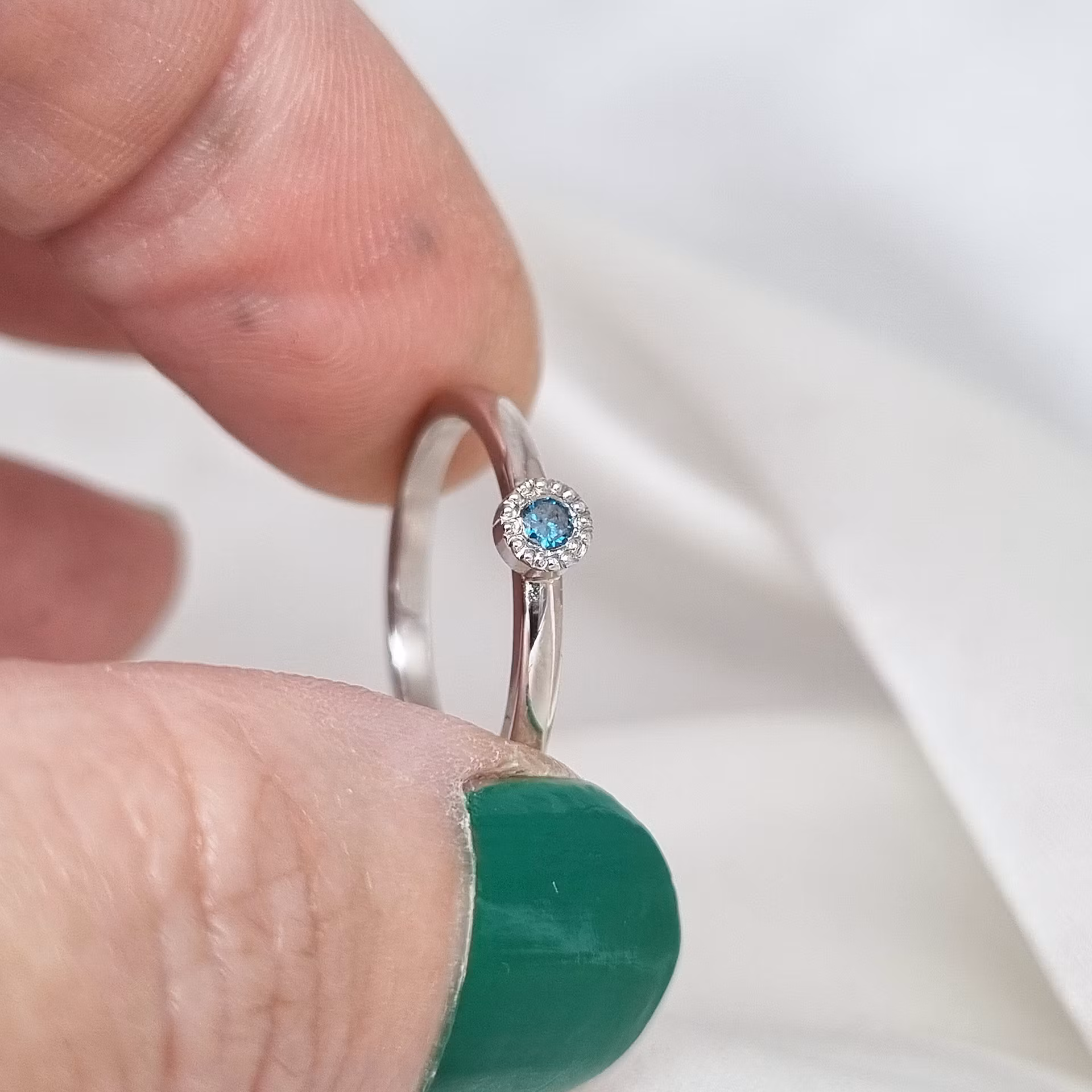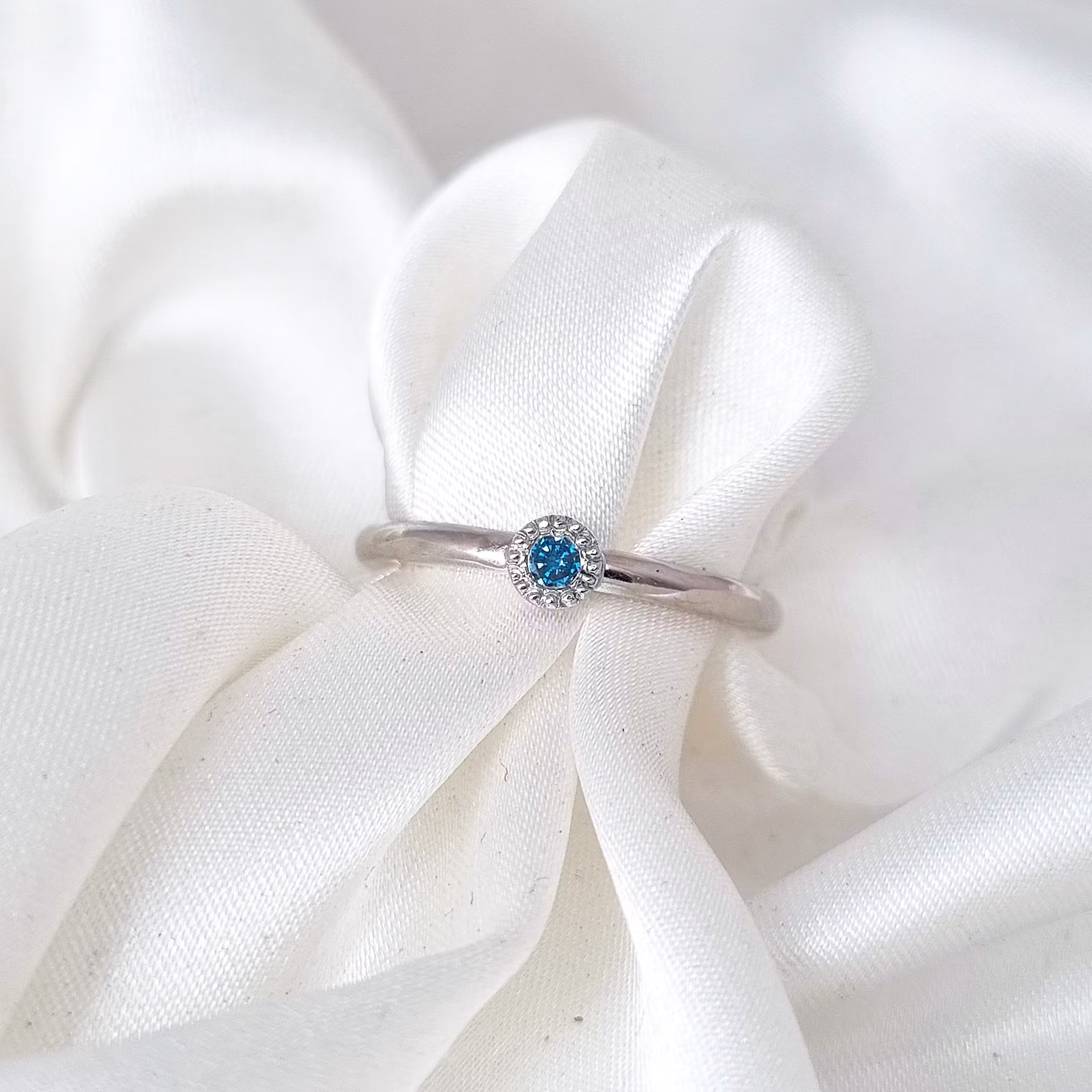 Modellen är en solitär med 0.07 ct sky blue diamant i en stilren låg fattning. Ringen är gjord för att bäras ihop med flera då fattningen sitter uppepå skenan istället för att vara infälld, så kallad 'stack ring'. Skenan mäter ca 2 mm i bredd och 1,6 mm i höjd. Ringen är i storlek 53,5/17 och går att ändra. Är du osäker på din storlek? Beställ ett ringmått av mig. Detta kan returneras inom 14 dagar och det är endast portot du betalar för.