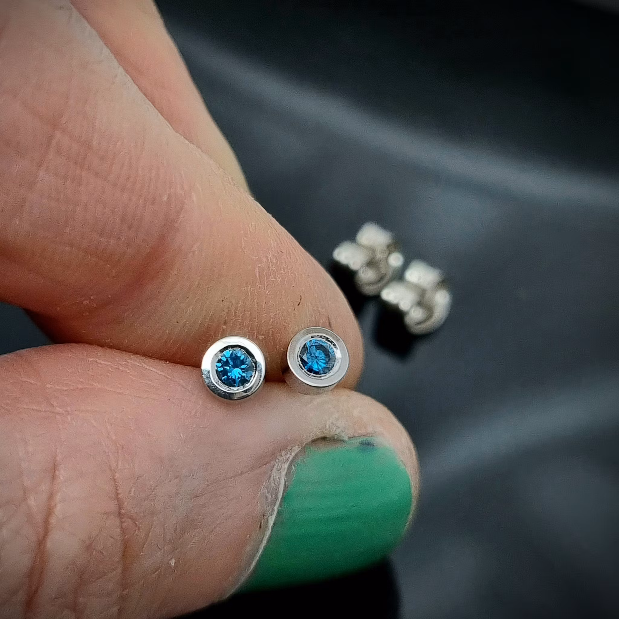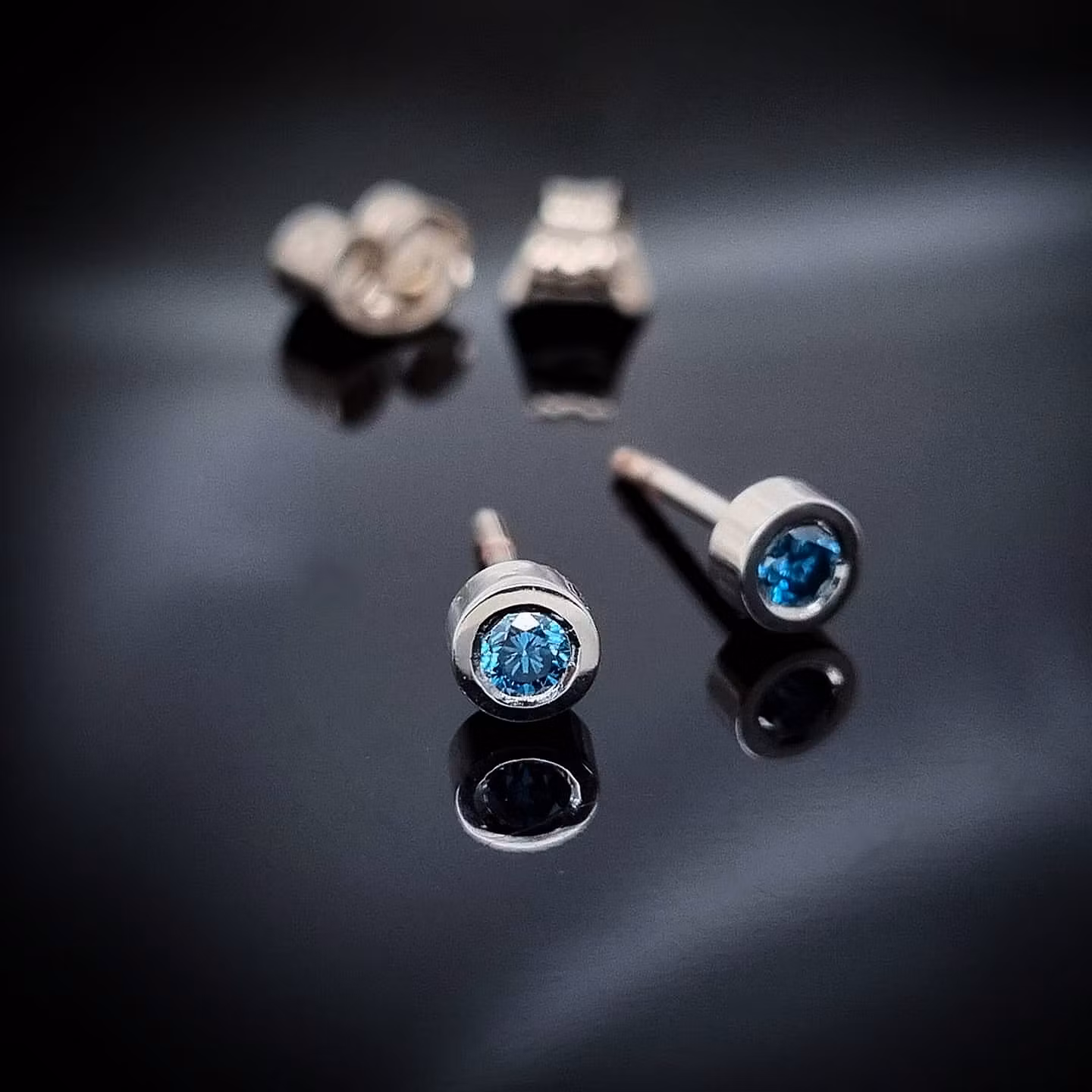 Briljantörhängen i 18 K vitguld med två st 0,07 ct sky blue diamanter. Låga, släta fattningar på stift. Örhänget mäter 4 mm i yttermått och passar perfekt till vardags.