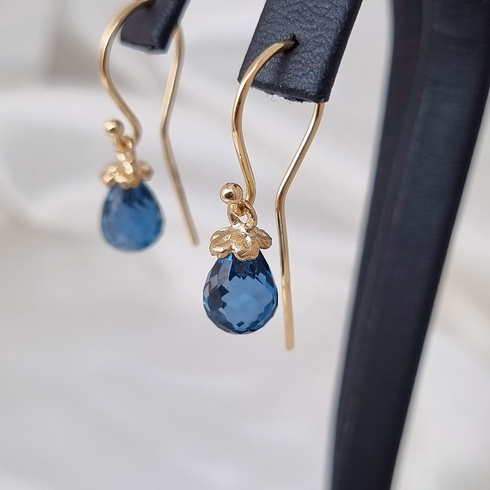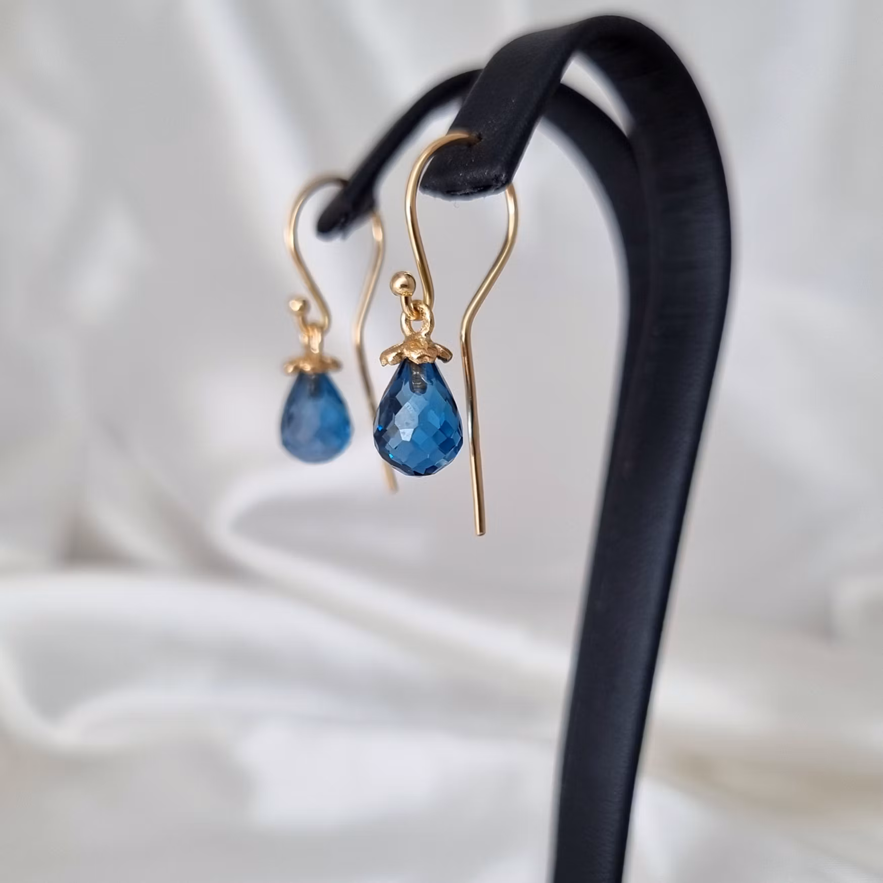 Örhängen i 18K återvunnet guld med Londonblå Topas. Topaserna har en djupblå lysande fin färg och är briolettslipade. Måtten på stenarna är 6 x 8 mm och hela örhänget mäter ca 25 mm inkl krok.
