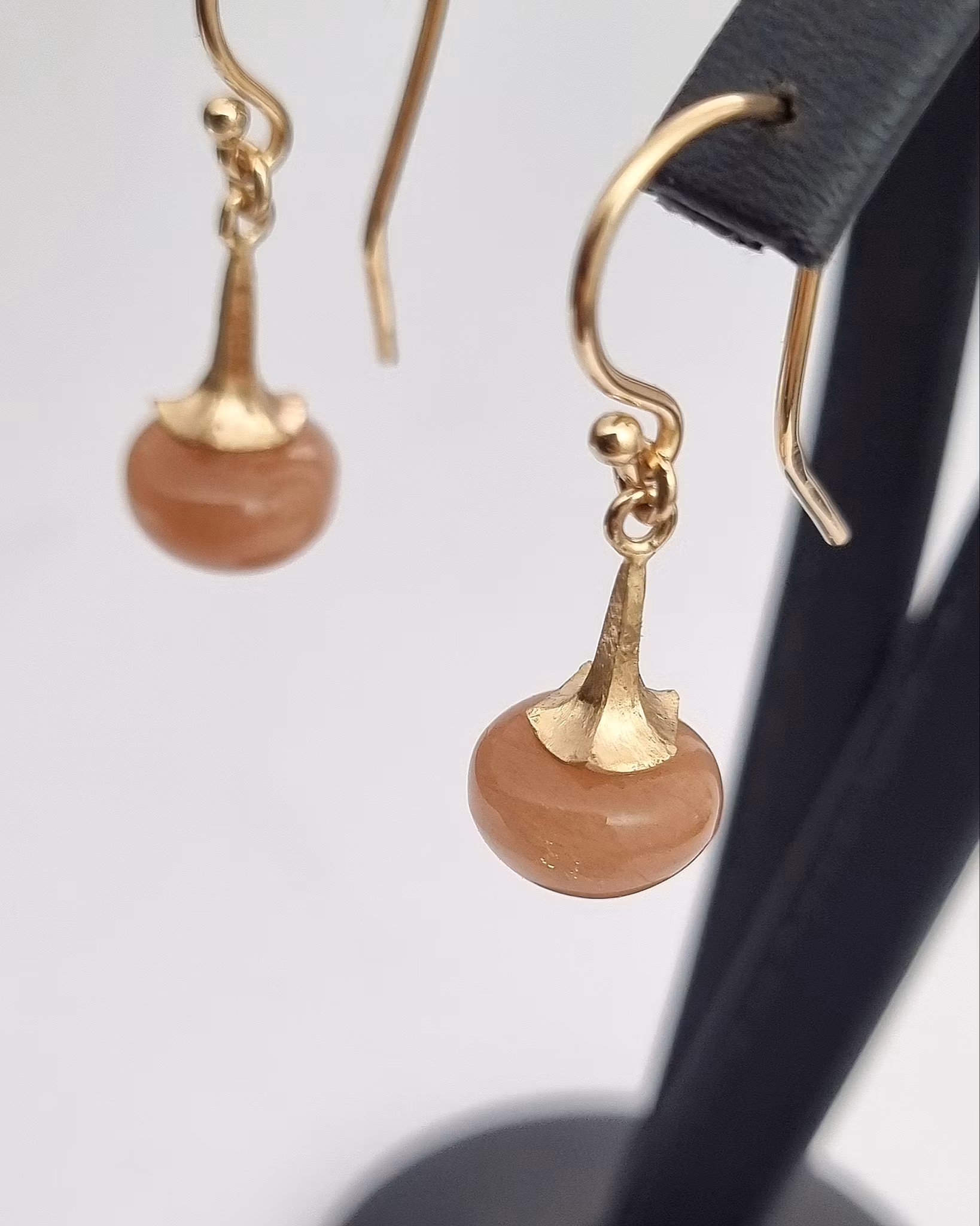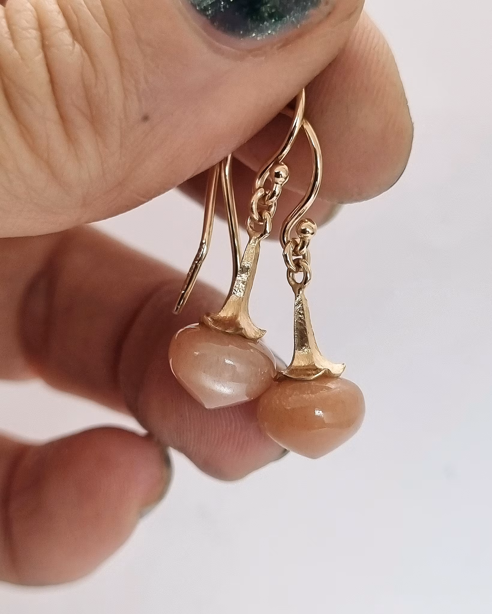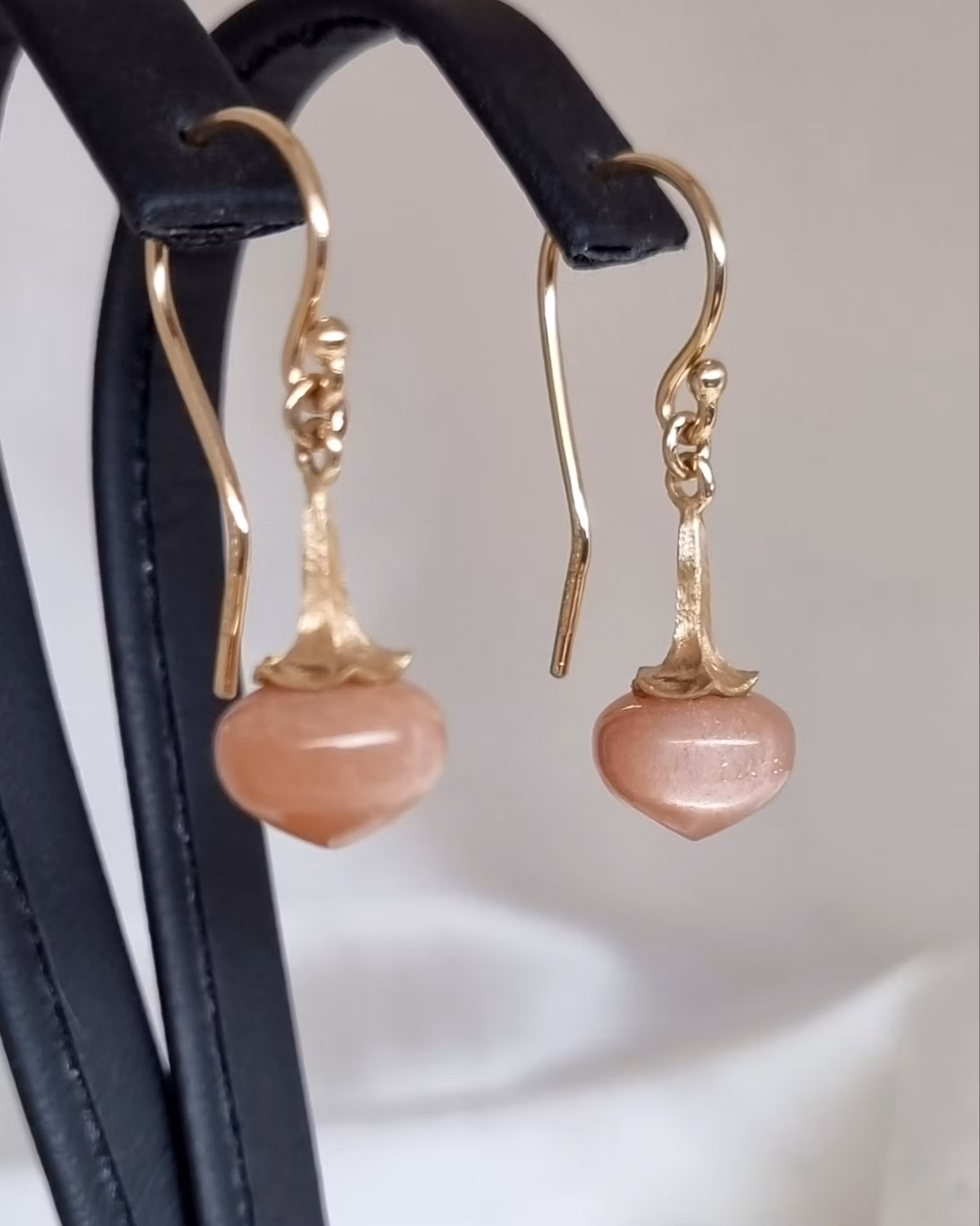 Underbart persikofärgade Månstenar matchas med Änglatrumpeter i återvunnet 18K guld. Stenarna har naturliga inneslutningar vilket gör dom silkesskimrande i olika vinklar. Färgen är persikorosa och silvrig med ett diskret glitter när solen träffar dom. Oerhört vackra, bilderna ger dom ej rättvisa! ♡