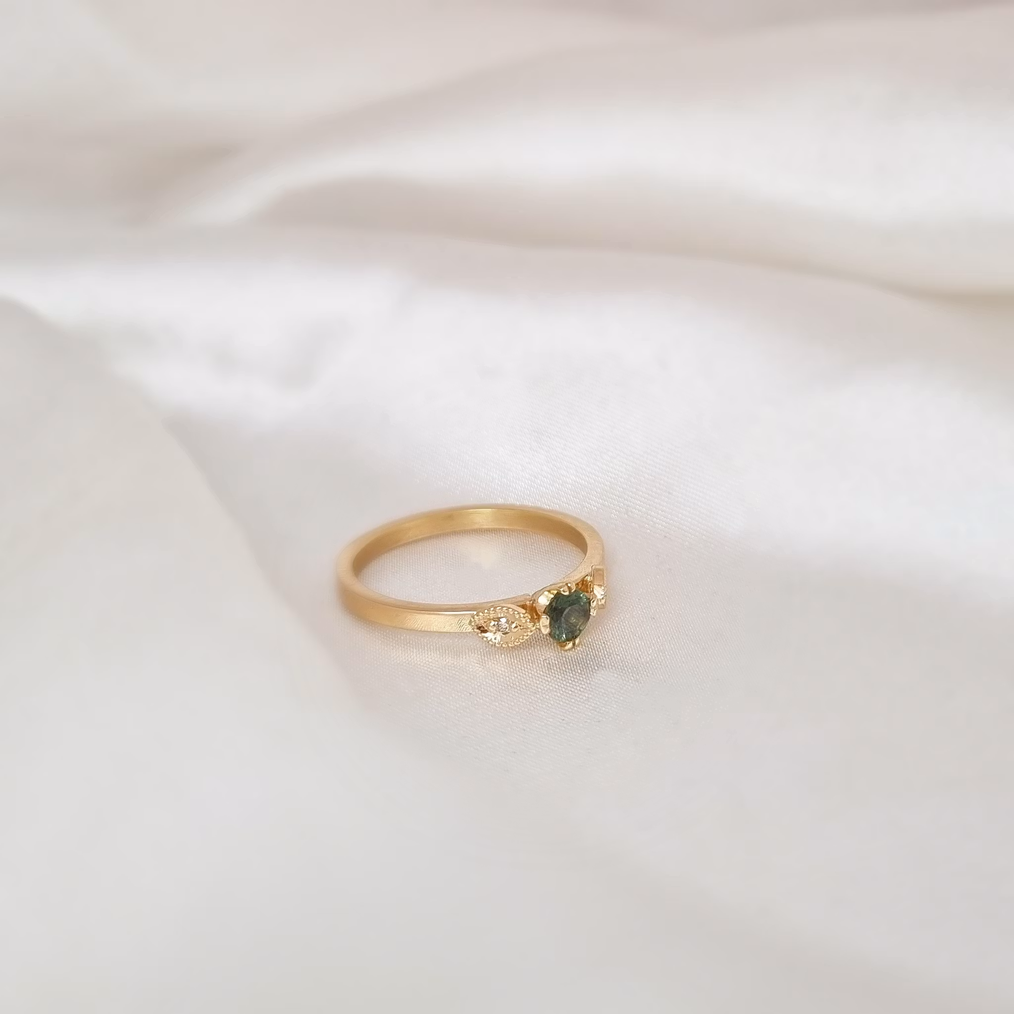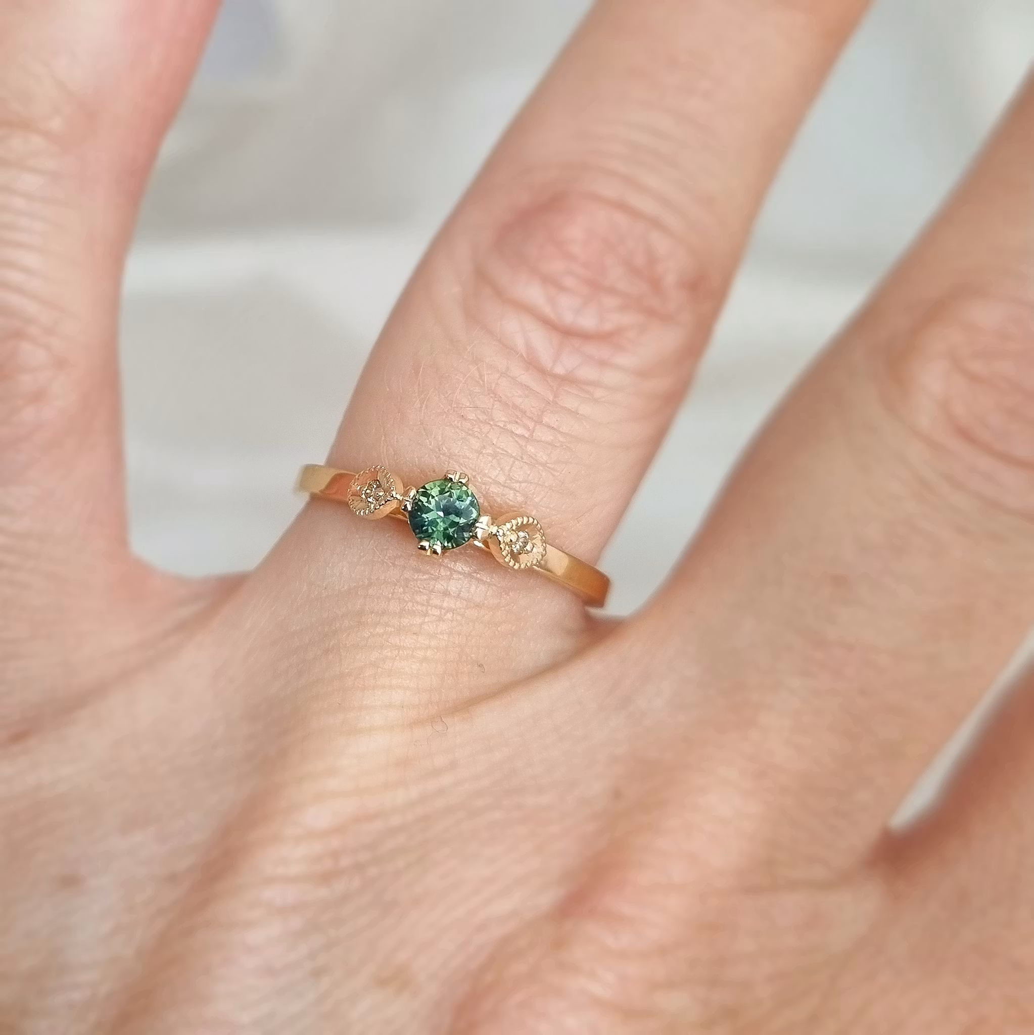 Underbart vacker grön safir med en djup härligt mossgrön färg. Stenen sitter fattad i klor med champagnebriljanter på sidorna. Ringen är gjord för att kunna bäras ihop med t ex en alliansring, då fattningen och detaljerna sitter uppepå skenan istället för nedsänkt. En väldigt söt ring som passar utmärkt att bära till vardags. Safiren mäter 4 mm och är briljantslipad. Ringskenan är kantig och har måtten ca 1,8 x 1,6 mm. Storleken är 18,25/57,5 och går att korrigera både ut och in. Meddela mig på [email protected] vilken storlek du önskar så ordnar jag detta.