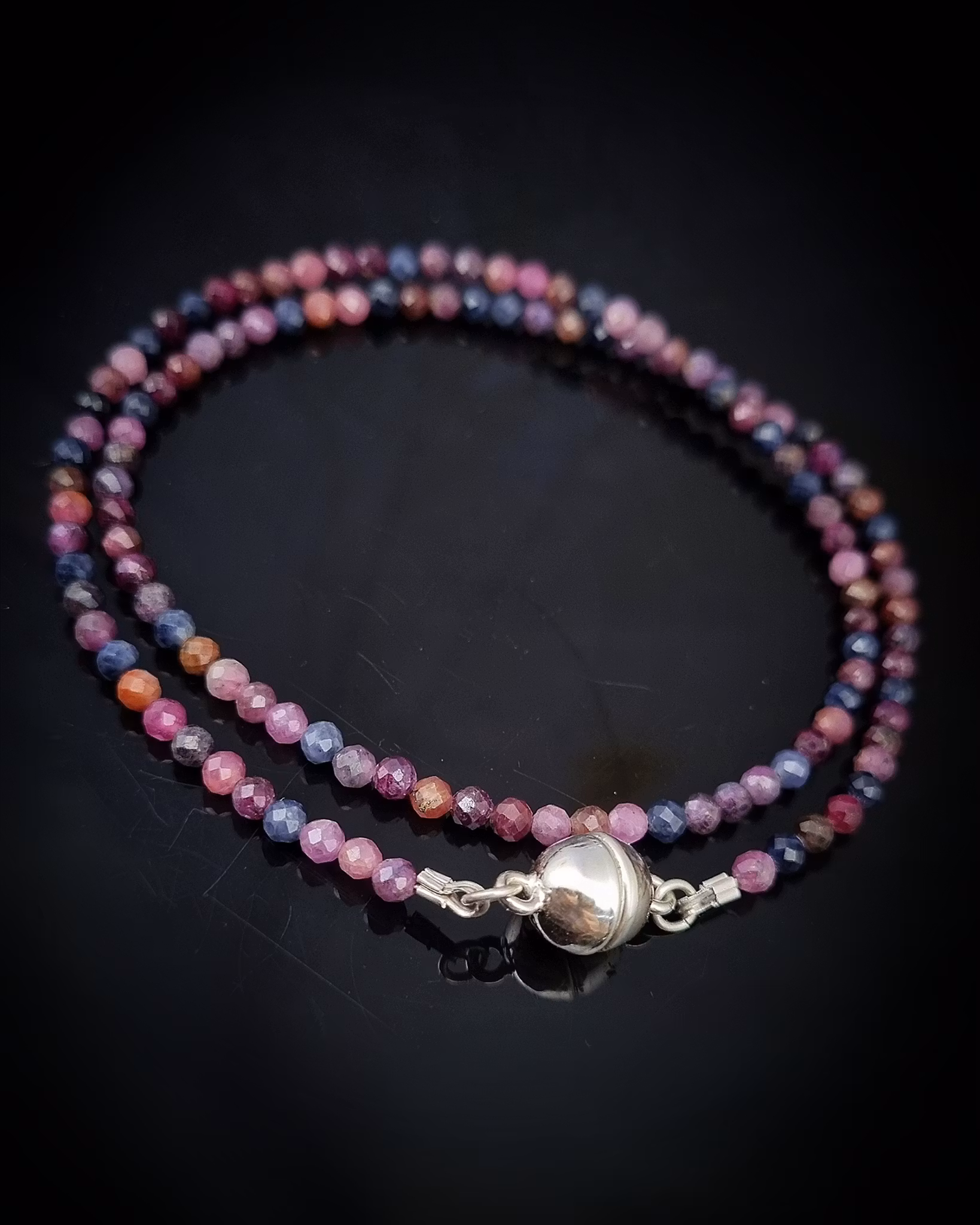 Glittrigt collier med Safirer i olika naturliga färger. Oerhört effektfullt och en uppvisning av hur många olika färger Safirer kan ha!