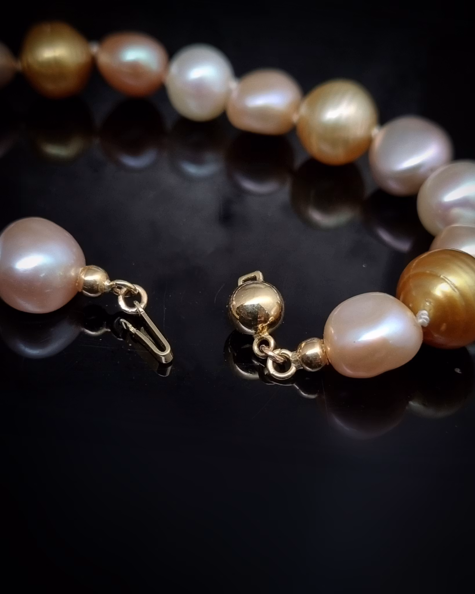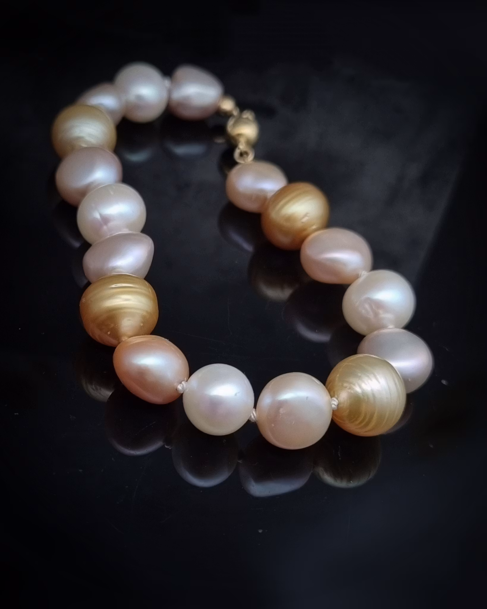 Ljuvlig barock mix av äkta odlade sötvatten & söderhavspärlor i toner av vitt, askrosa, aprikos & guld. Längd 19,5 cm, går utmärkt att korta av om så önskas.
