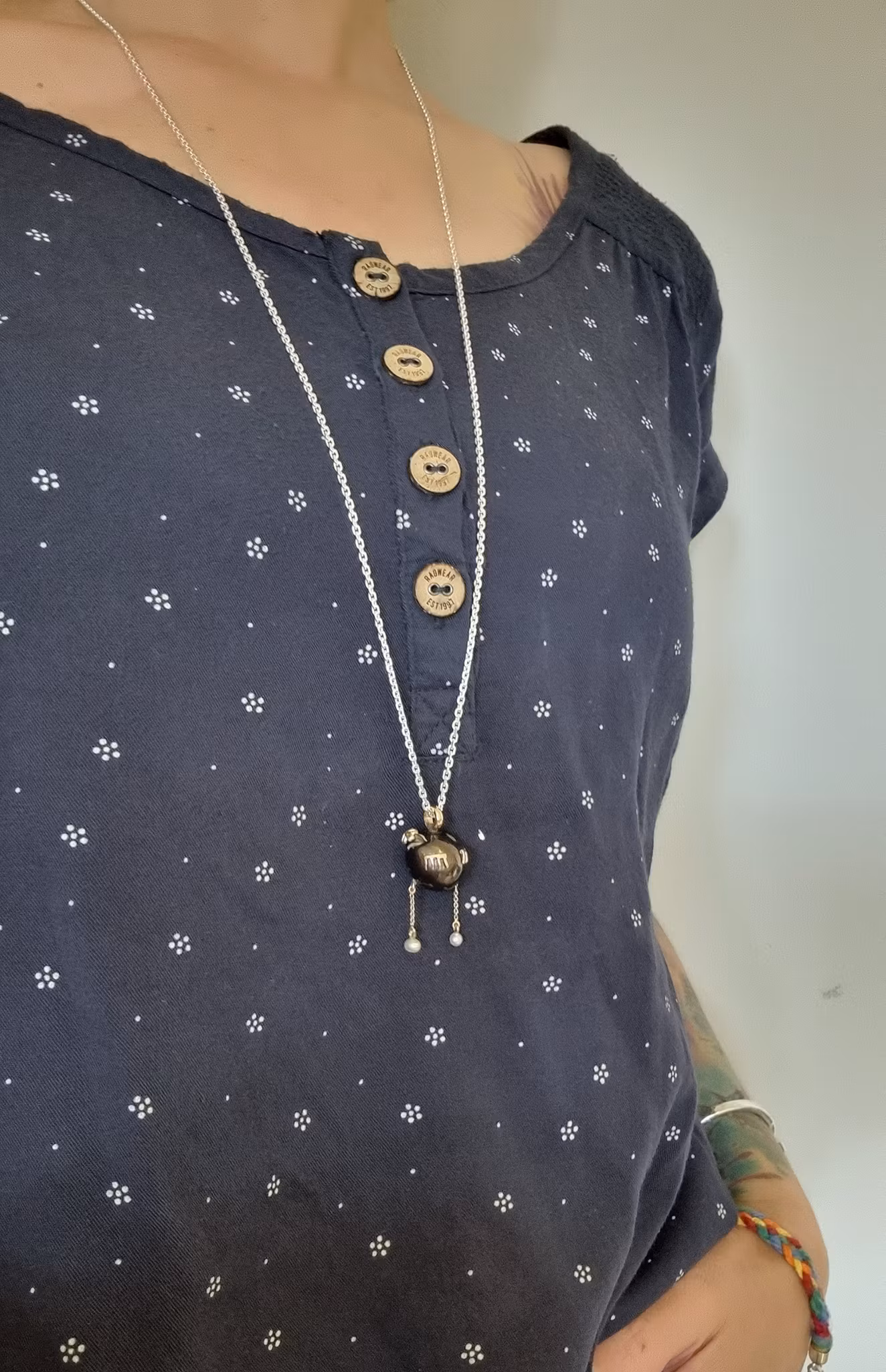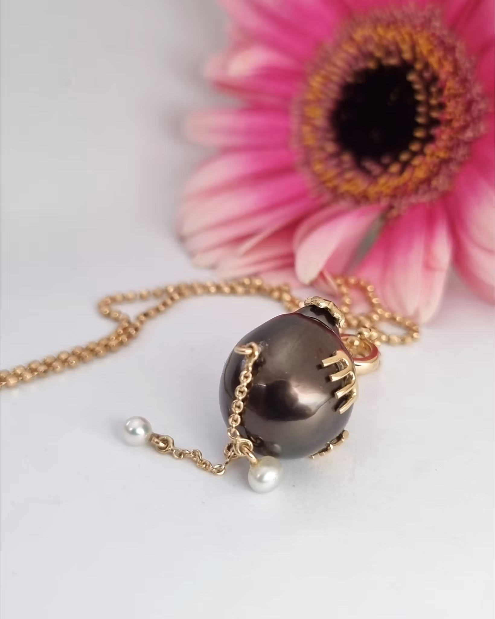 Sovande nalle med handgjorda detaljer i återvunnet 18K guld. Den har tunga ögonfransar, en liten blomma på örat och små pärlor till fötter. Pärlan är djupt chokladbrun och barock i formen, dvs unik i sitt slag. Bruna Tahitipärlor är oerhört sällsynt så den här godingen är inte bara rolig i formen utan även mycket ovanlig i färgen, med en riktigt djup härlig lyster. Certifikat på pärlan ingår.