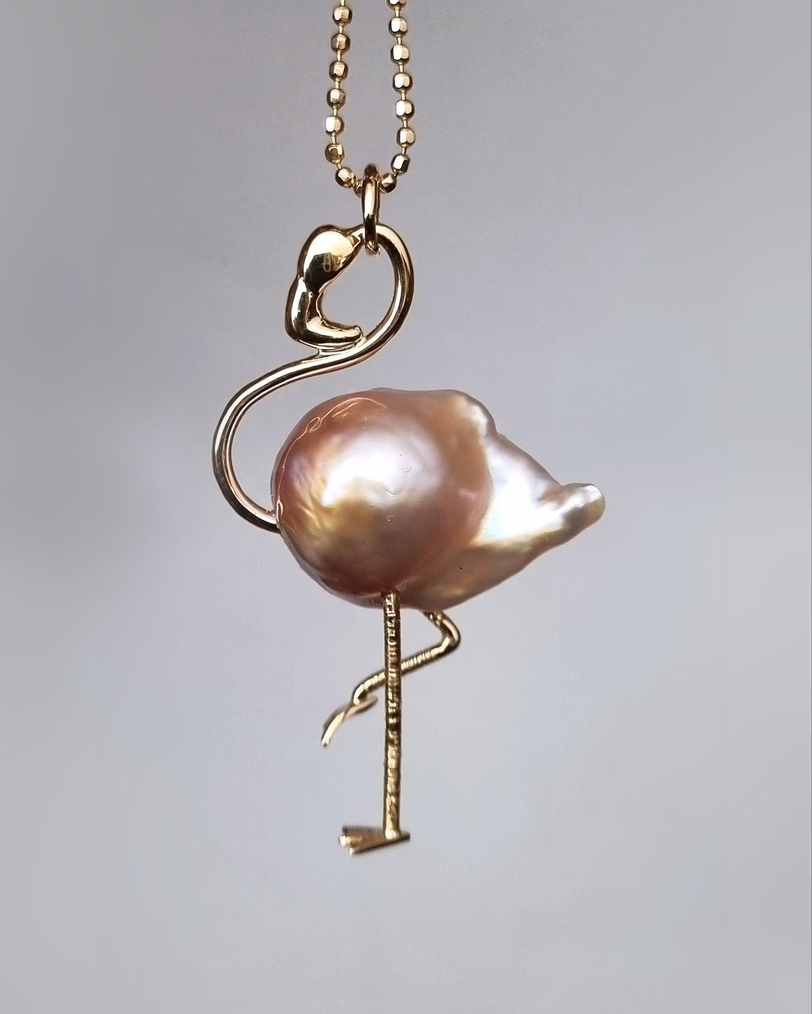 Äkta odlad sötvattenspärla med en annorlunda och unik barock form. Hänget är handgjort i 18K återvunnet guld och har en annorlunda design i form av en Flamingo. En sk 'one of a kind'. För att se processen, kika in på min instagram GeekyGoldsmith.