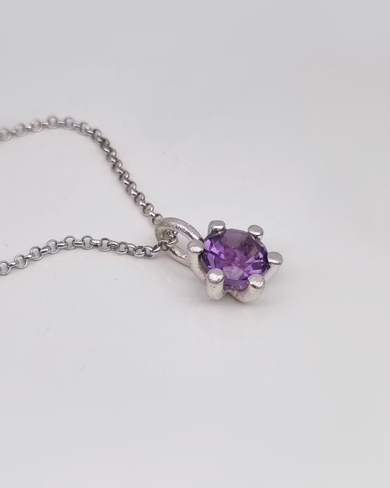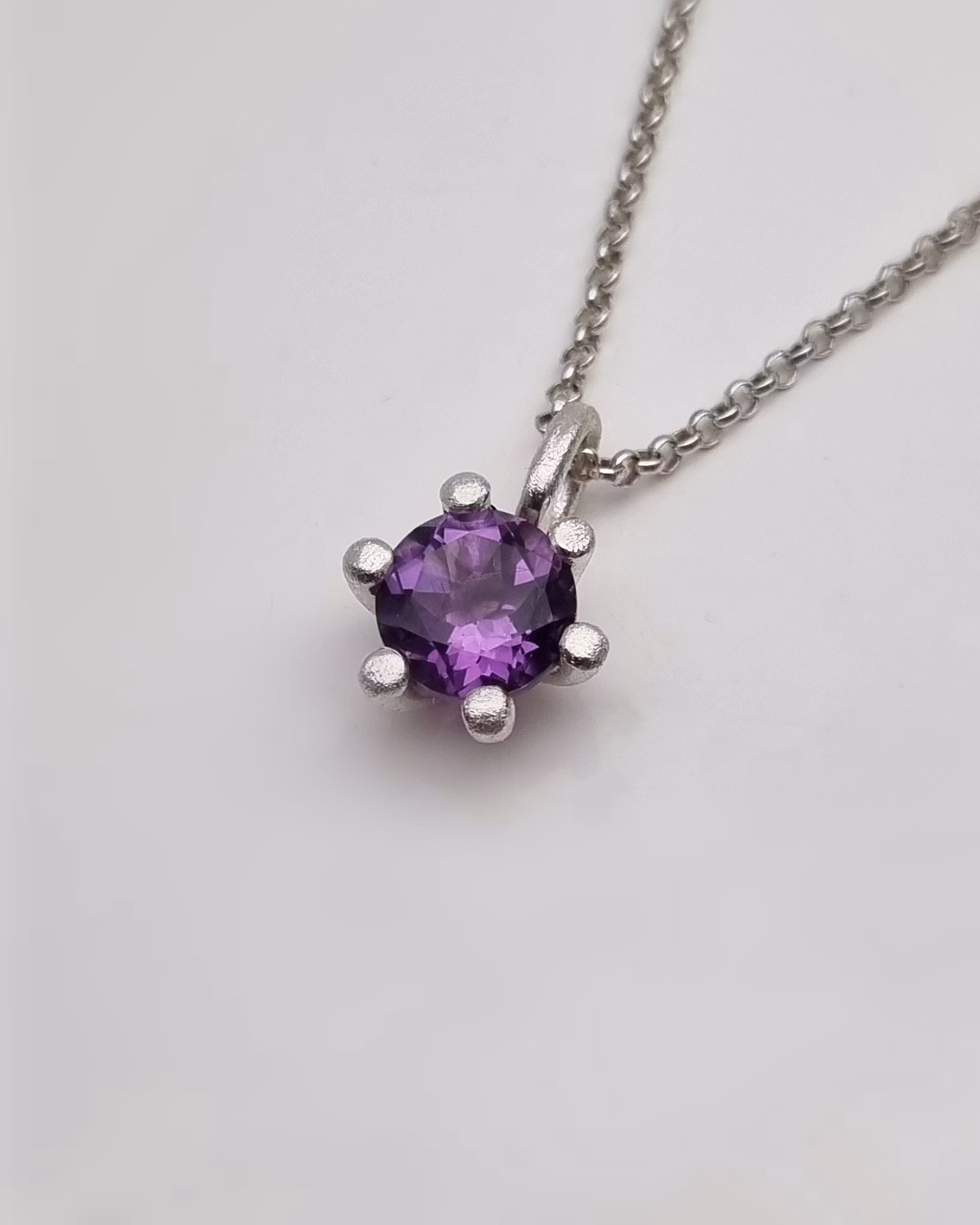 Lila Ametist ca 7 mm Rund facetterad, fattad I sex st runda klor. Ytan är lätt mattslagen och ger en frostig look. Kedja köpes separat.