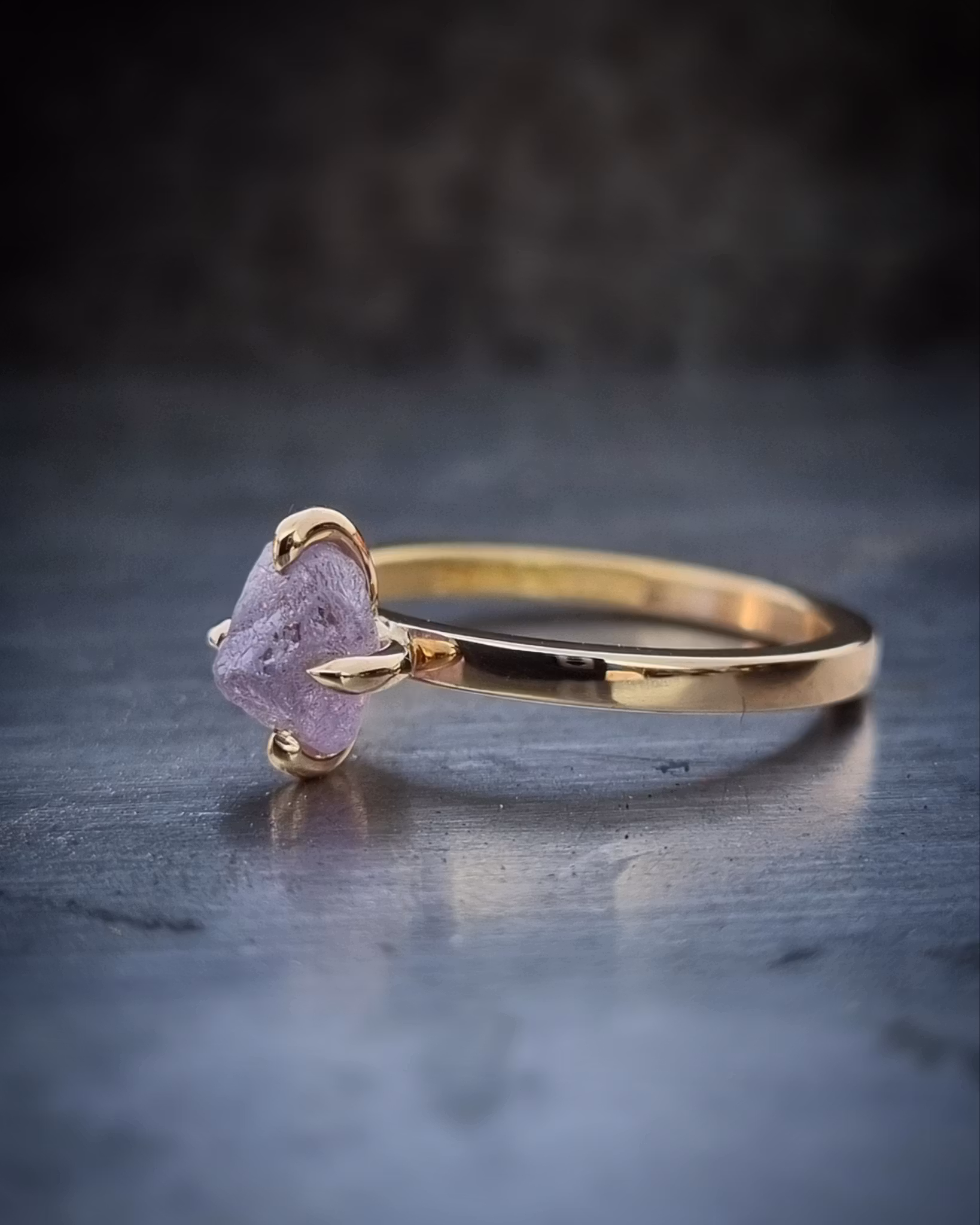 Handgjord ring i 18K återvunnet guld med en lilarosa Råsafir på 1,72 carat. Safiren är fattad i fyra kraftiga klor uppepå skenan. Detta innebär att den går fint att bära ihop med t ex en till solitär, en slät ring eller en alliansring utan glipa, sk 'stackring'.