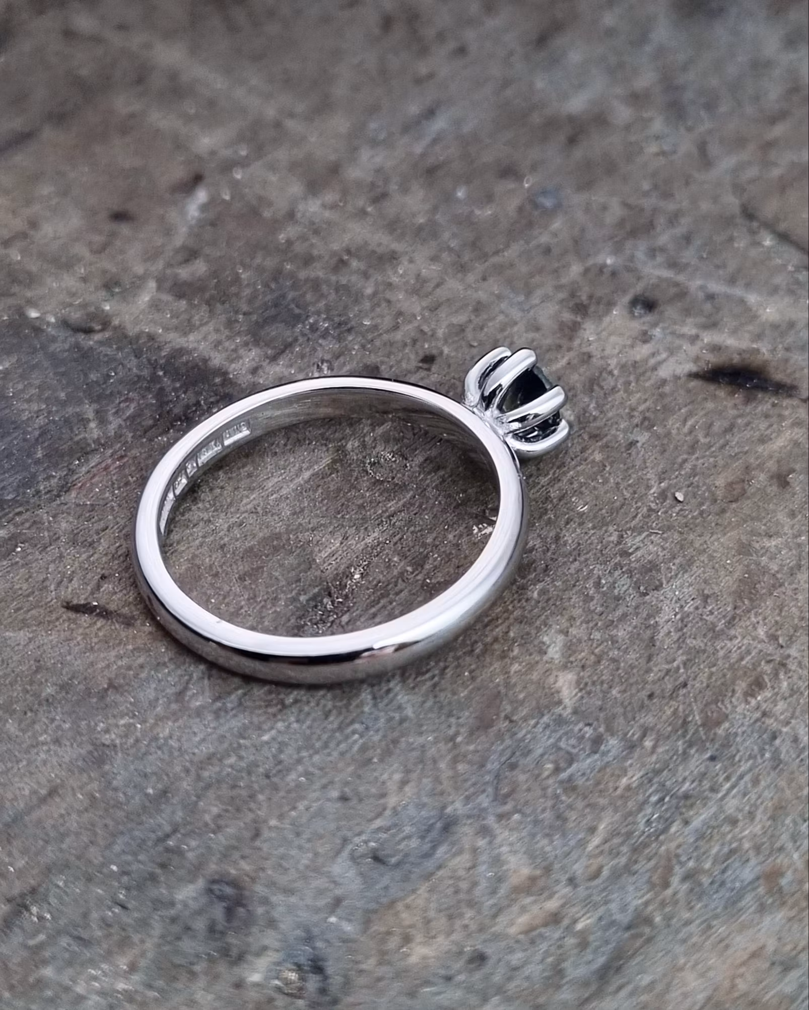 Handgjord i 18k återvunnet vitguld och safiren mäter 4,6 mm i diameter. Bredd på ringskenan ca 2,5 mm.