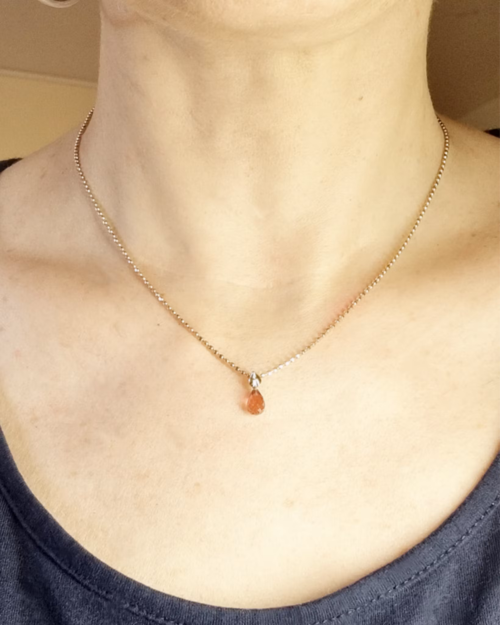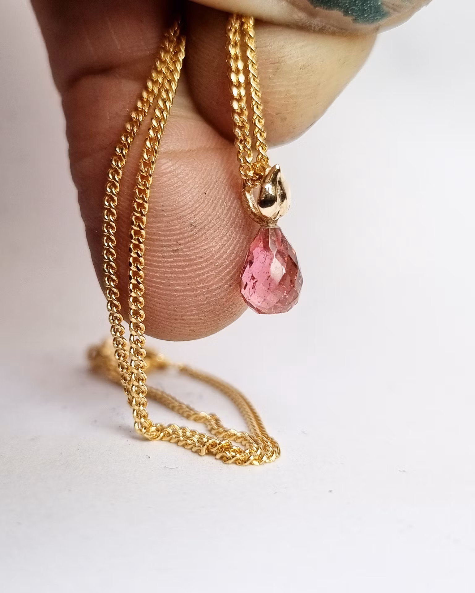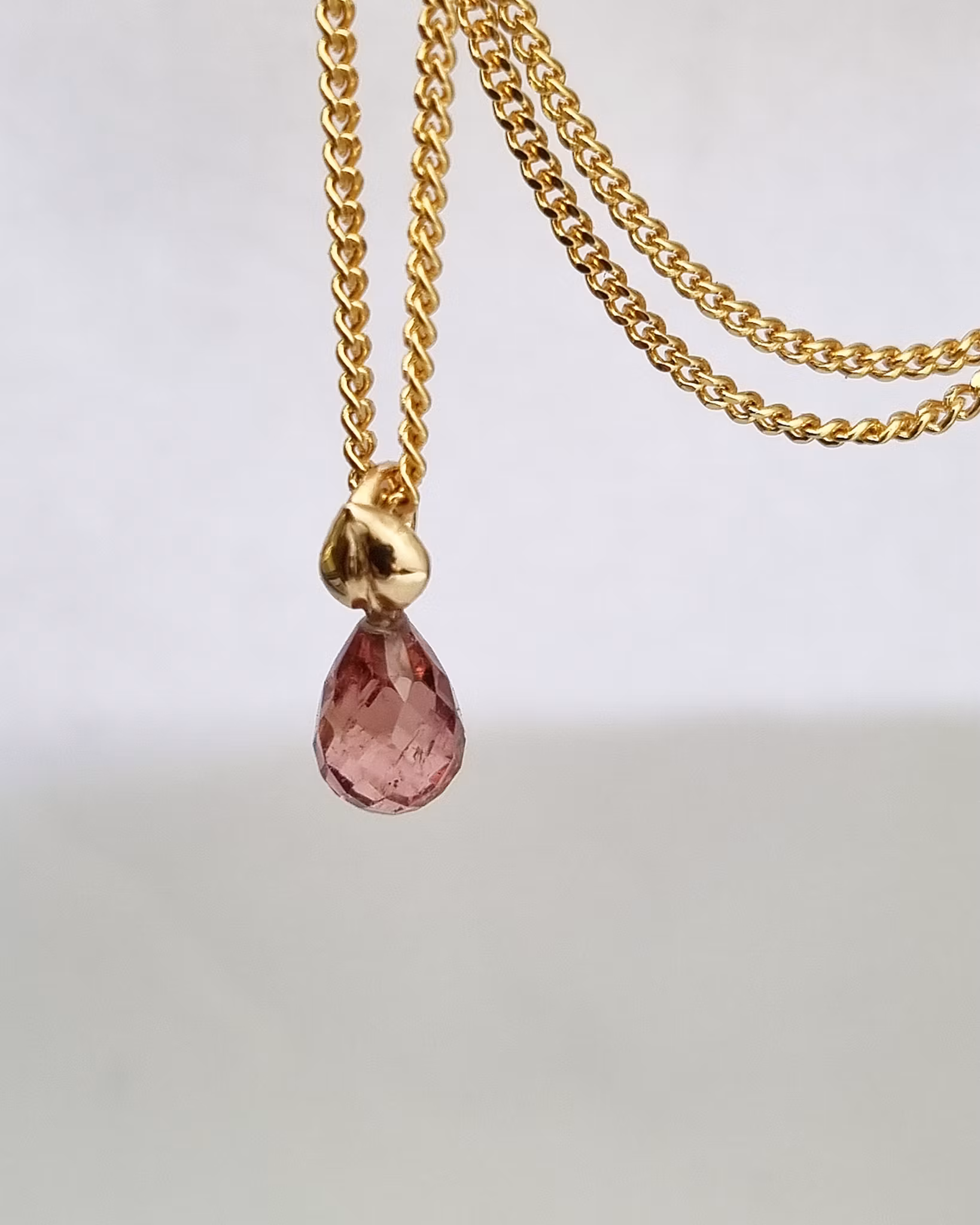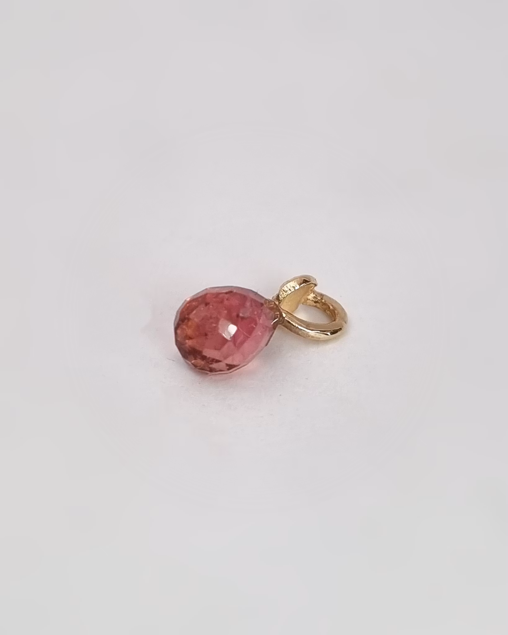 Helt underbar liten rosa Turmalindroppe, endast 7 x 5 mm. Den har ett litet handgjort löv som ögla, och det är gjort i 18 K återvunnet guld.