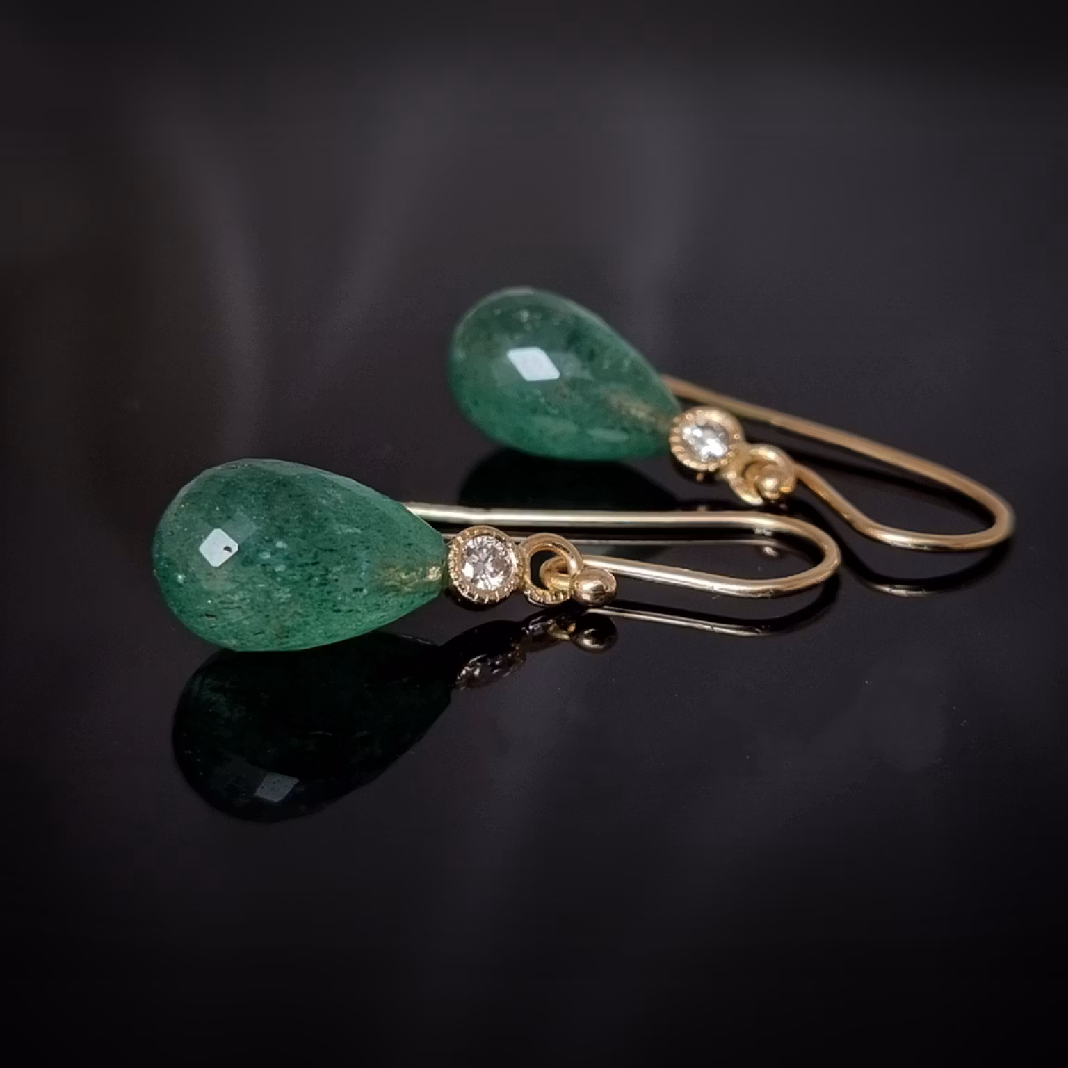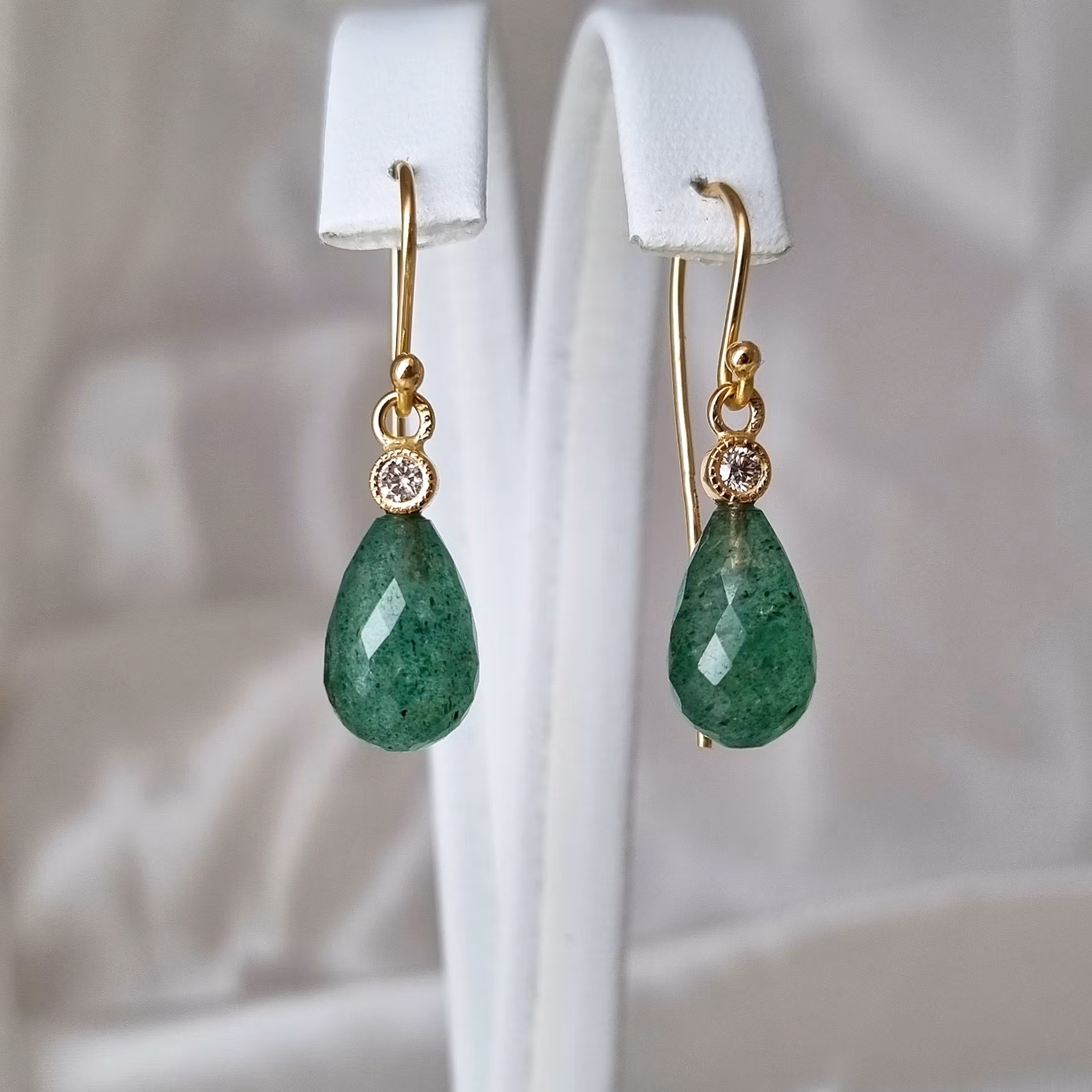 Skogsgröna Aventuriner toppade med champagnebriljaneter. Handgjorda örhängen i 18 K återvunnet guld. Briljanterna är storlek 0,05 ct/st och kantade med miligrif. Brioletterna mäter 7,85 x 12 mm och örhänget är ca 30 mm långt inkl kroken.