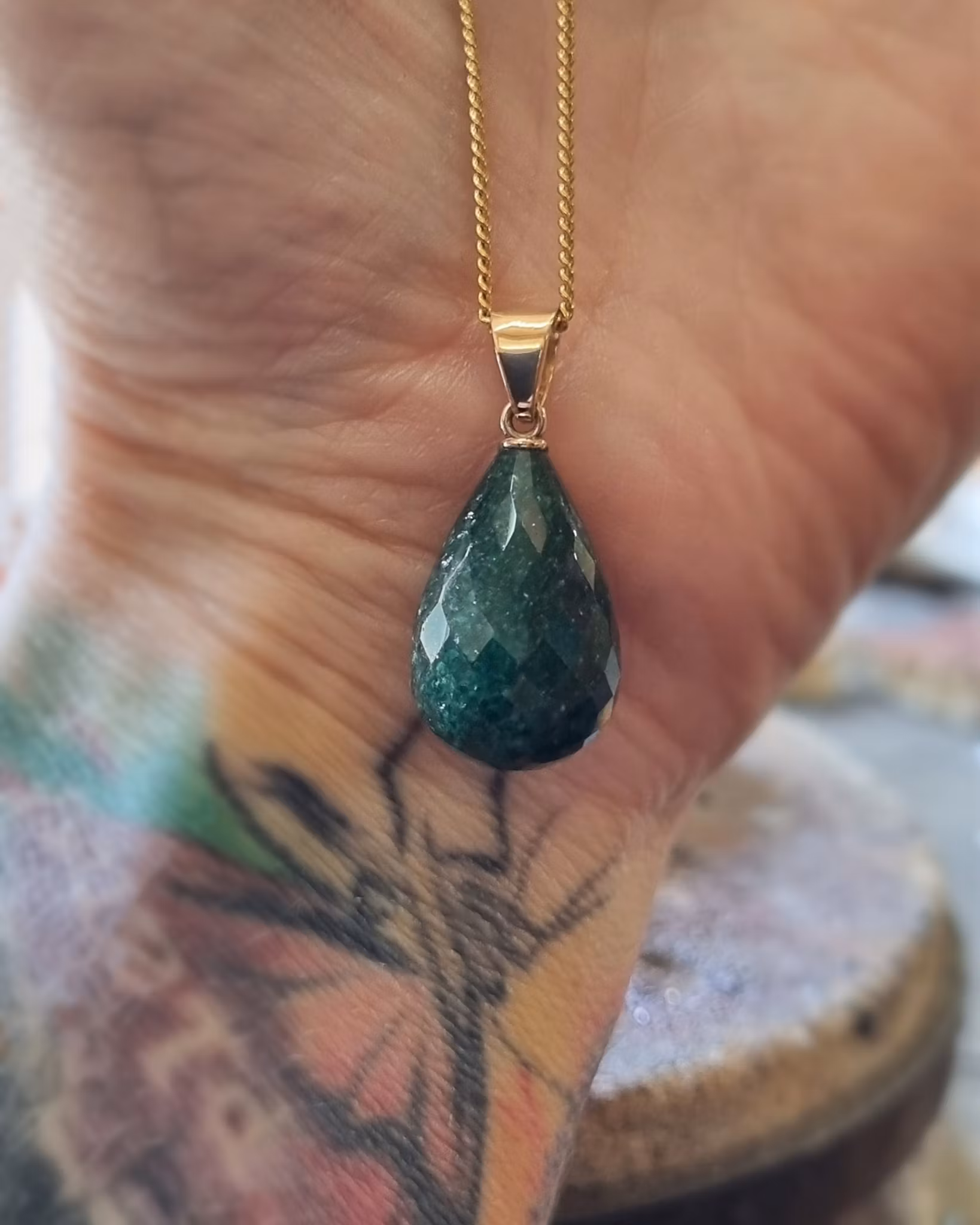 En stor skogsgrön Aventurin, briolettslipad och med en handgjord ögla i 18K återvunnet guld. Den är 'chunky' med lite tyngd och passar fint t ex på en lite längre kedja. Stenen har naturliga inneslutningar som gör den unik och väldigt vacker. Den är mörkt grön och bitvis åt det opaka hållet.