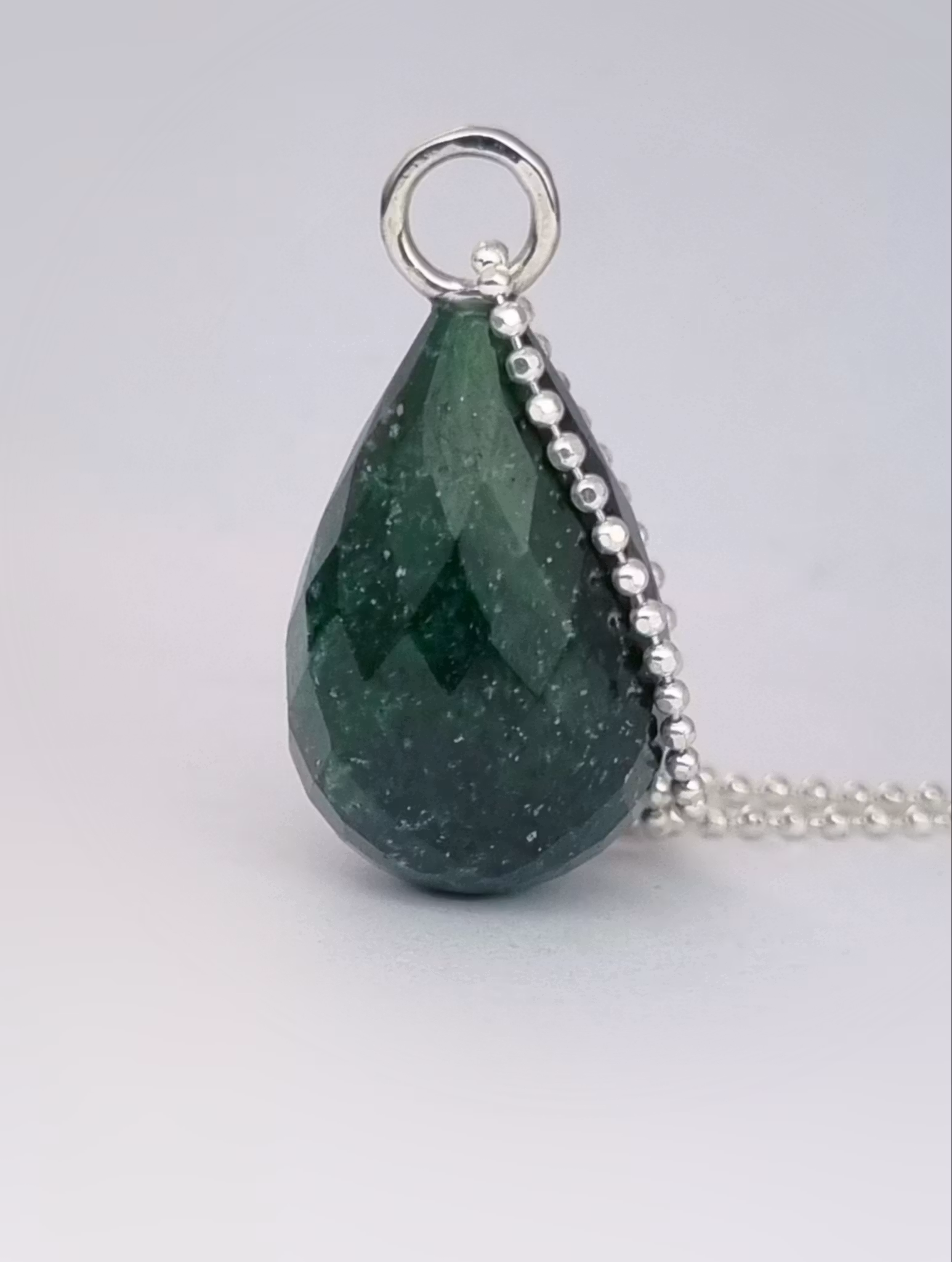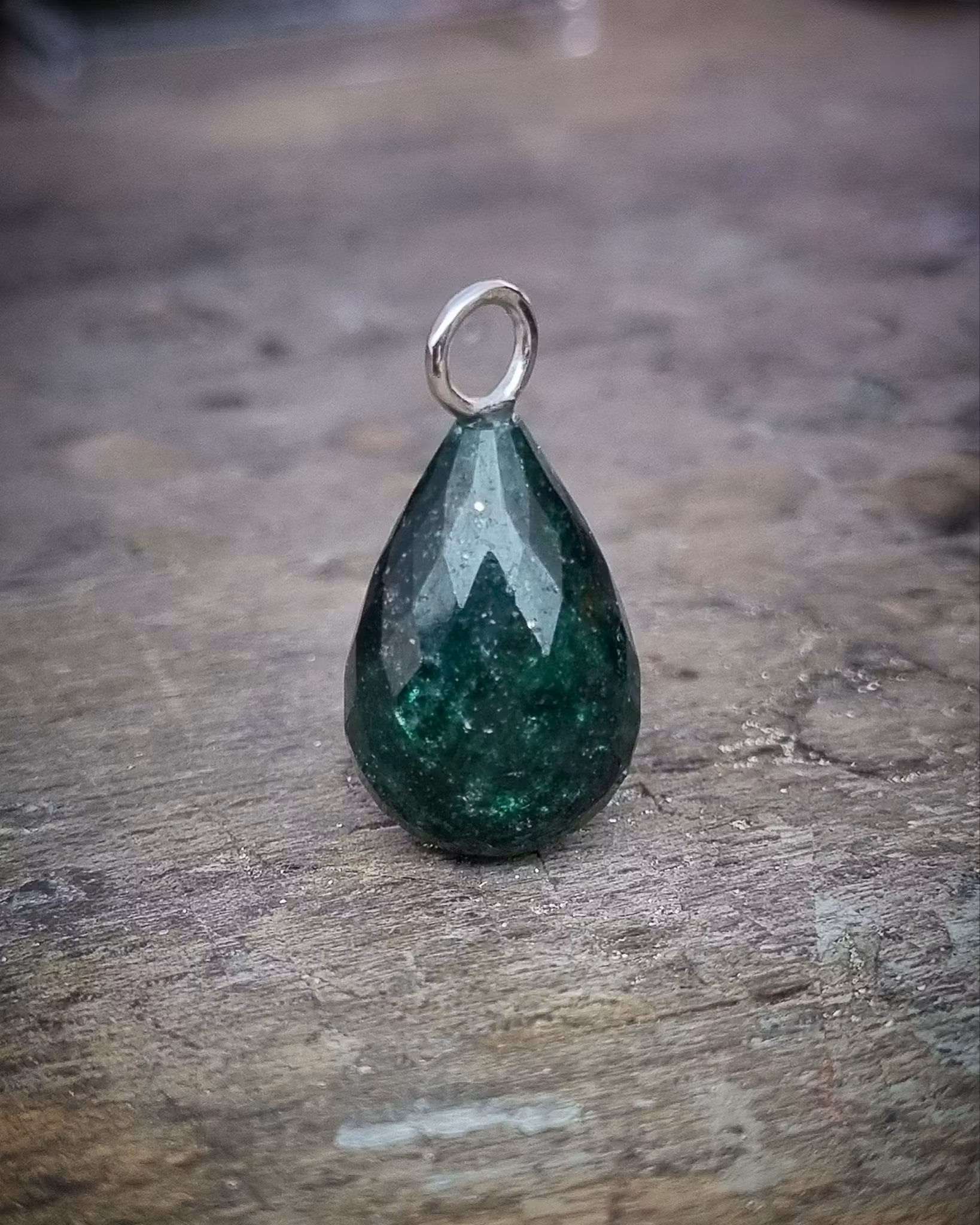 En skogsgrön Aventurin modell stor, briolettslipad och med en enkel handgjord ögla i 18K återvunnet vitguld. Den är riktigt chunky med en fin tyngd och passar fint t ex på en lite längre kedja. Stenen har naturliga inneslutningar som gör den unik och väldigt vacker.