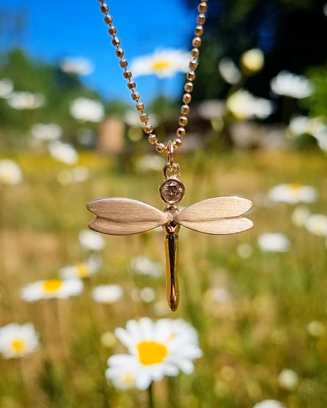 Slända i 18K återvunnet guld med en 0,17 carats coffeebriljant som huvud. Måtten på denna härliga Trollsländan är ca 30 x 28 mm och den har sidenmatta vingar med en blank kropp.